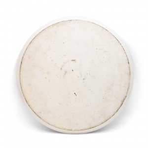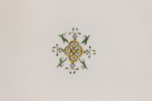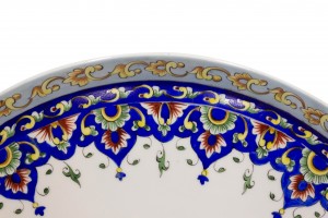 French Victorian porcelain charger with yellow decorated rim and blue scalloped design with flowers on border.