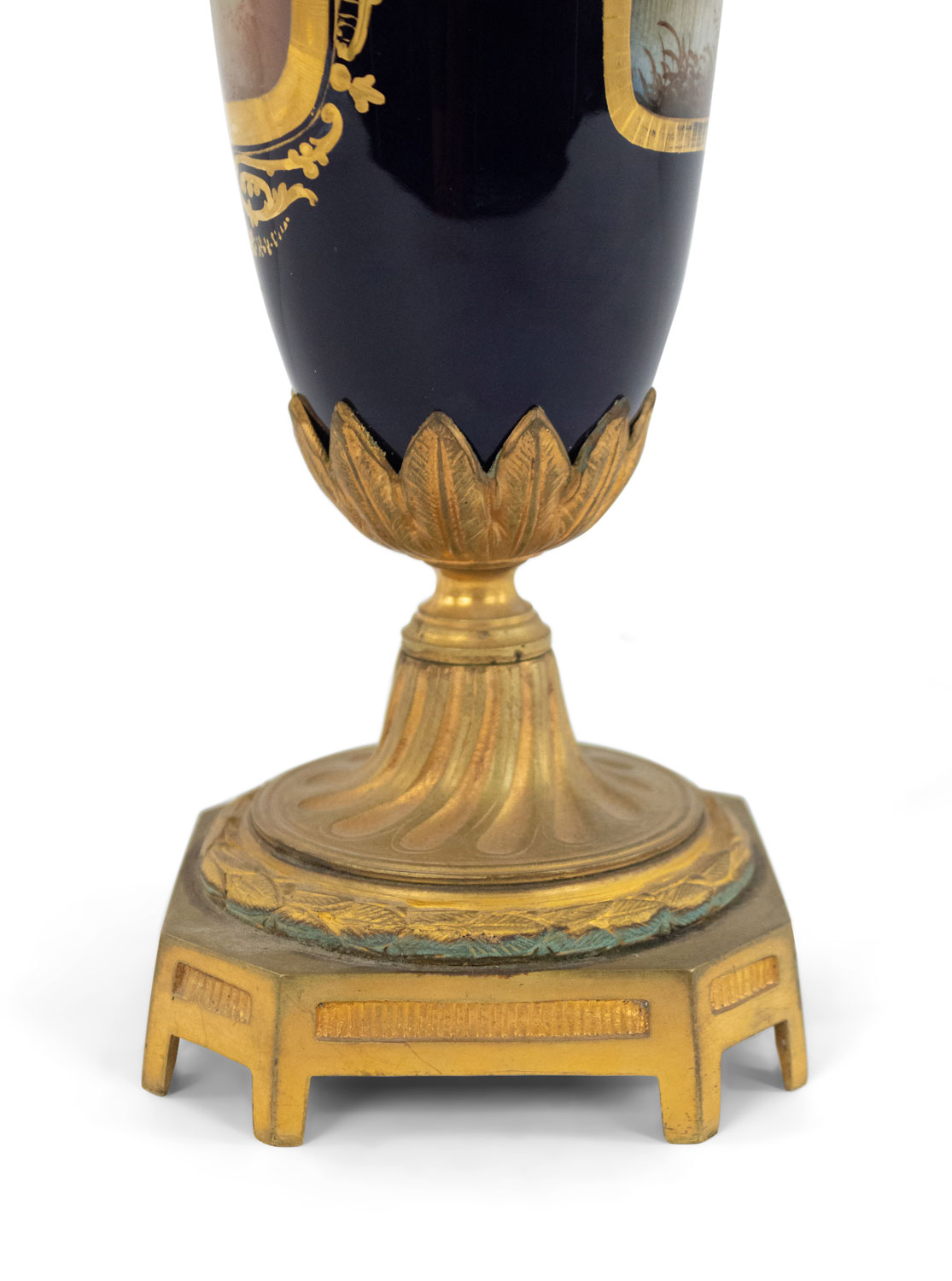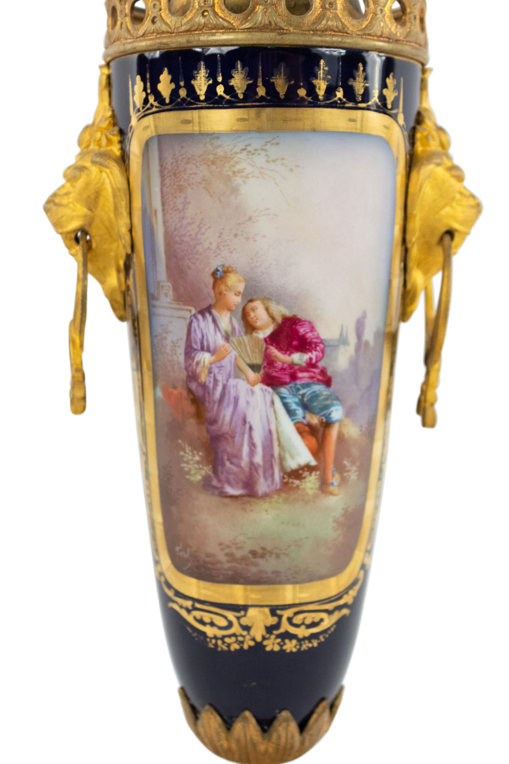 French Victorian blue Sevres porcelain table lamp with figures of man and woman and bronze dore base and lion head handles.