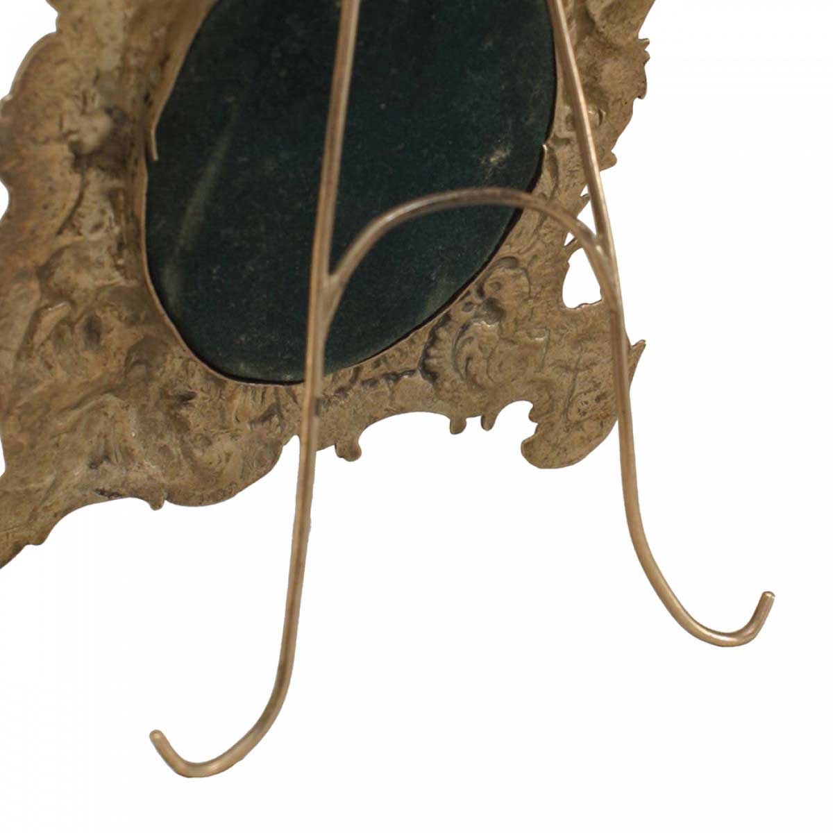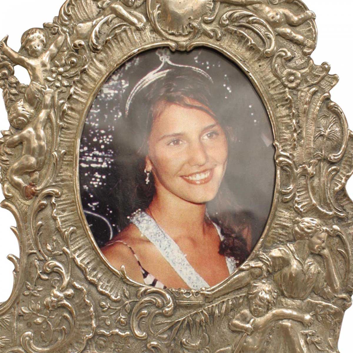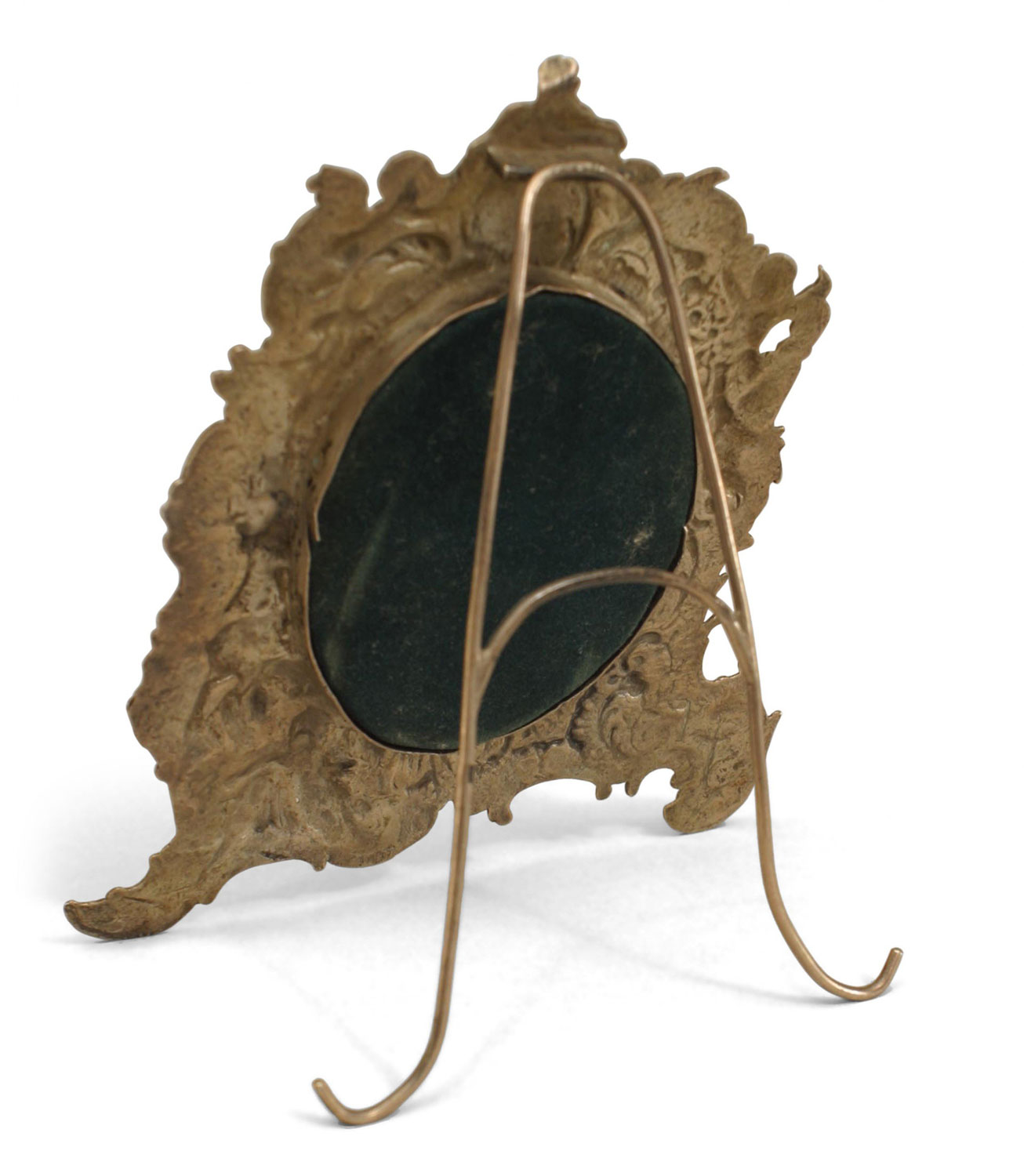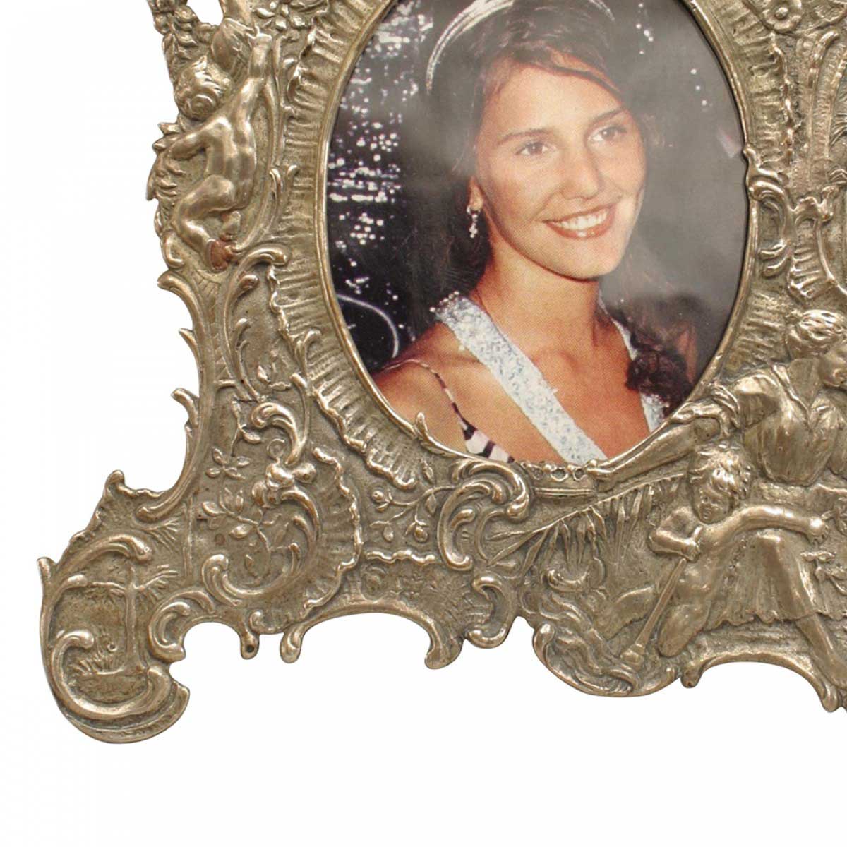 French Victorian sterling silver easel picture frame with embossed cupids and scroll design.