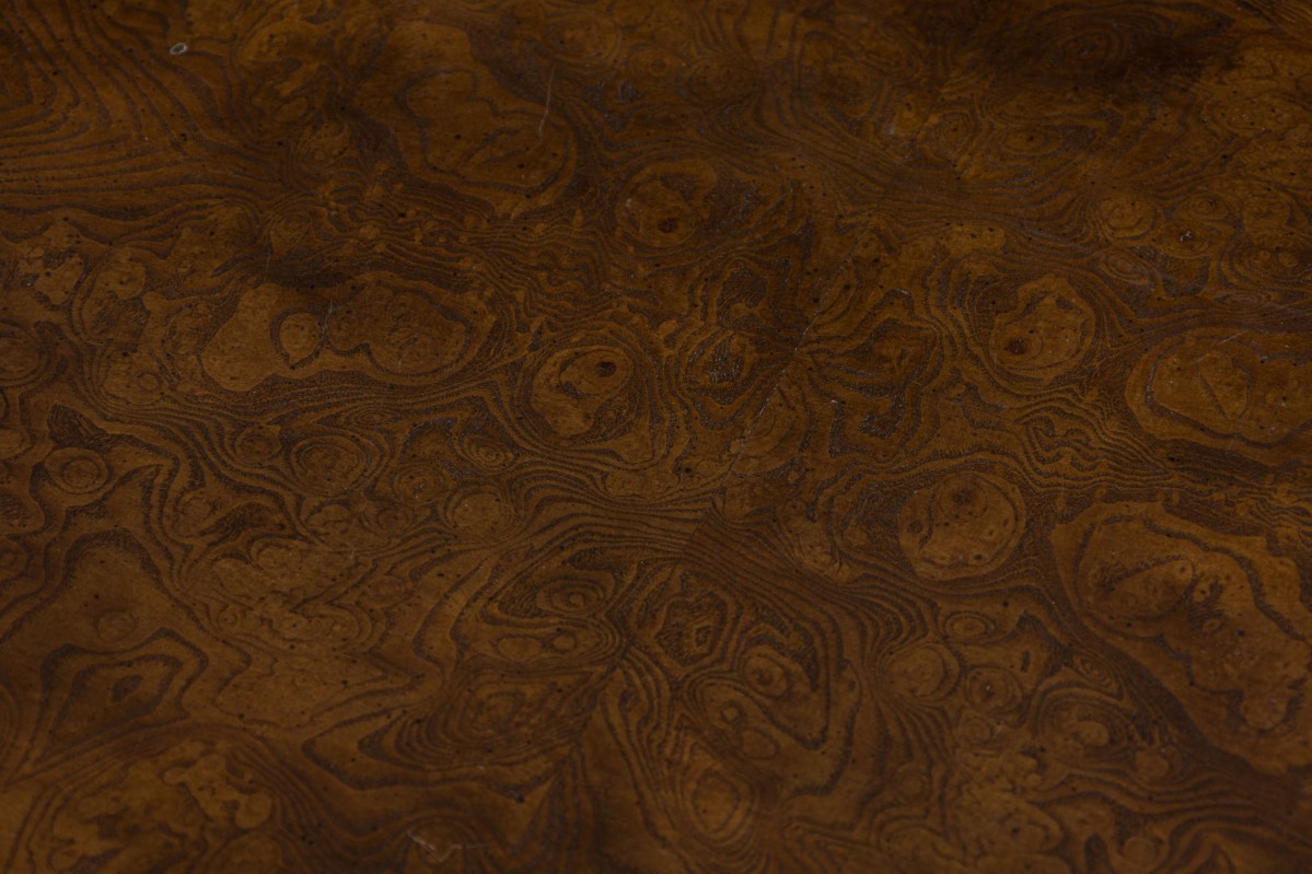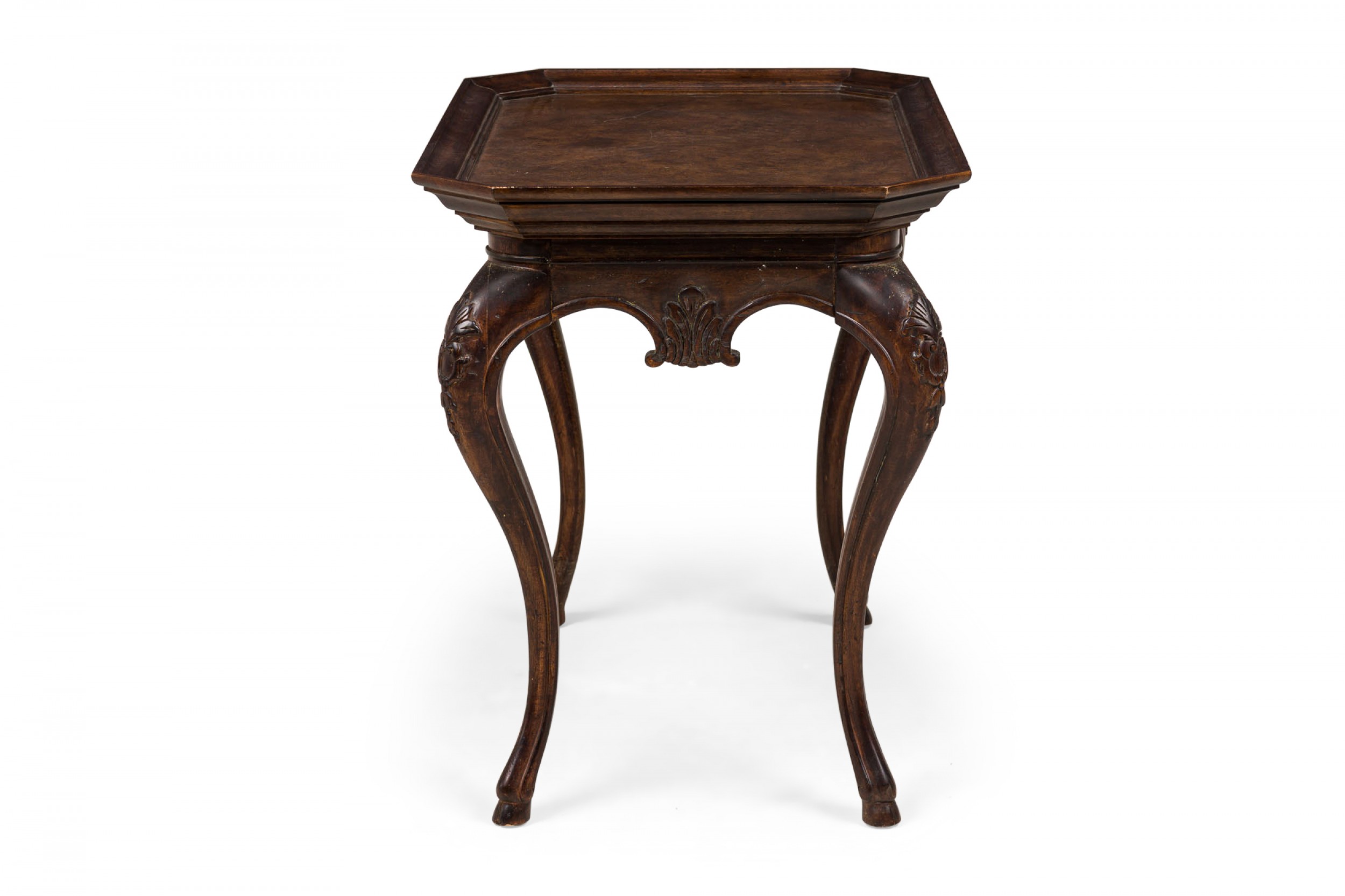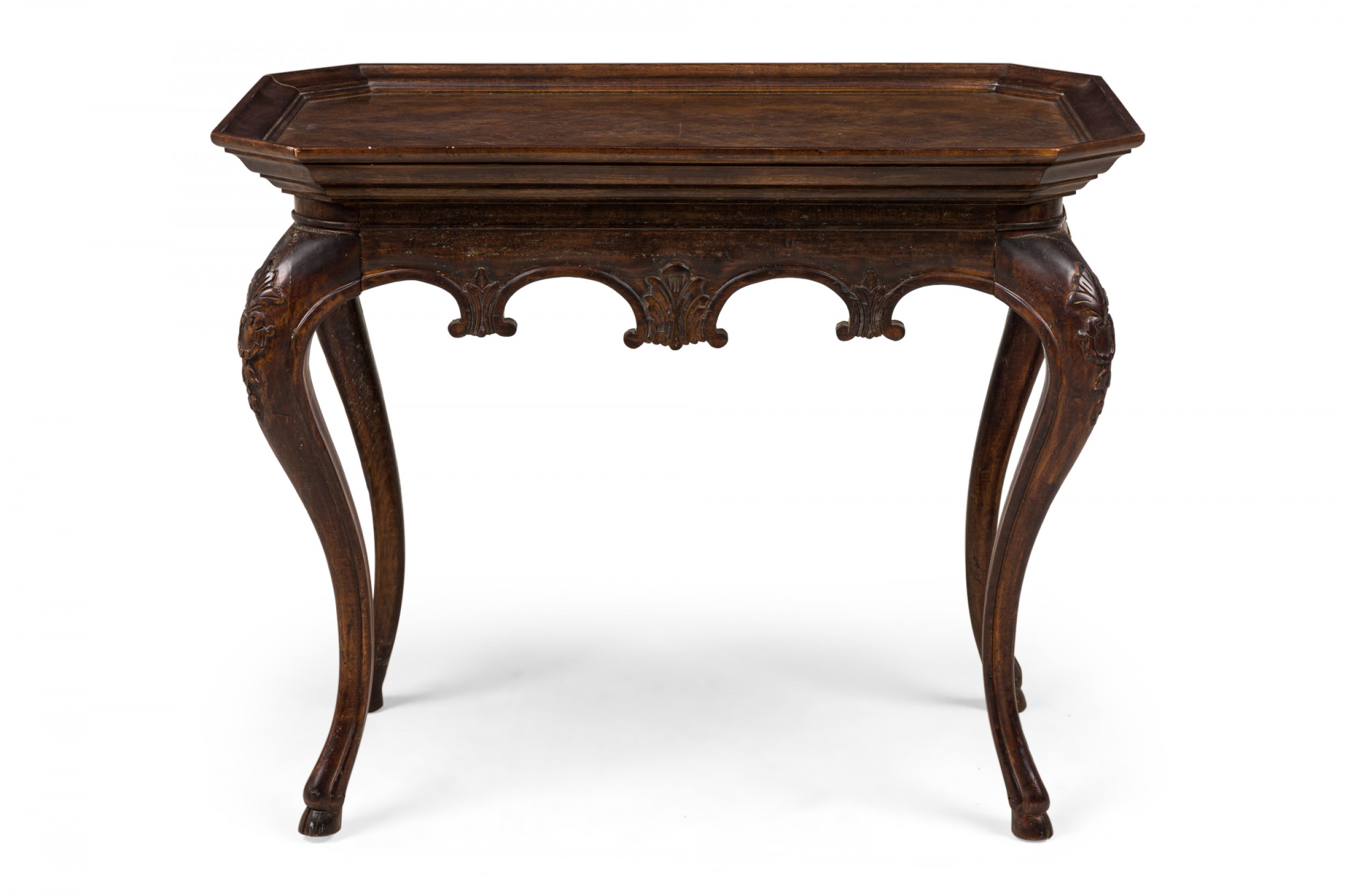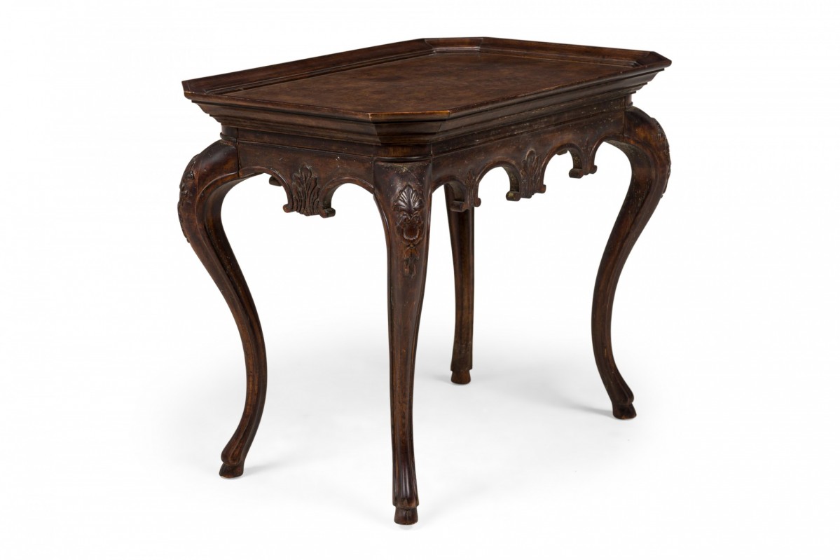 French Victorian-Style rectangular console / occasional table with an angled shallow beveled gallery around a marble veneer table top with canted corners, with carved apron and embellishments at the top curvature of the four cabriole legs.