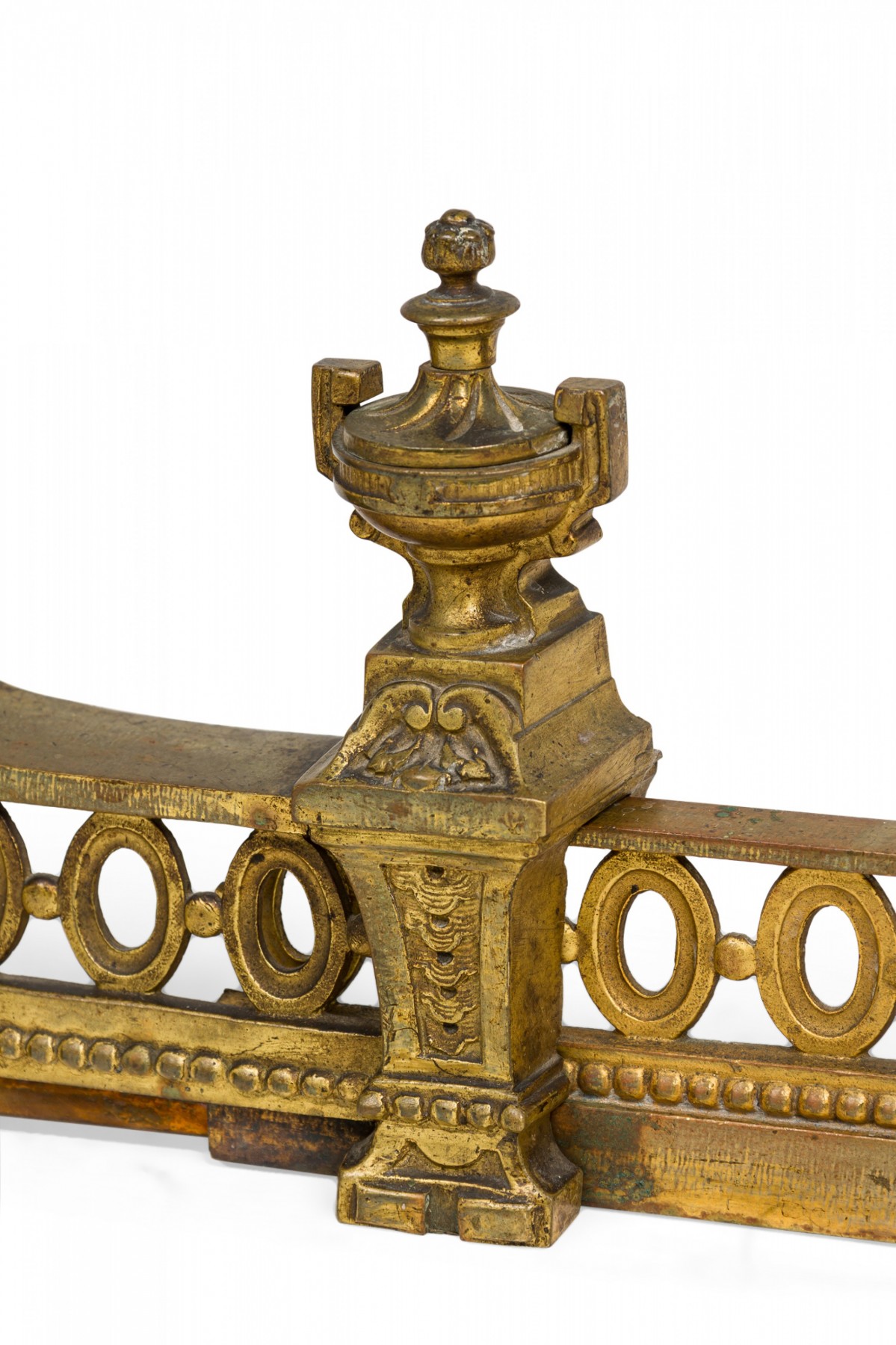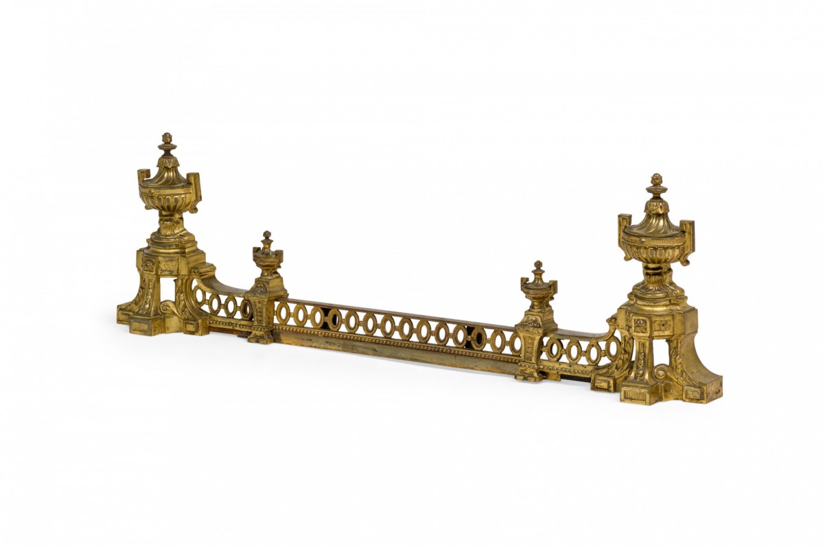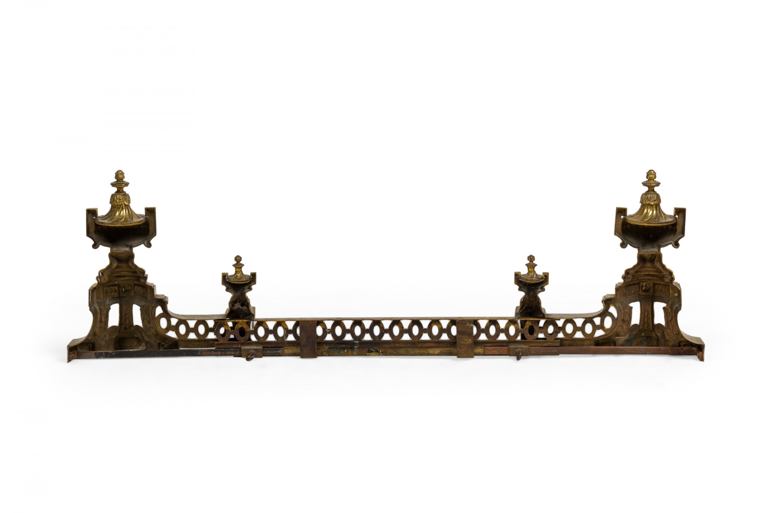 French Victorian style gilt bronze fireplace fender with extending pierced connecting gallery and faux urns atop tripod scroll & foliate pedestals.