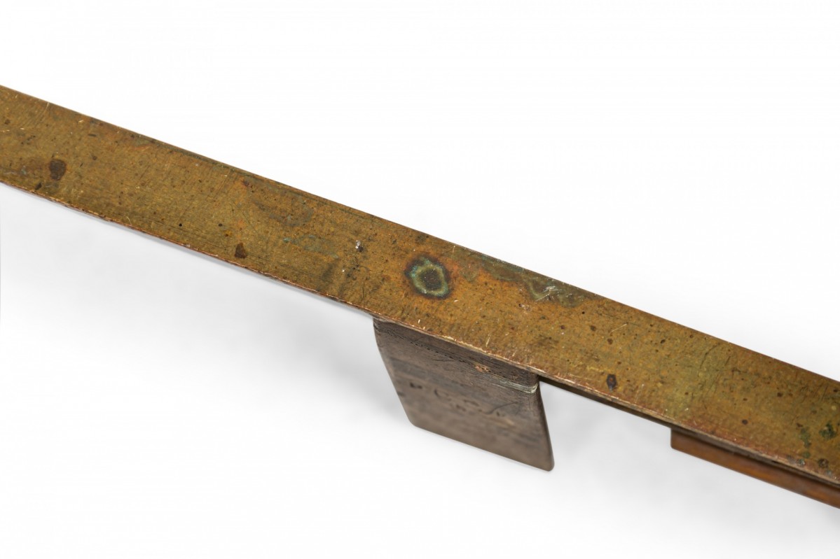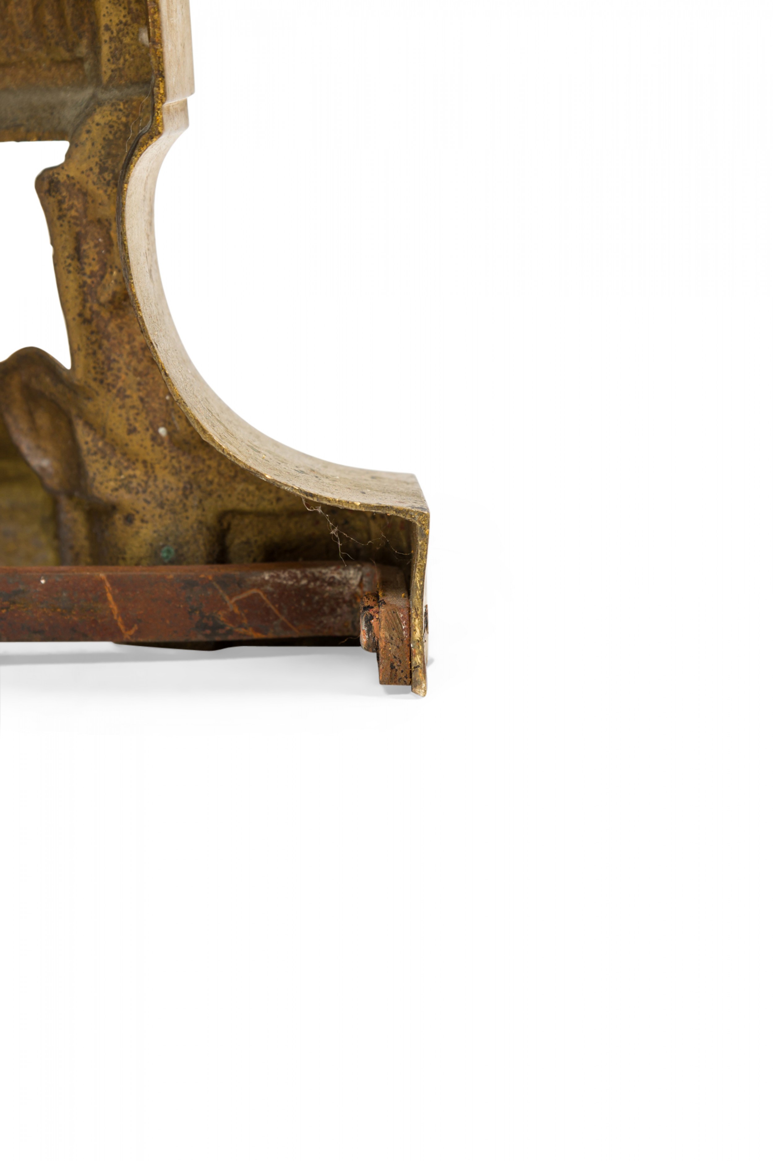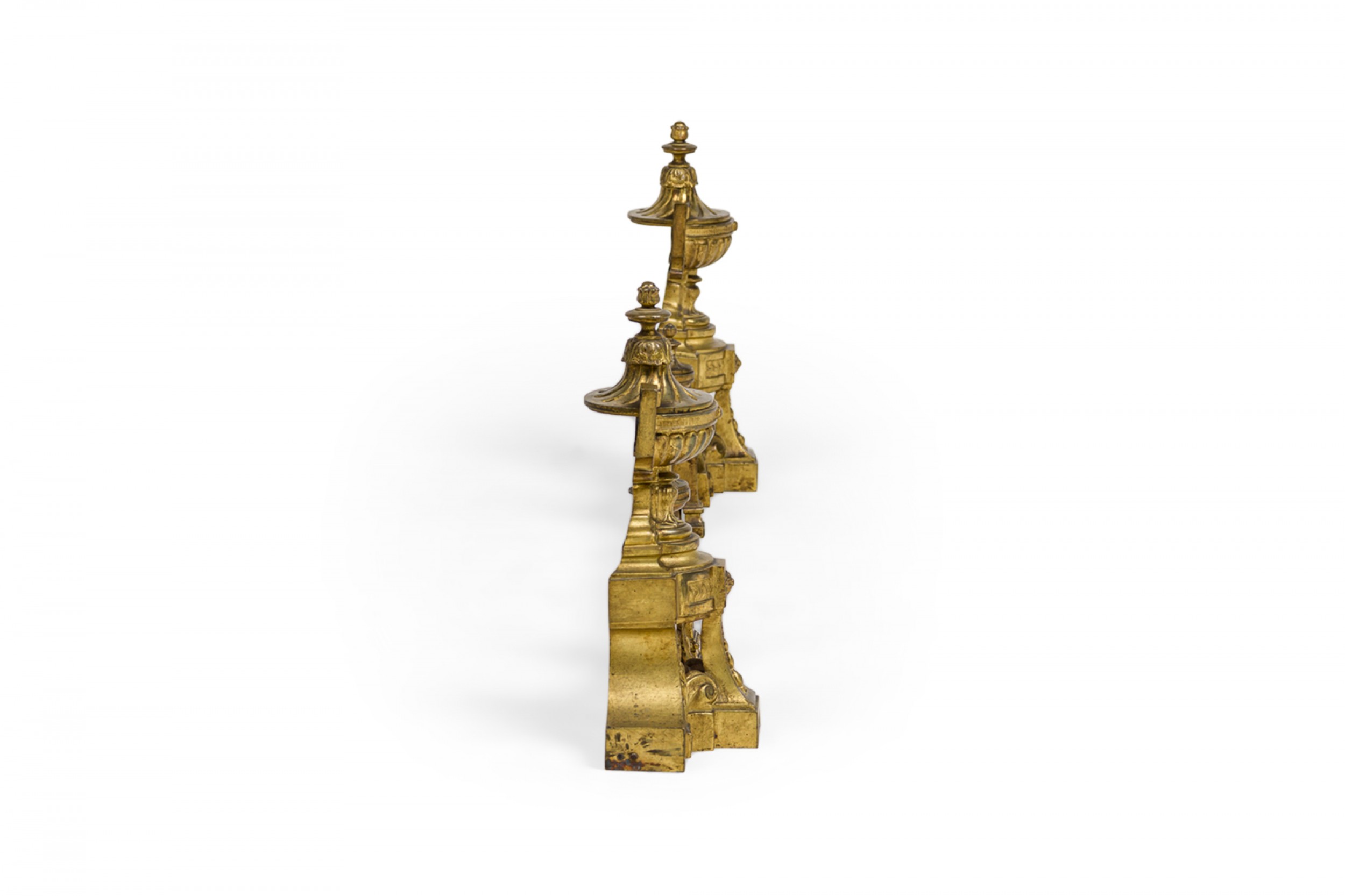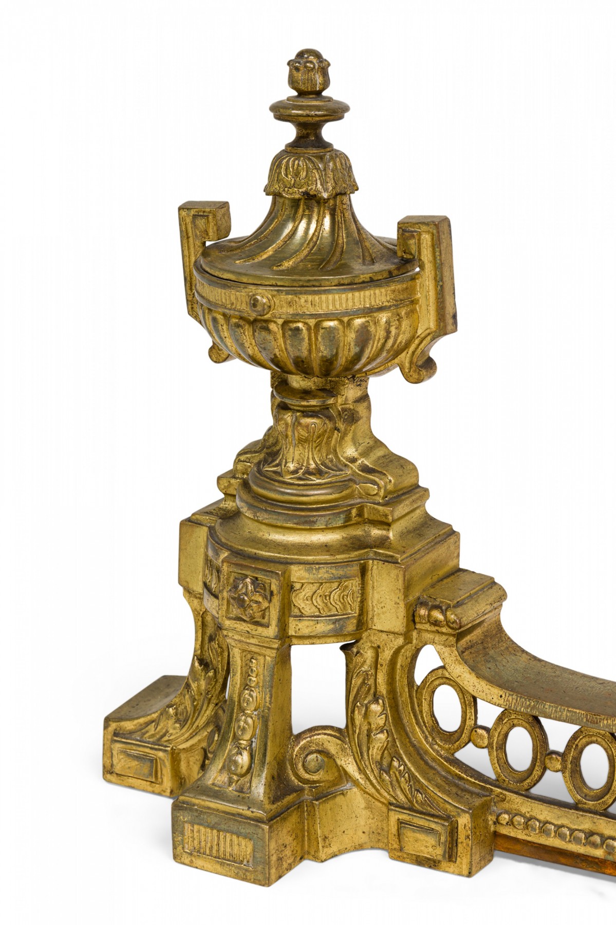 French Victorian style gilt bronze fireplace fender with extending pierced connecting gallery and faux urns atop tripod scroll & foliate pedestals.