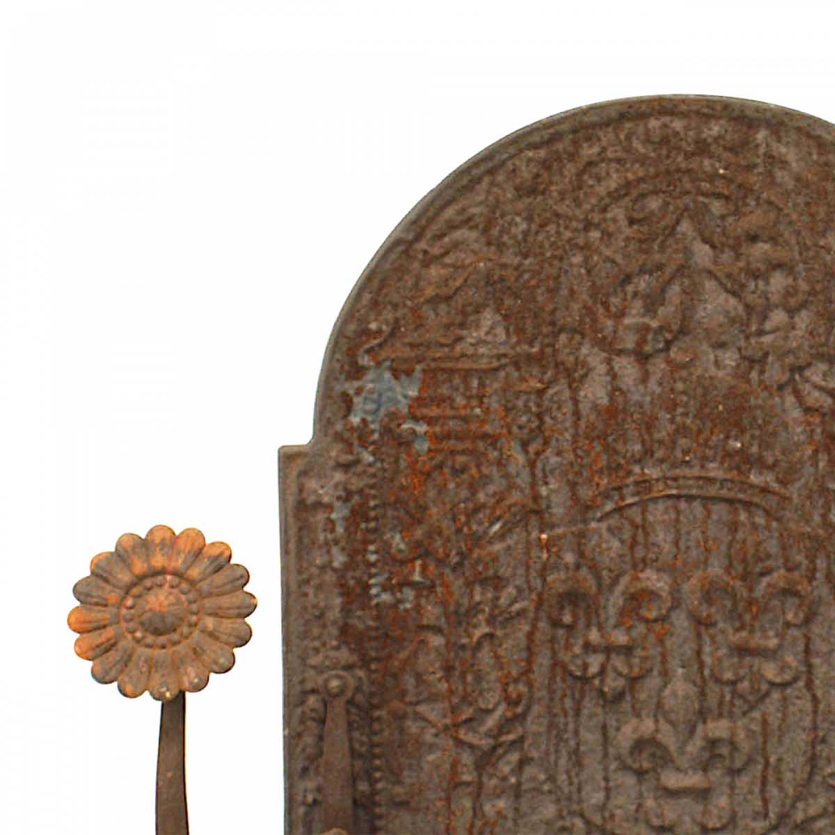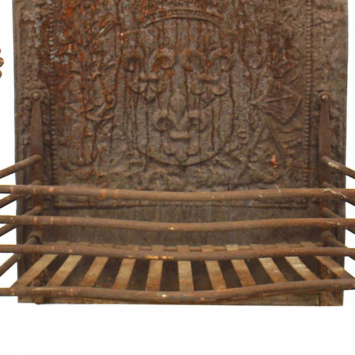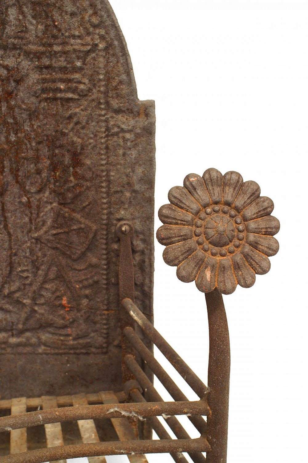 French Victorian wrought iron fire grate with arch design backing with fleur de lis design and sun flower finials on front.