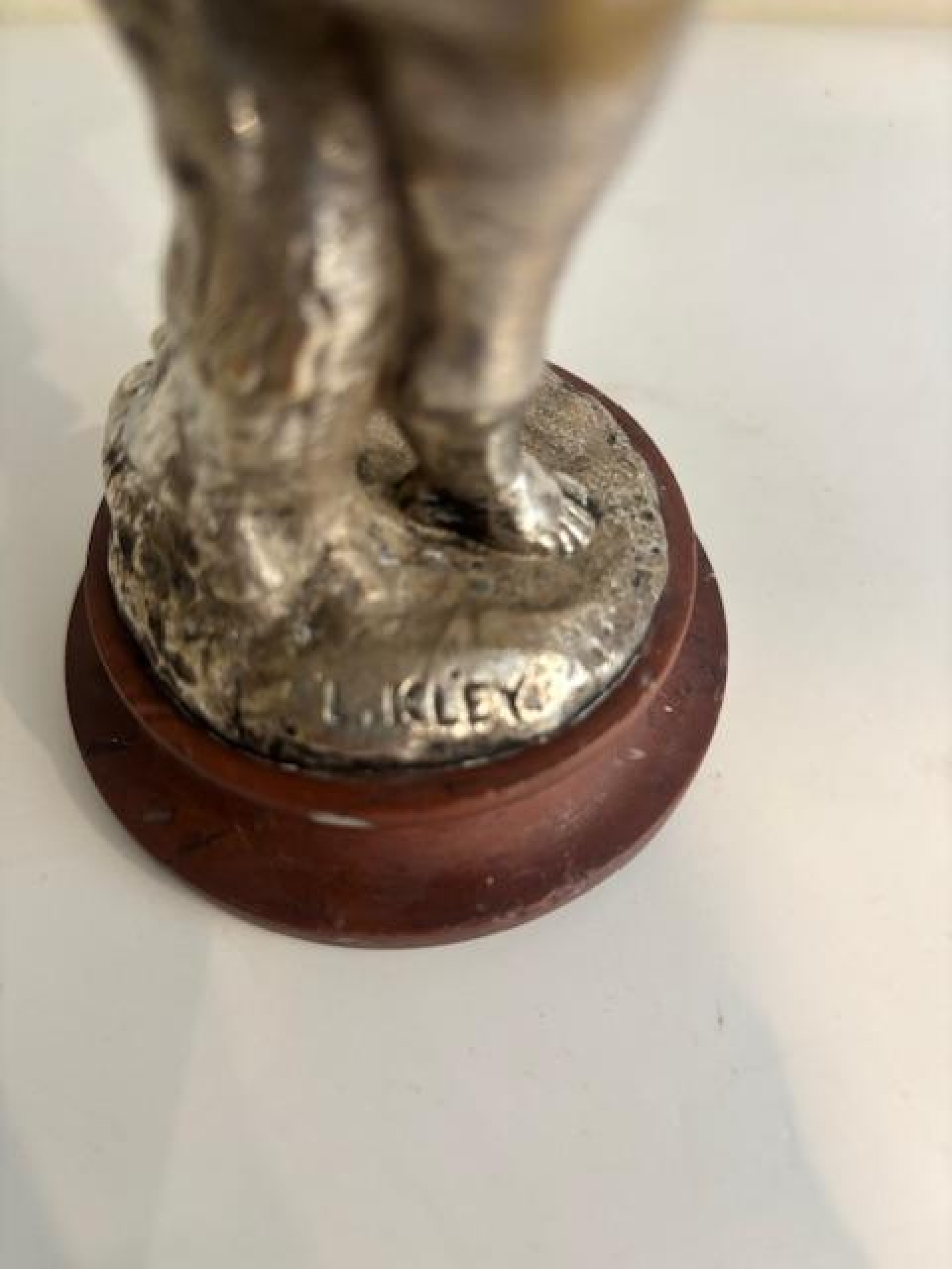 French Victorian small sllver-plate bronze cupid standing next to a tree stump holding an urn on a round rouge marble base (signed: L. KLEY)