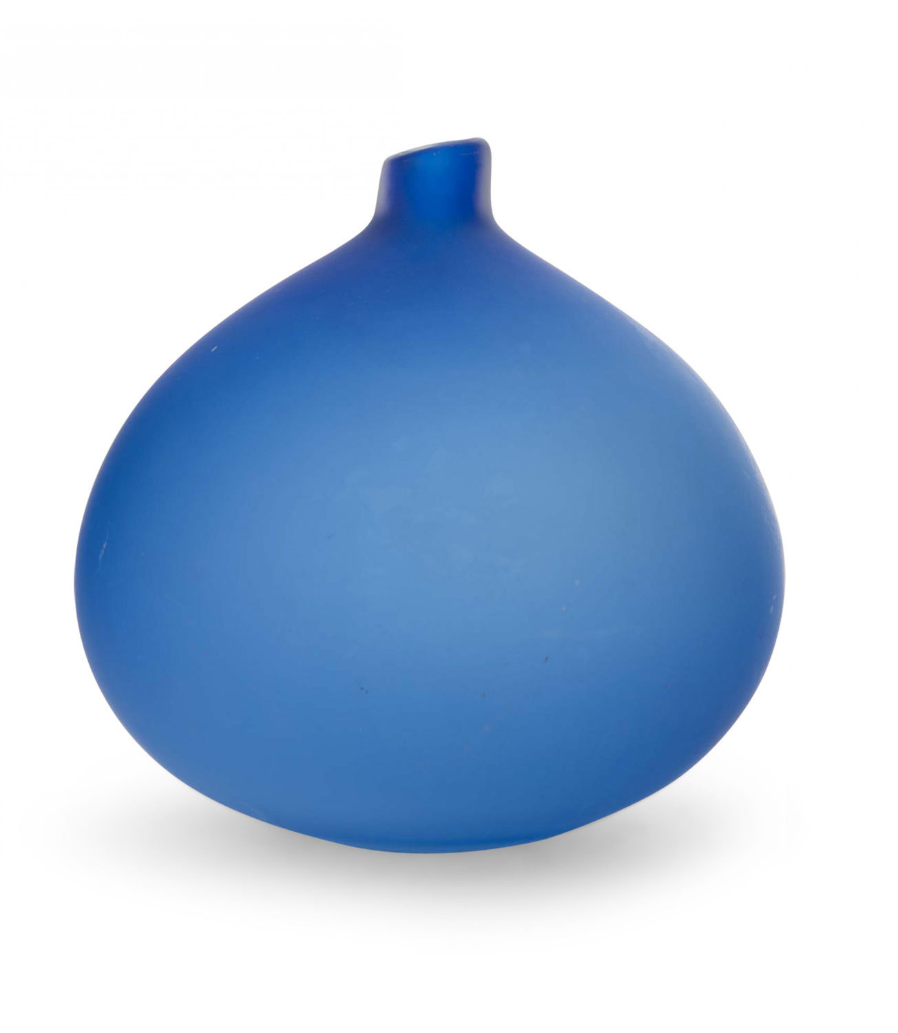 Bulbous-shaped blue tinted frosted glass bud vase with a short neck and a diagonal opening
