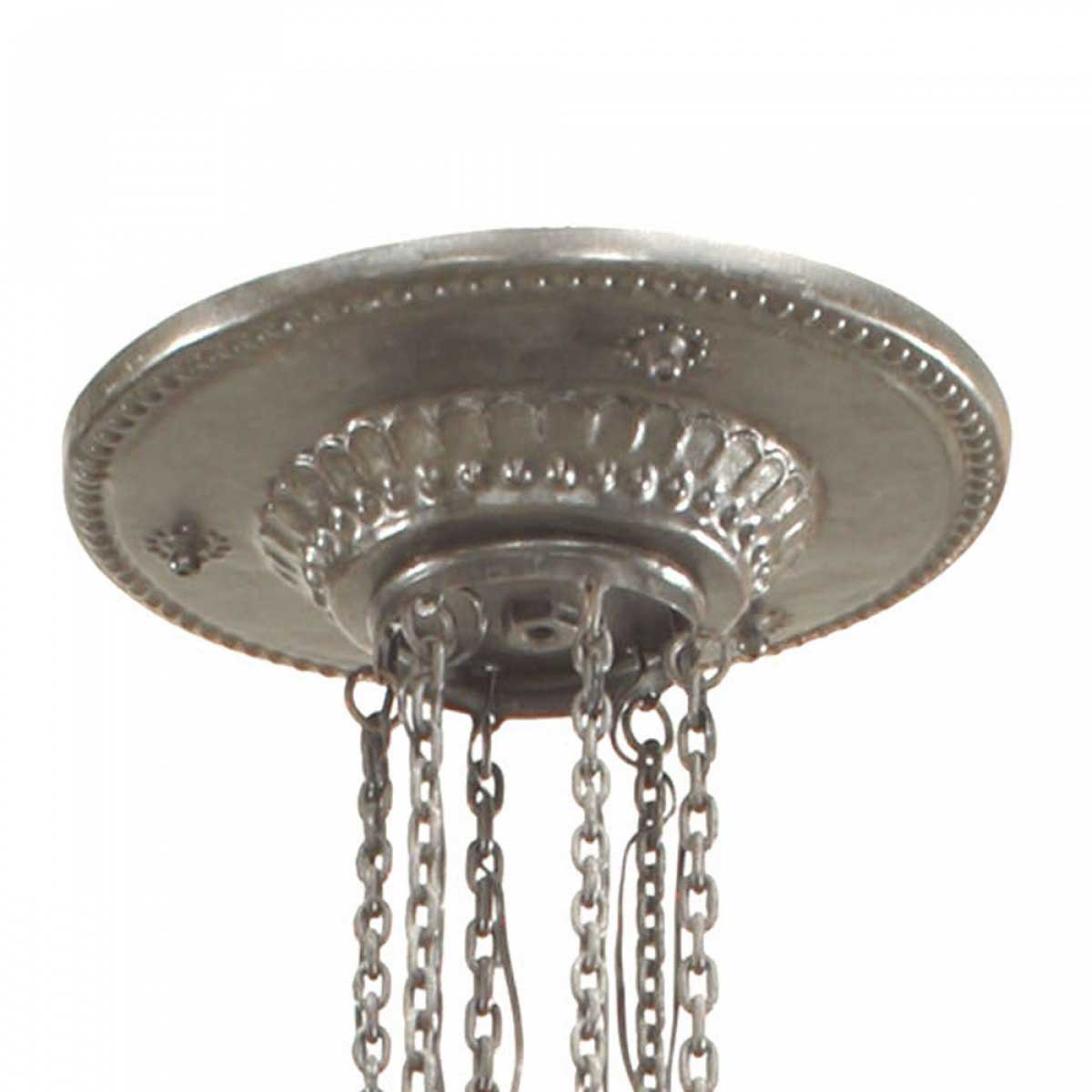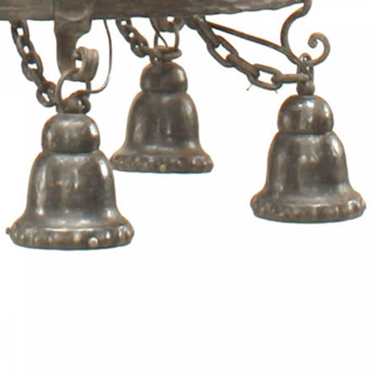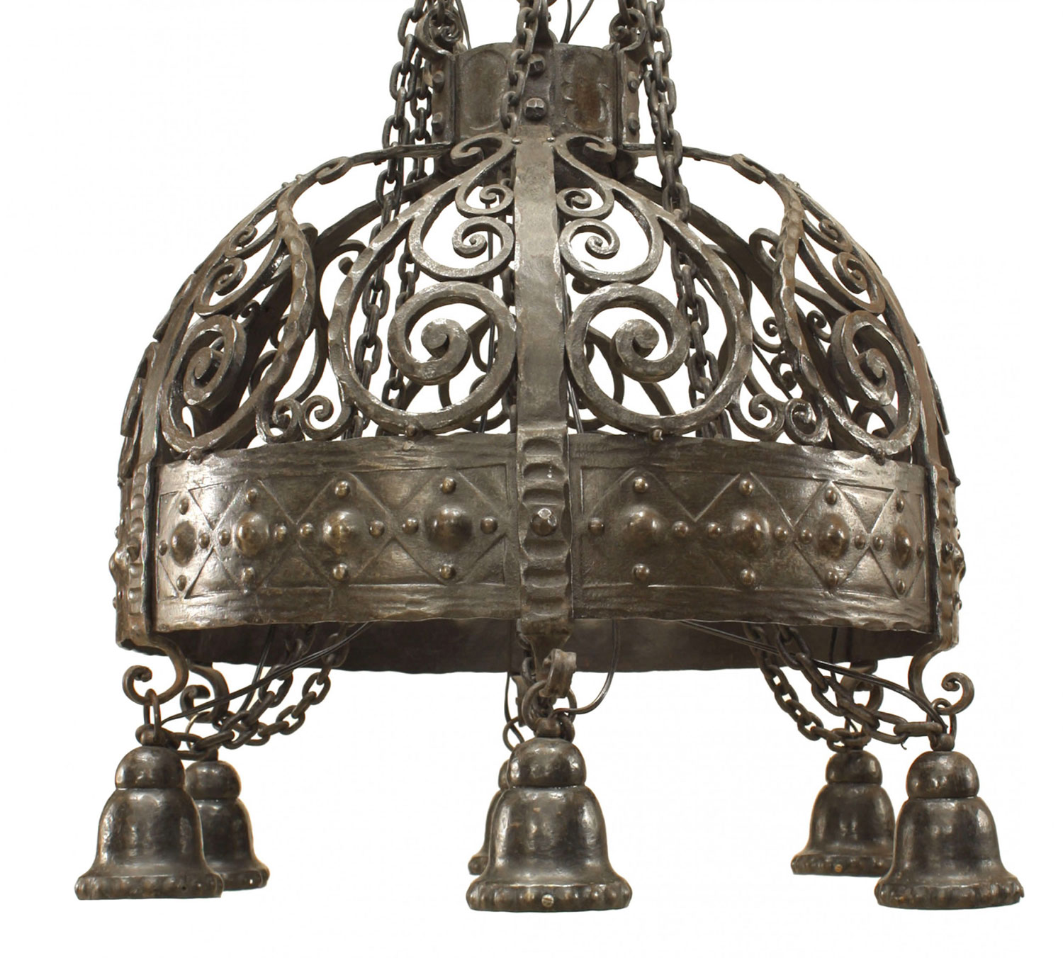 German wrought iron (1920s) large dome shaped 6 light chandelier with filigree scroll design suspended by 6 link chains attached to a canopy.