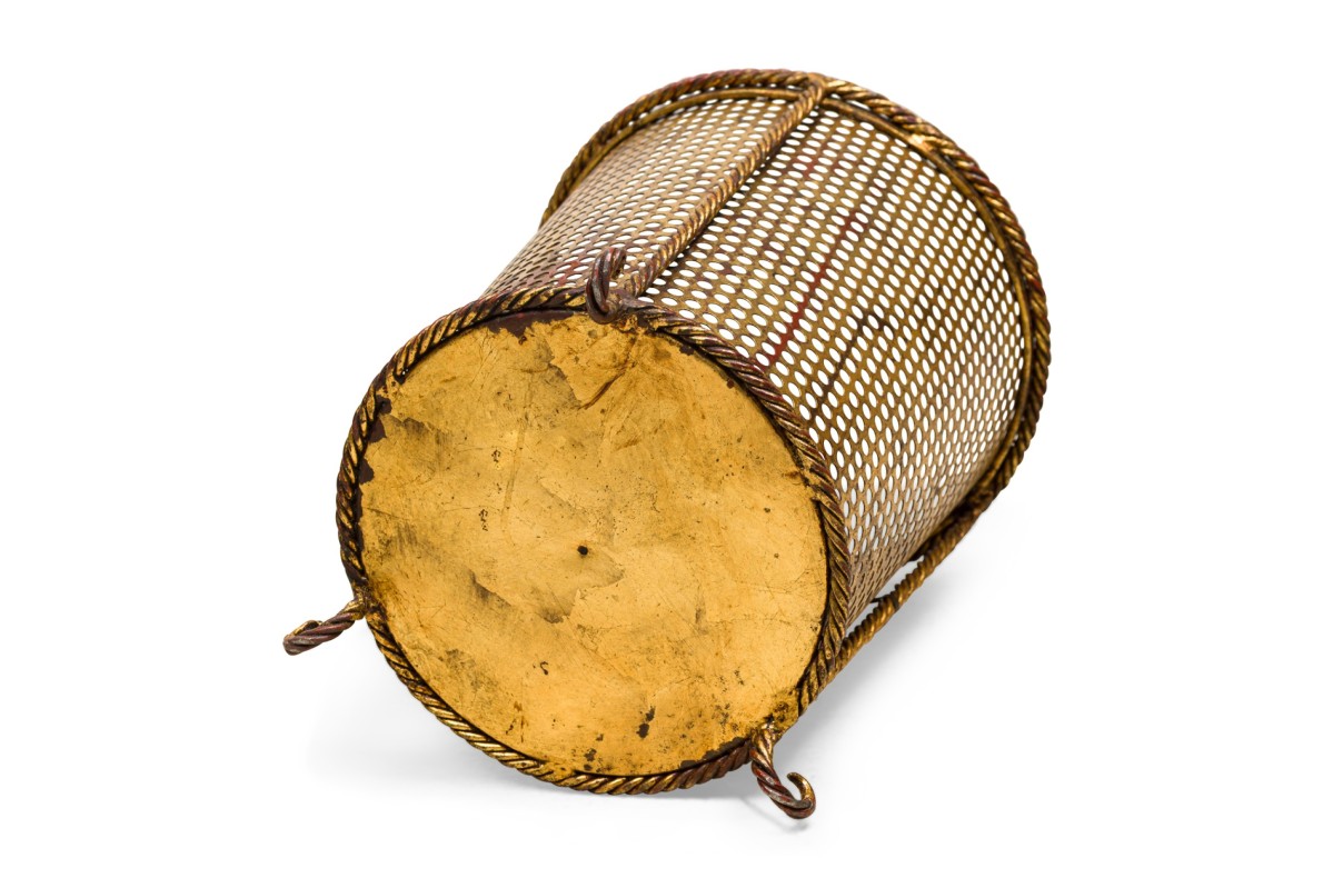 Italian Mid-Century gilt metal rope trim round waste paper basket with perforated frame resting on 3 scroll feet
