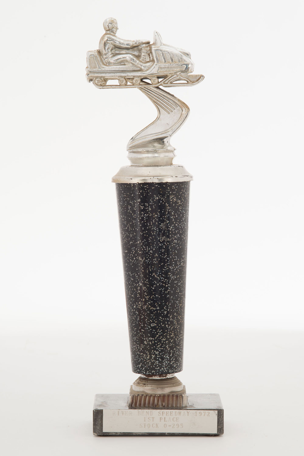 Gilded metal and glittered black plastic snowmobile trophy on a rectangular gray marble base with a "RIVER BEND SPEEDWAY, 1972, 1ST PLACE" plaque