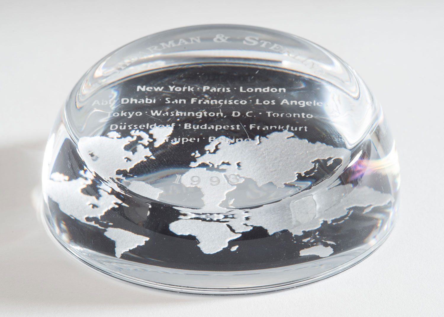 Vintage dome-shaped clear glass paperweight with etched world map on bottom and SHERMAN & STERLING on top