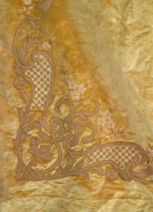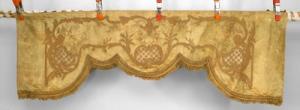 Set of 5 gold velvet drapes with applied decoration (2 flat panels & 1 pleated panel: 82"x 42", 1 valance: 76" x 22", 1 valance: 64" x 22") (PRICED AS SET).