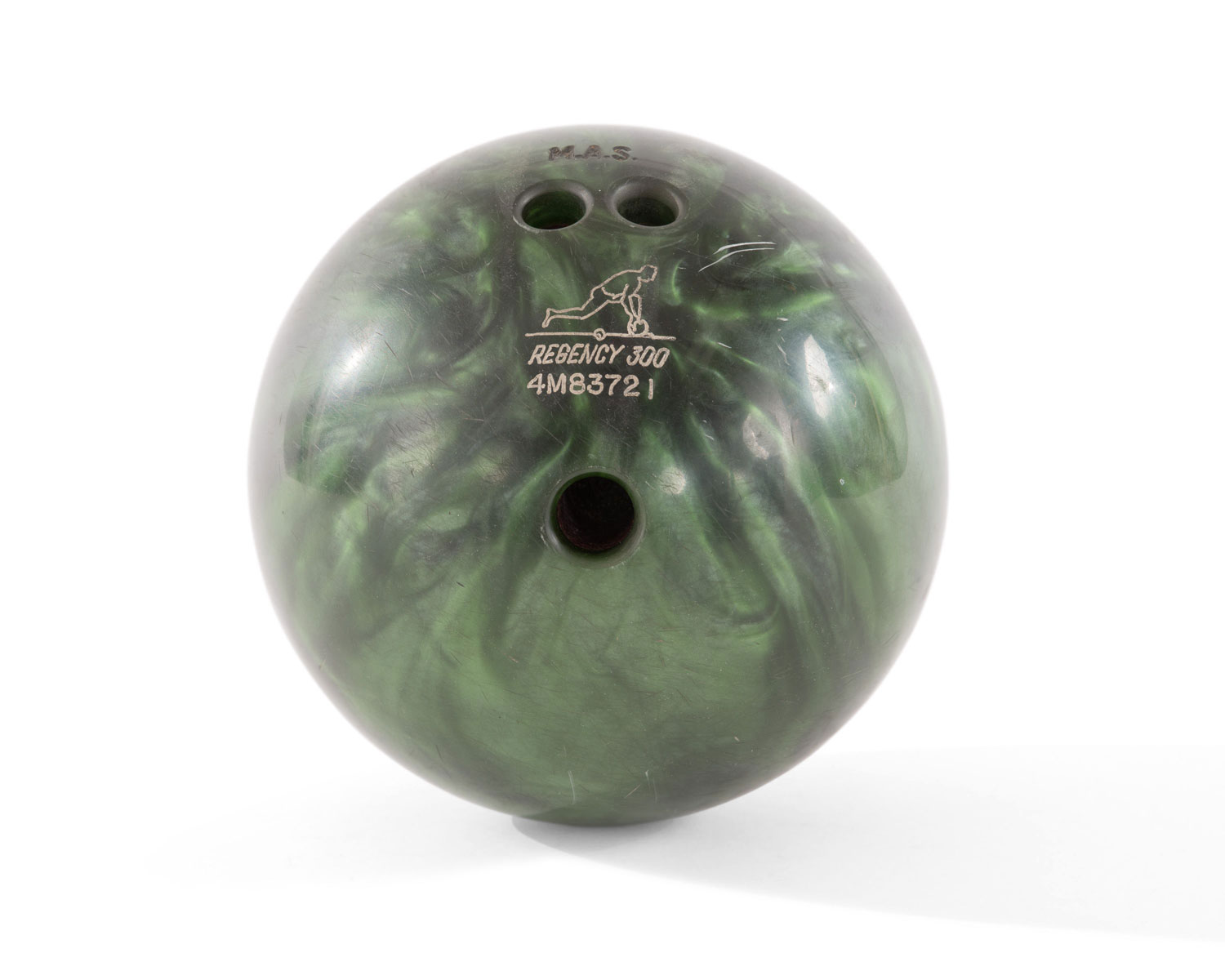 Marbled pearlescent green Ebonite bowling ball engraved with the initials MAS