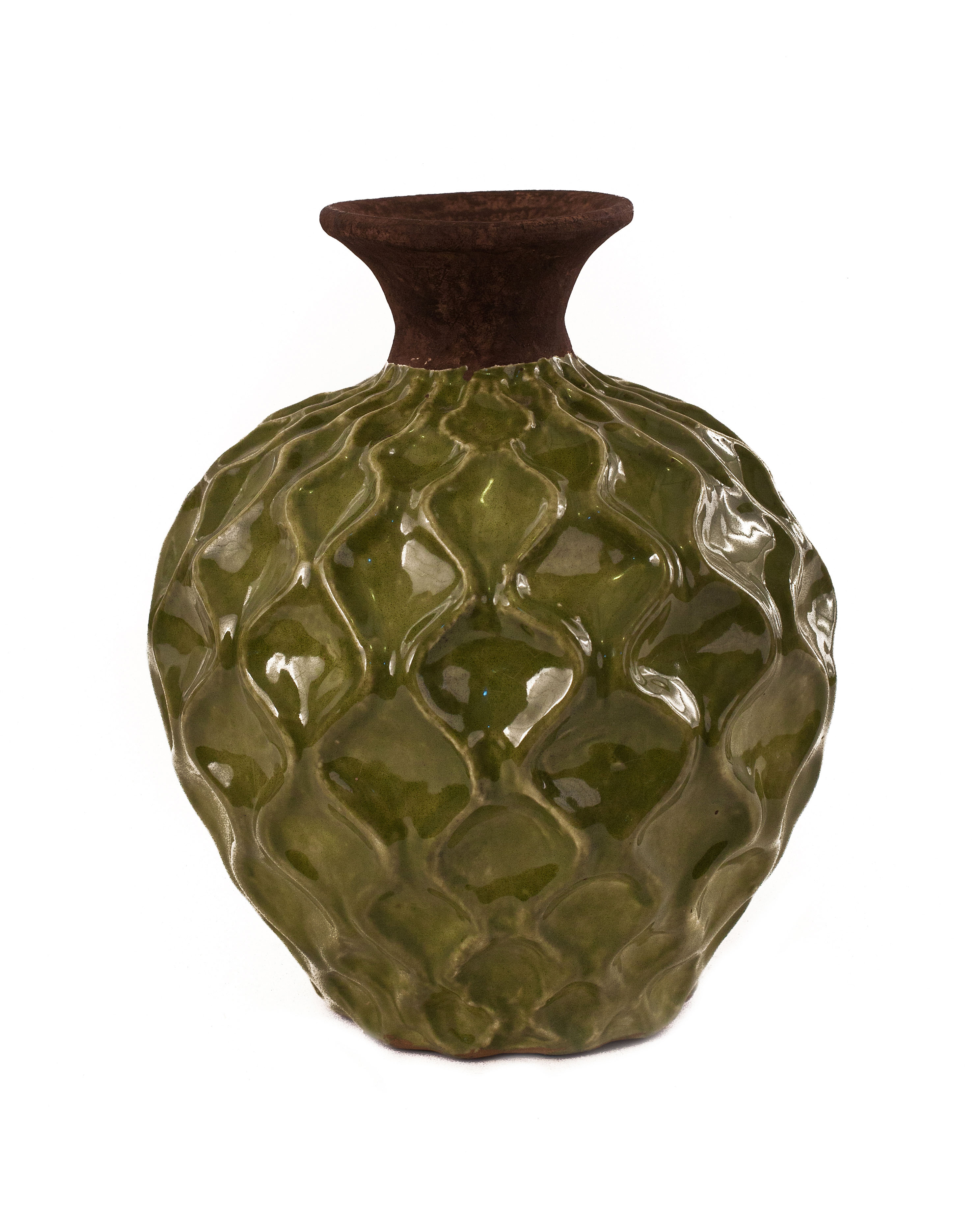 Apple-shaped green-glazed ceramic vase with a raised wave pattern, and a fluted brown painted mouth