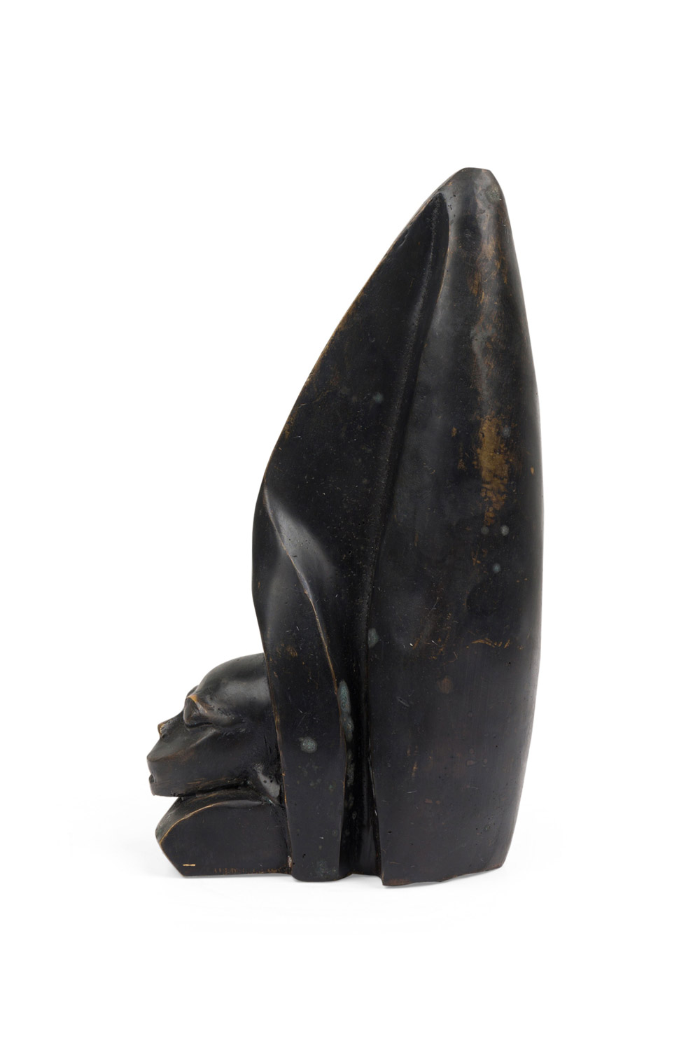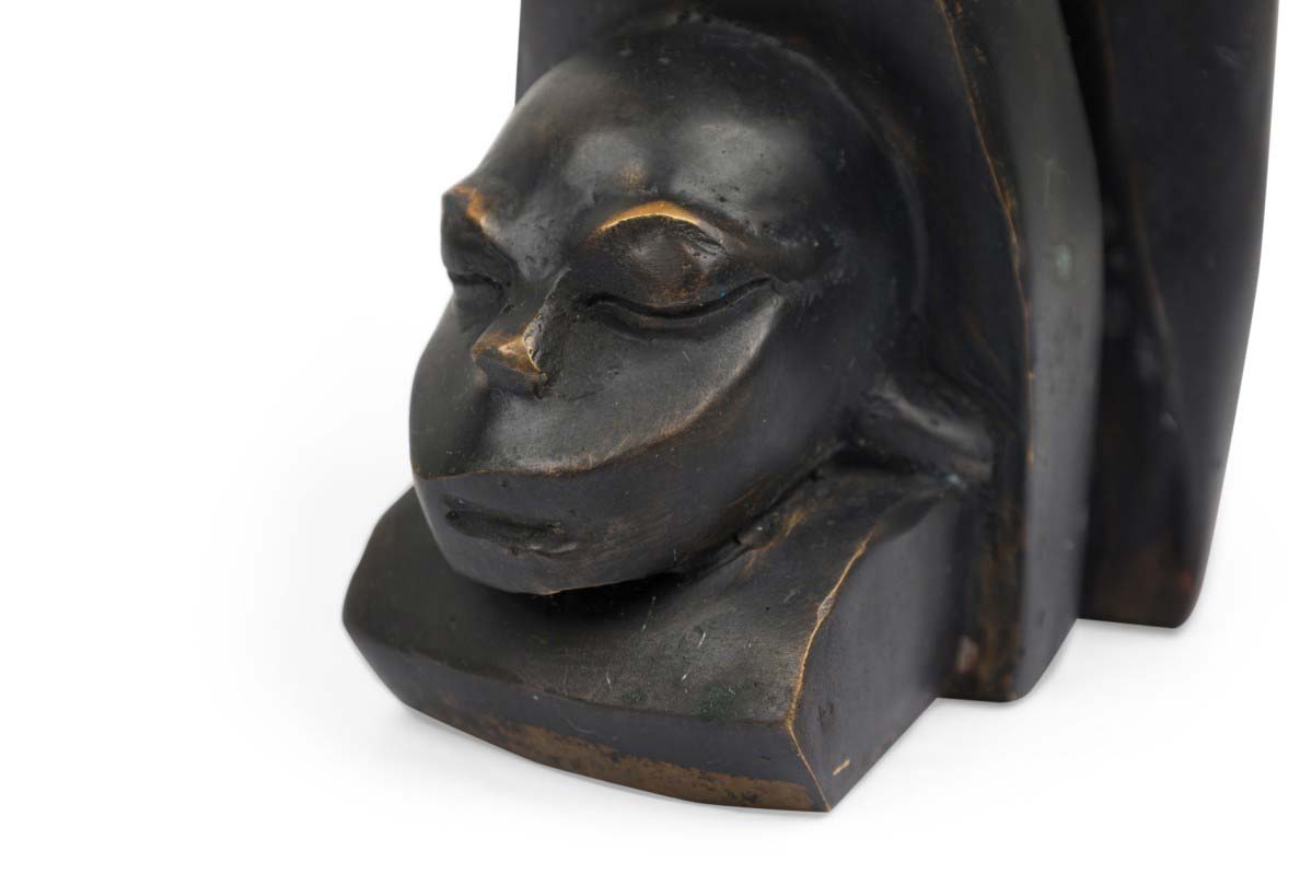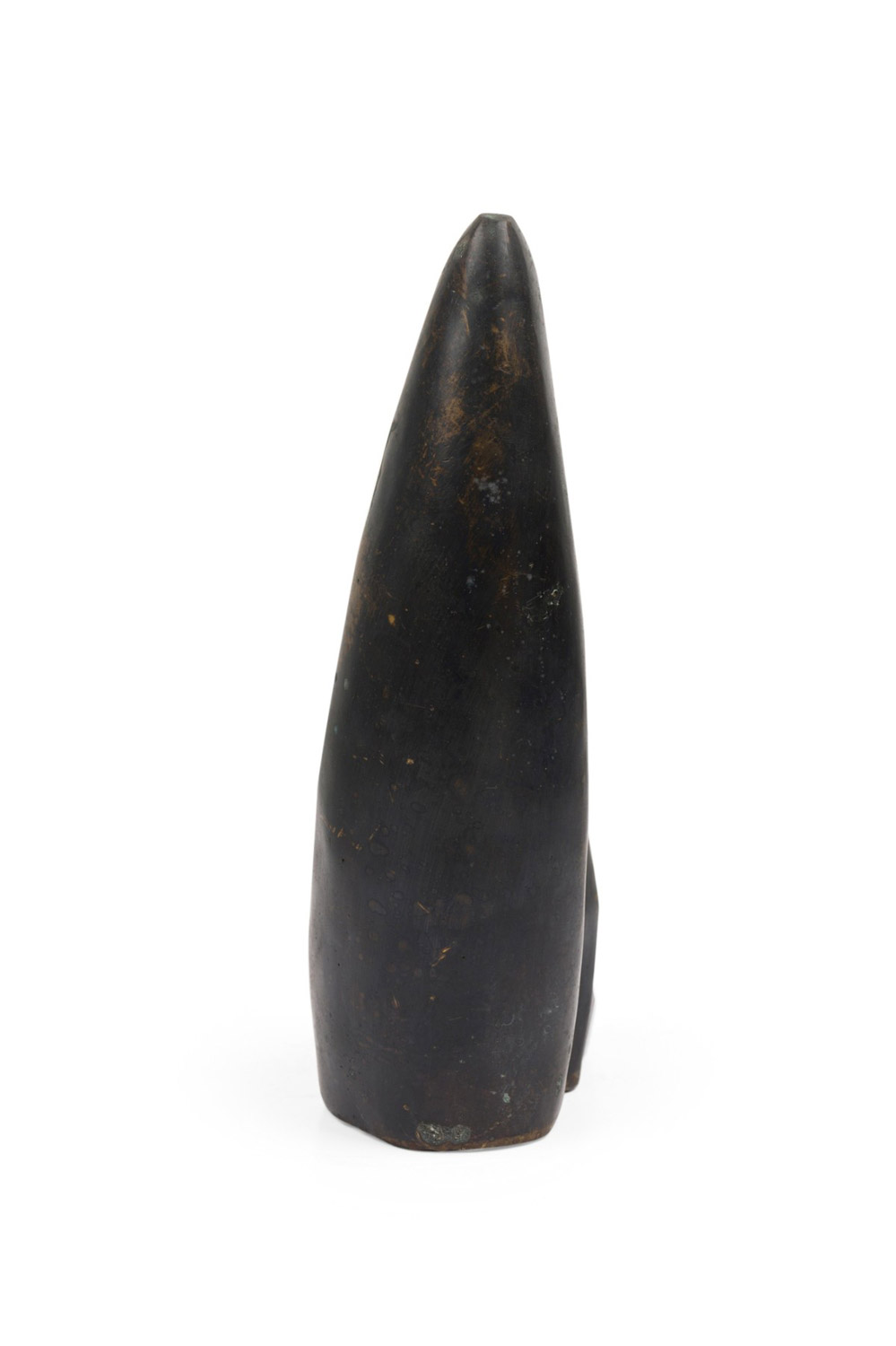 Contemporary hand-forged bronze Brutalist-inspired figural sculpture finished in an ebonized patina depicting a human head carved into a large animal's tooth. (PRICED EACH)