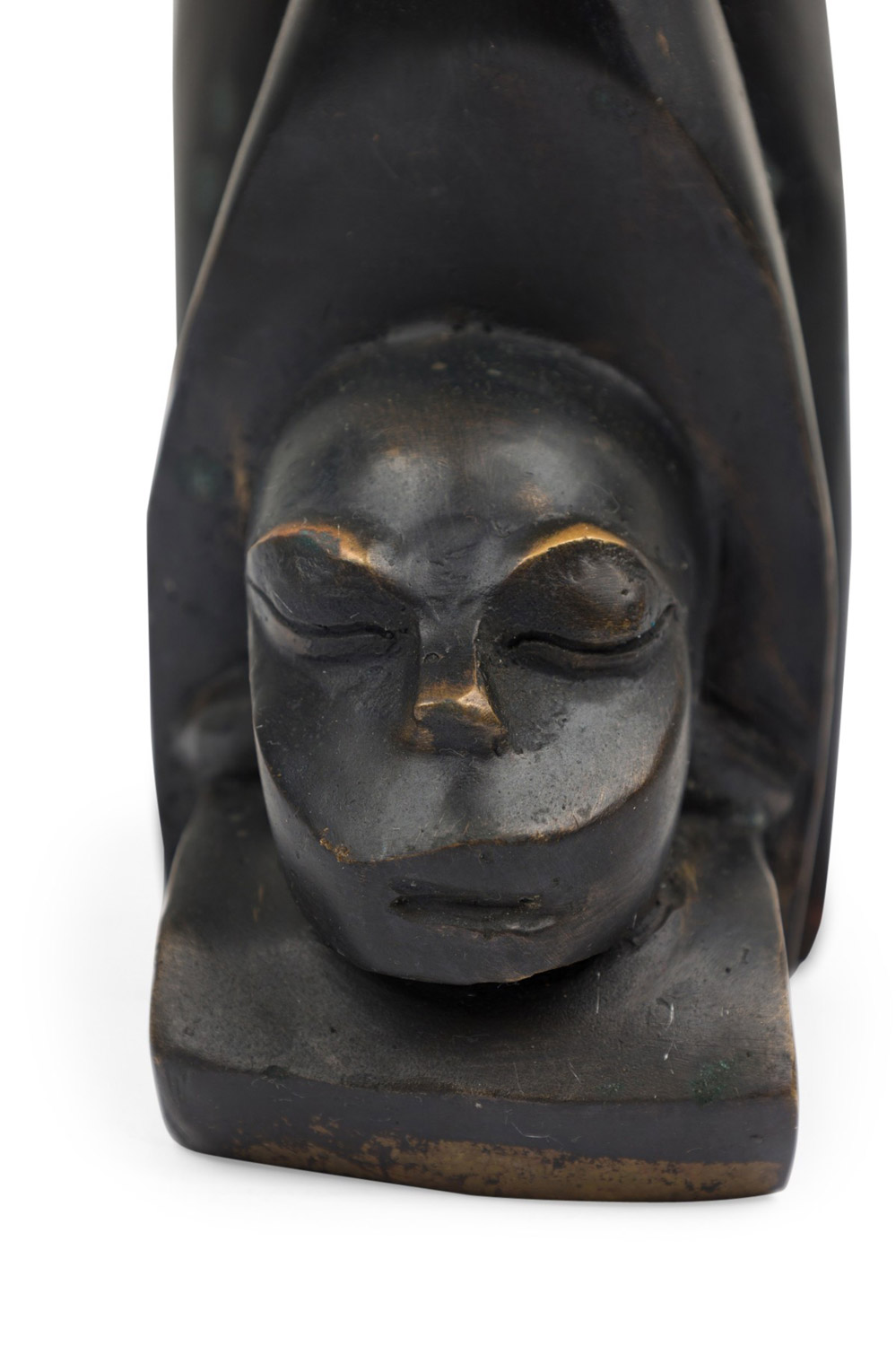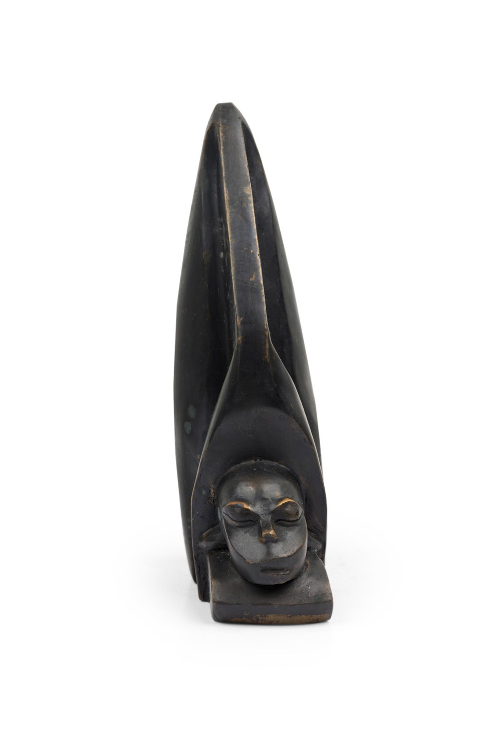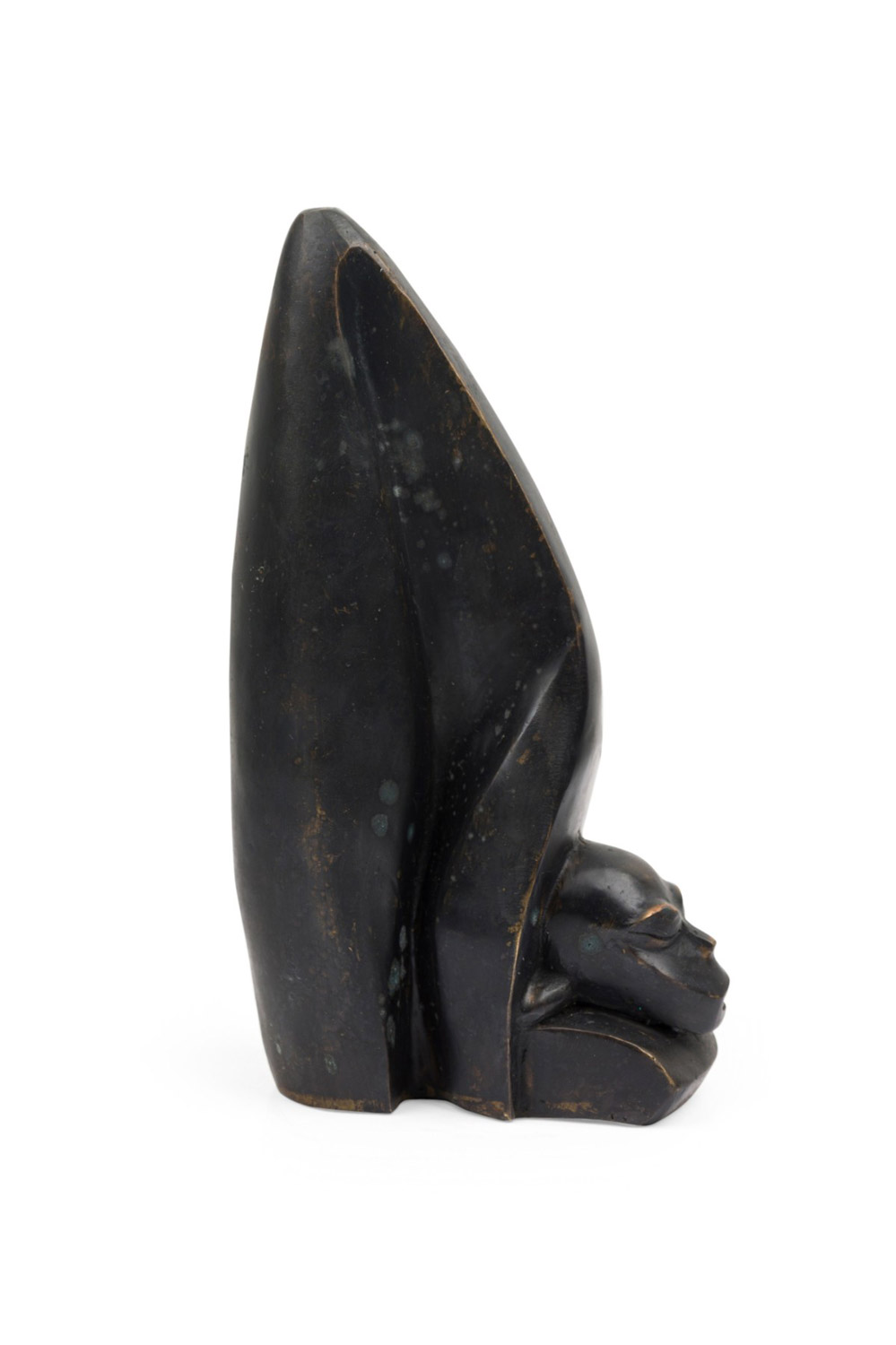 Contemporary hand-forged bronze Brutalist-inspired figural sculpture finished in an ebonized patina depicting a human head carved into a large animal's tooth. (PRICED EACH)