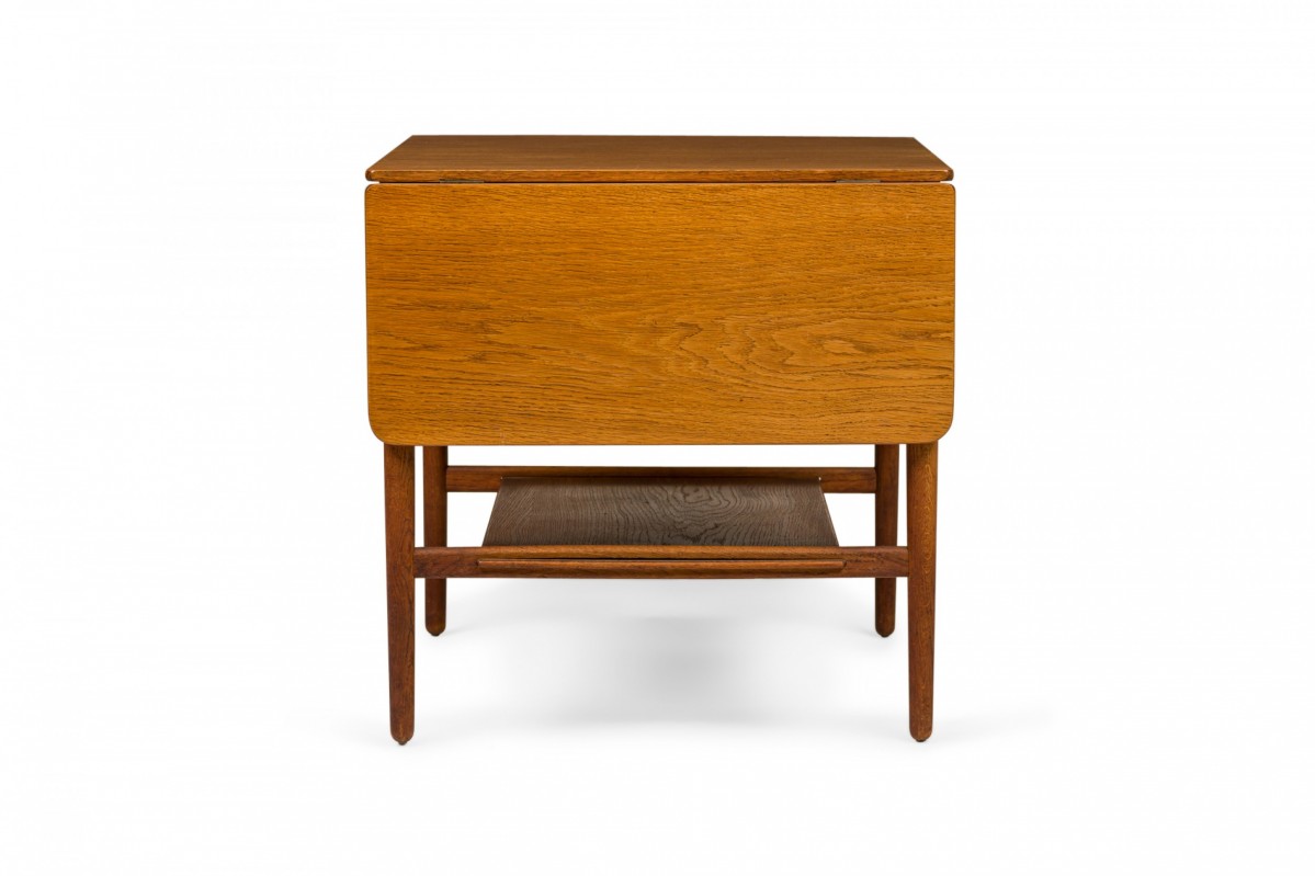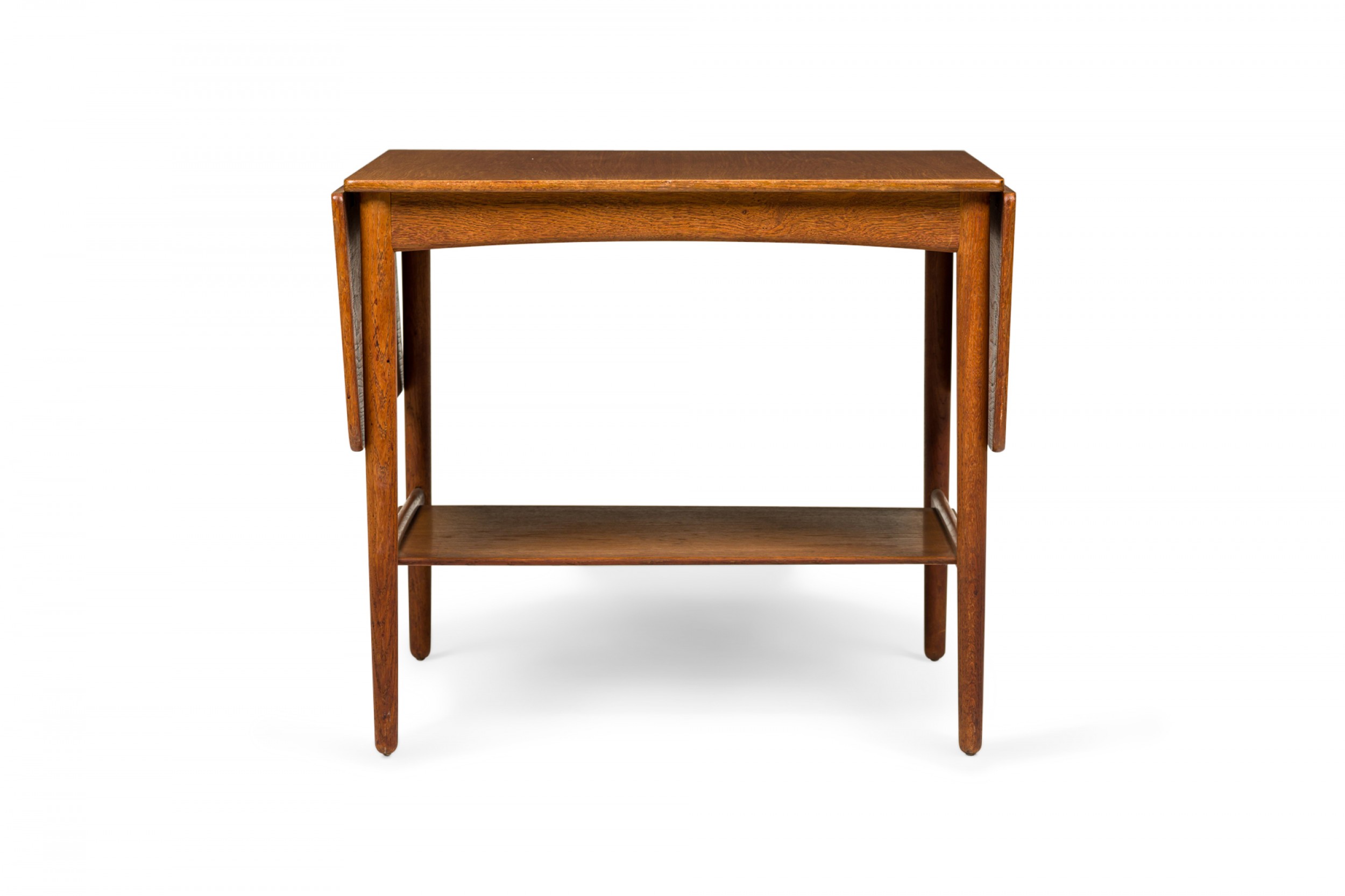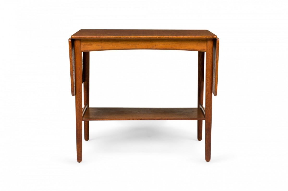 Danish Mid-Century wooden end / side table with a rectangular top and two drop leaves above a lower narrow stretcher shelf connecting four tapered dowel legs. (Similar piece: DUF0731)