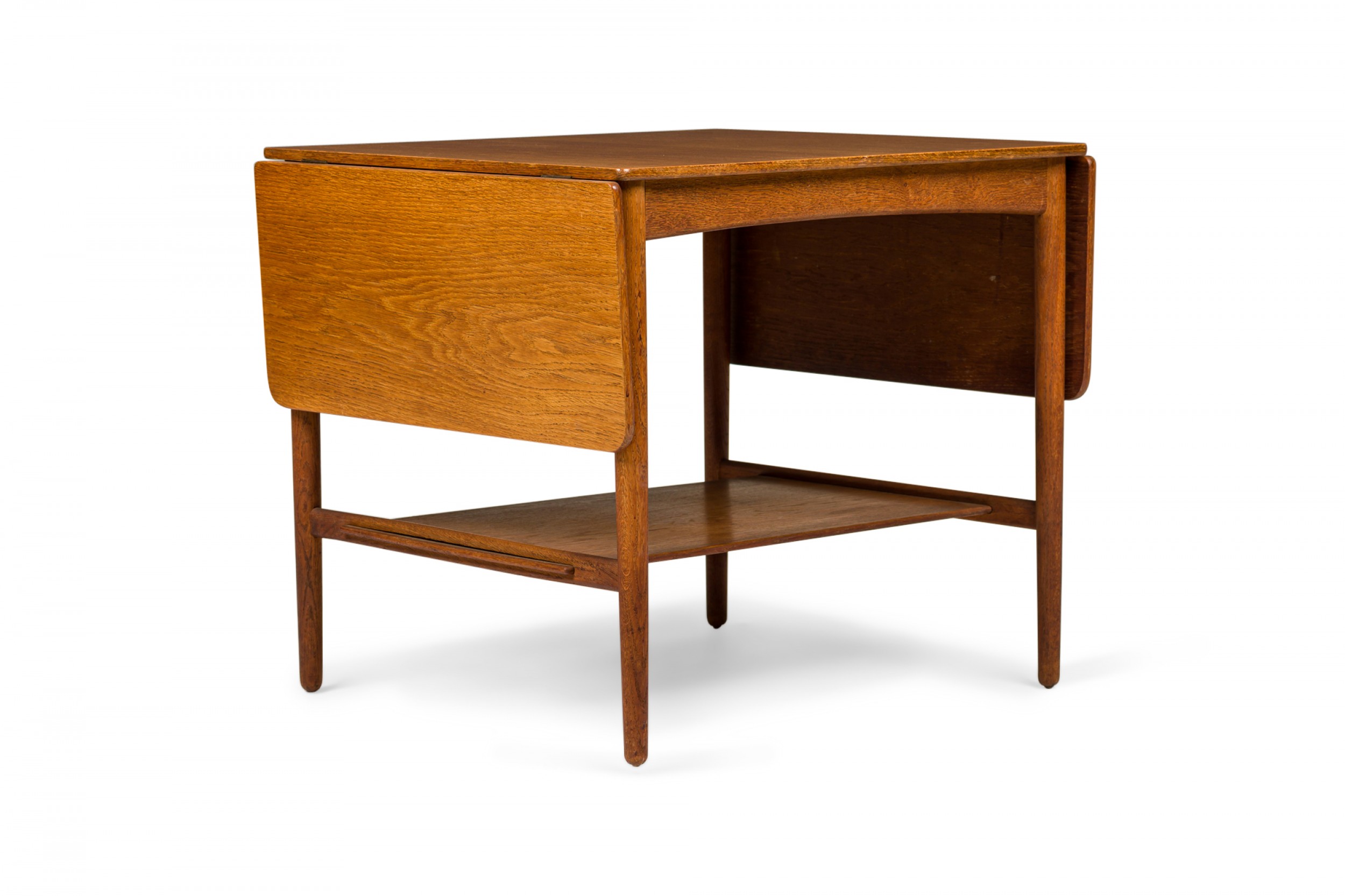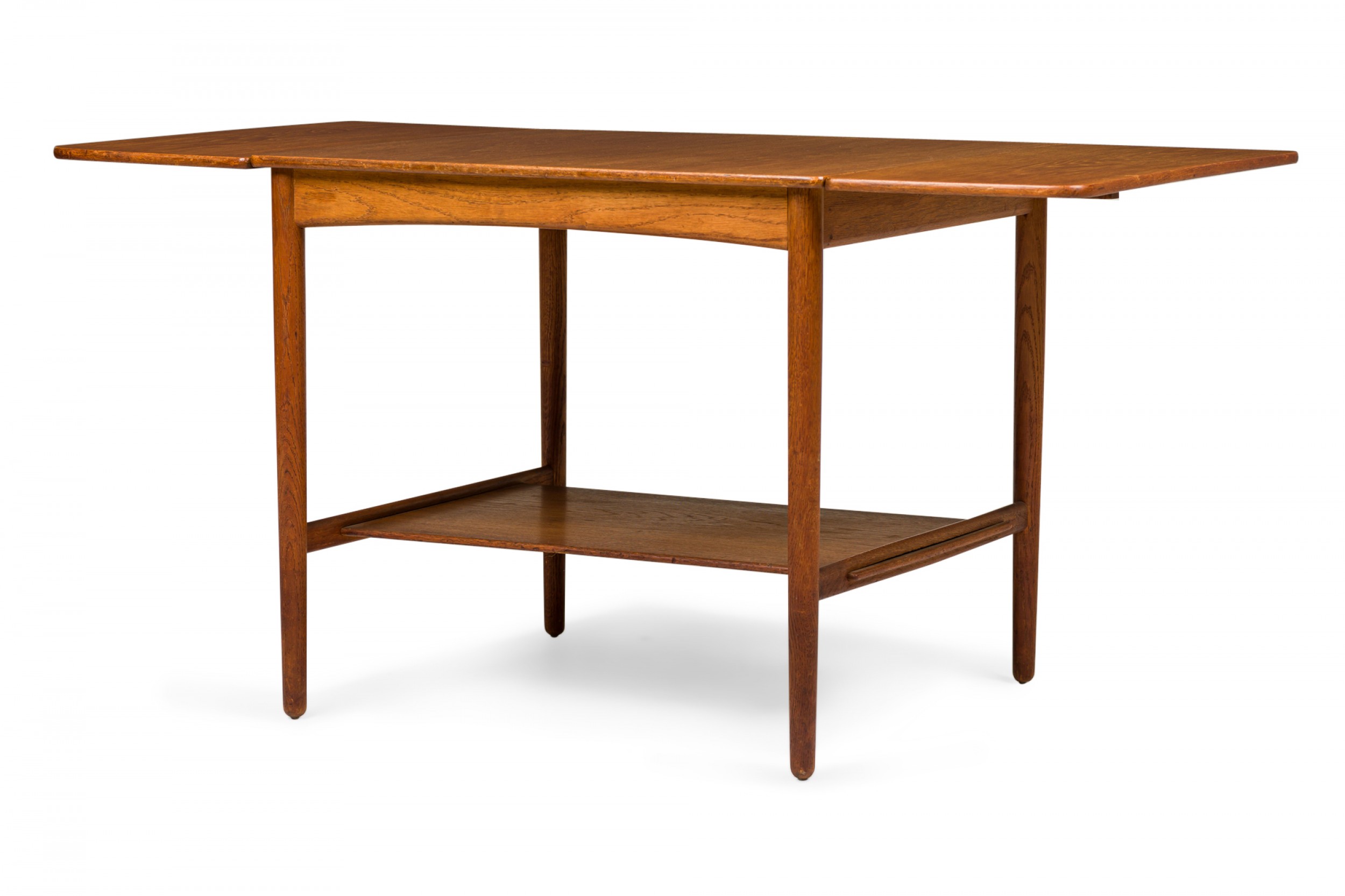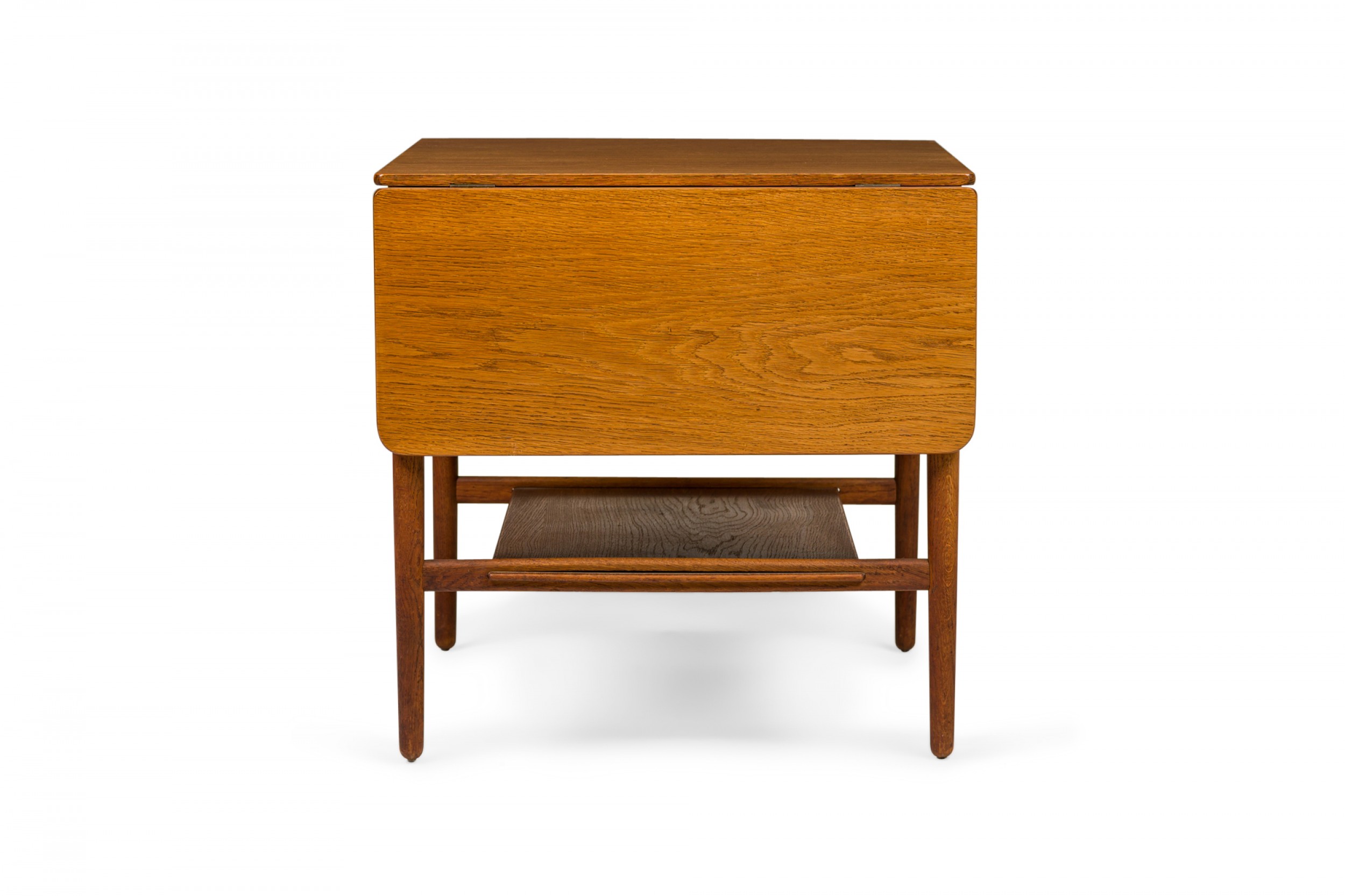 Danish Mid-Century wooden end / side table with a rectangular top and two drop leaves above a lower narrow stretcher shelf connecting four tapered dowel legs. (Similar piece: DUF0731)
