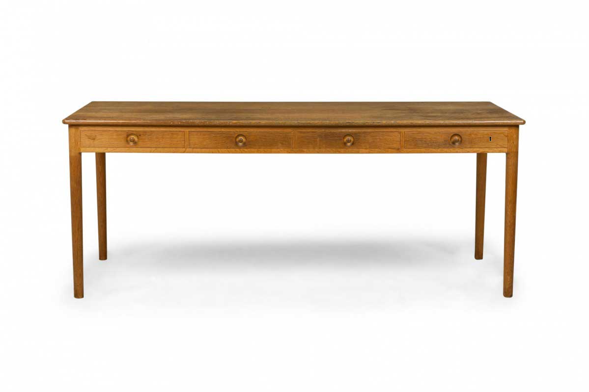 Mid-Century Danish (1970s) rectangular oak table desk having 4 pullout drawers with sculpted round knobs (the right drawer can be locked), and rounded corners resting on cylindrical form legs