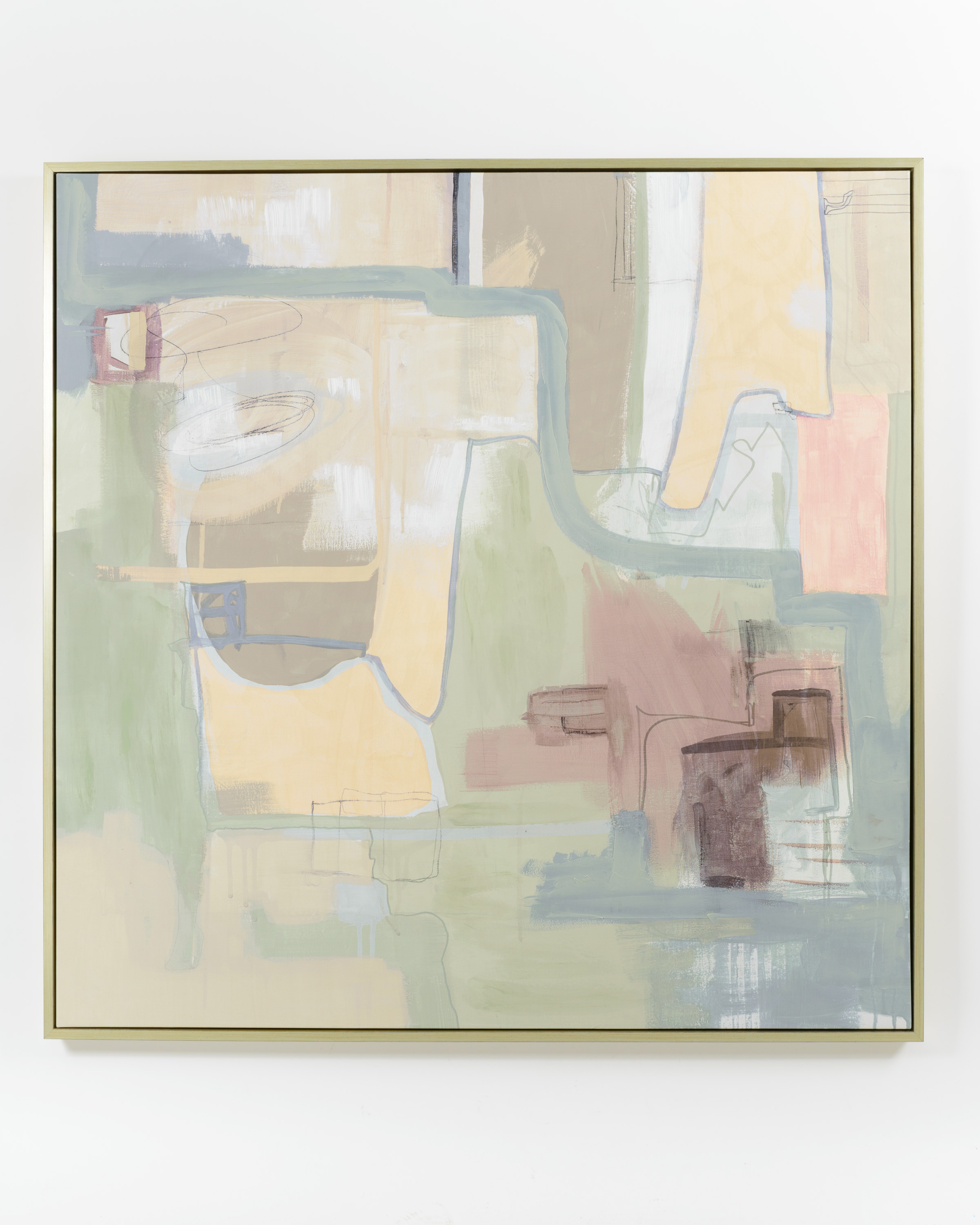 Abstract artwork titled, "In the Garage" on canvas in a gold brushed metal frame