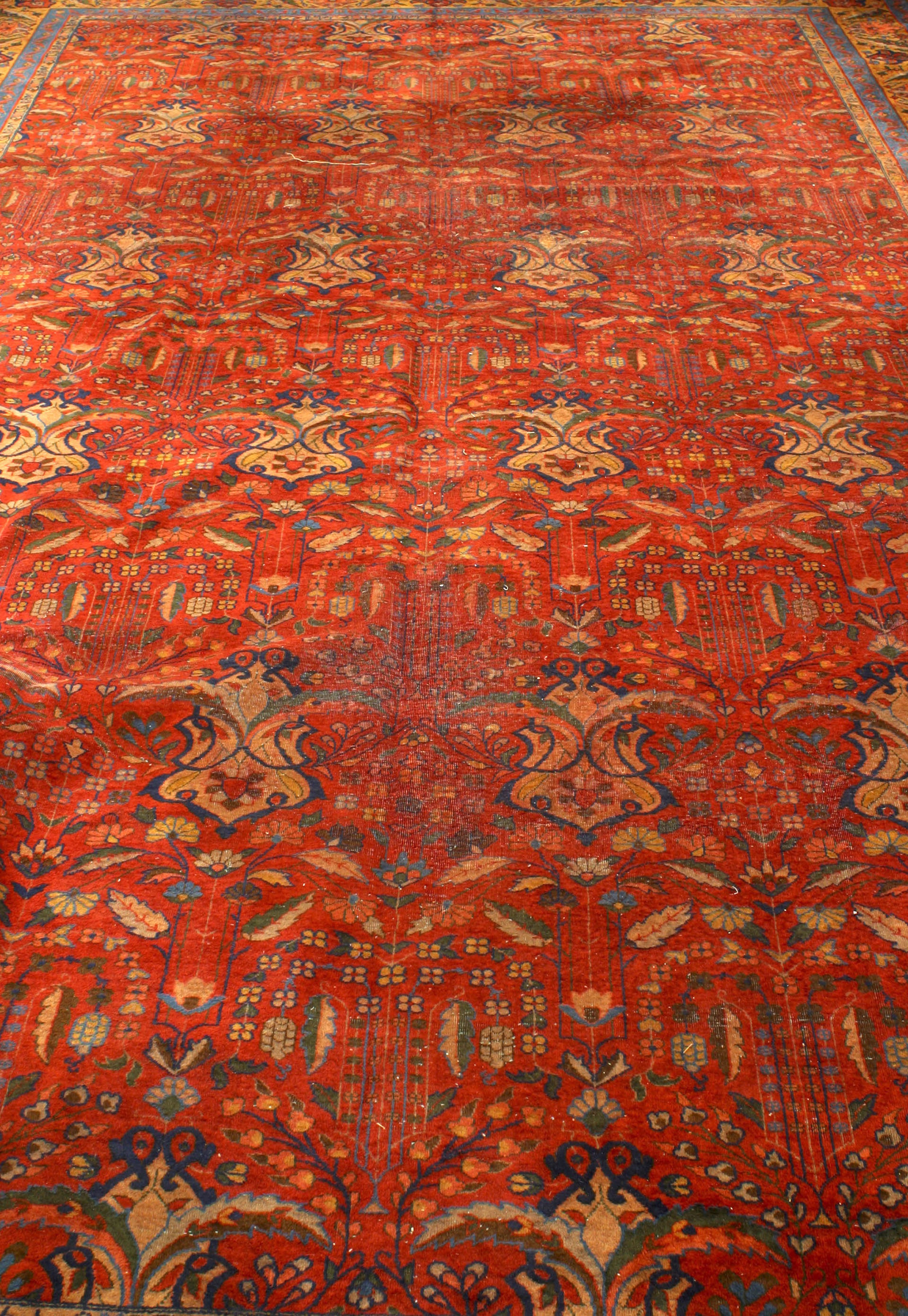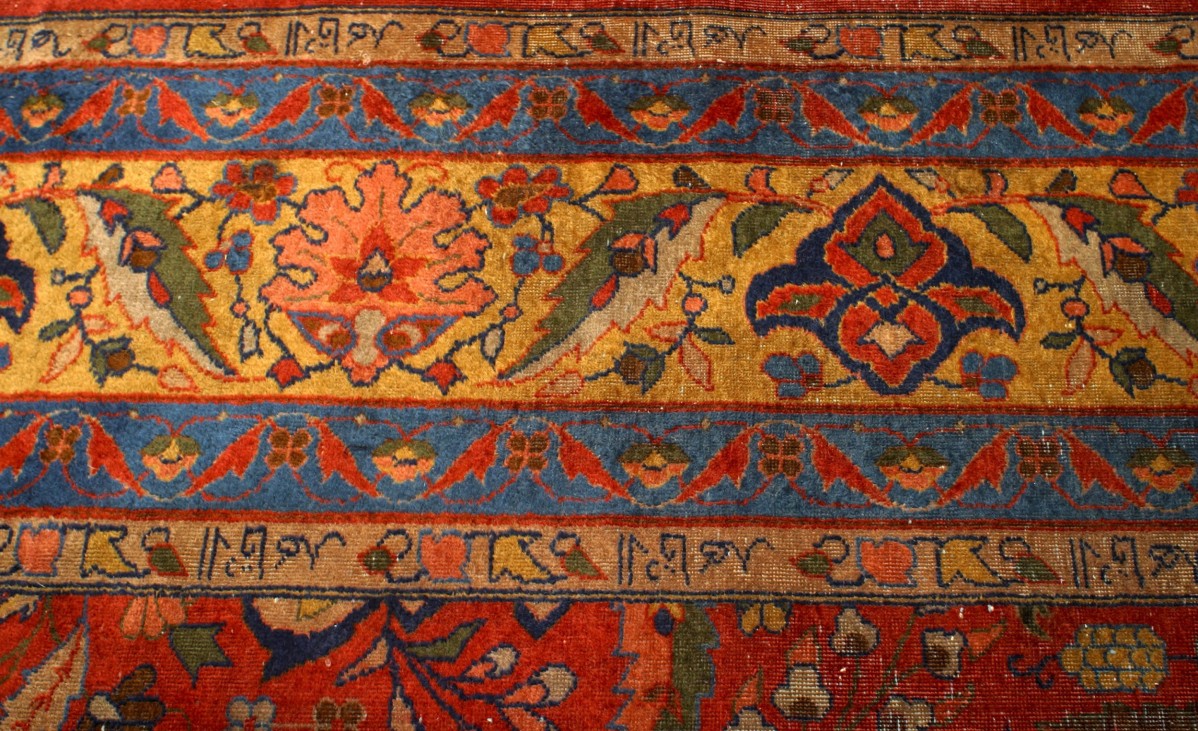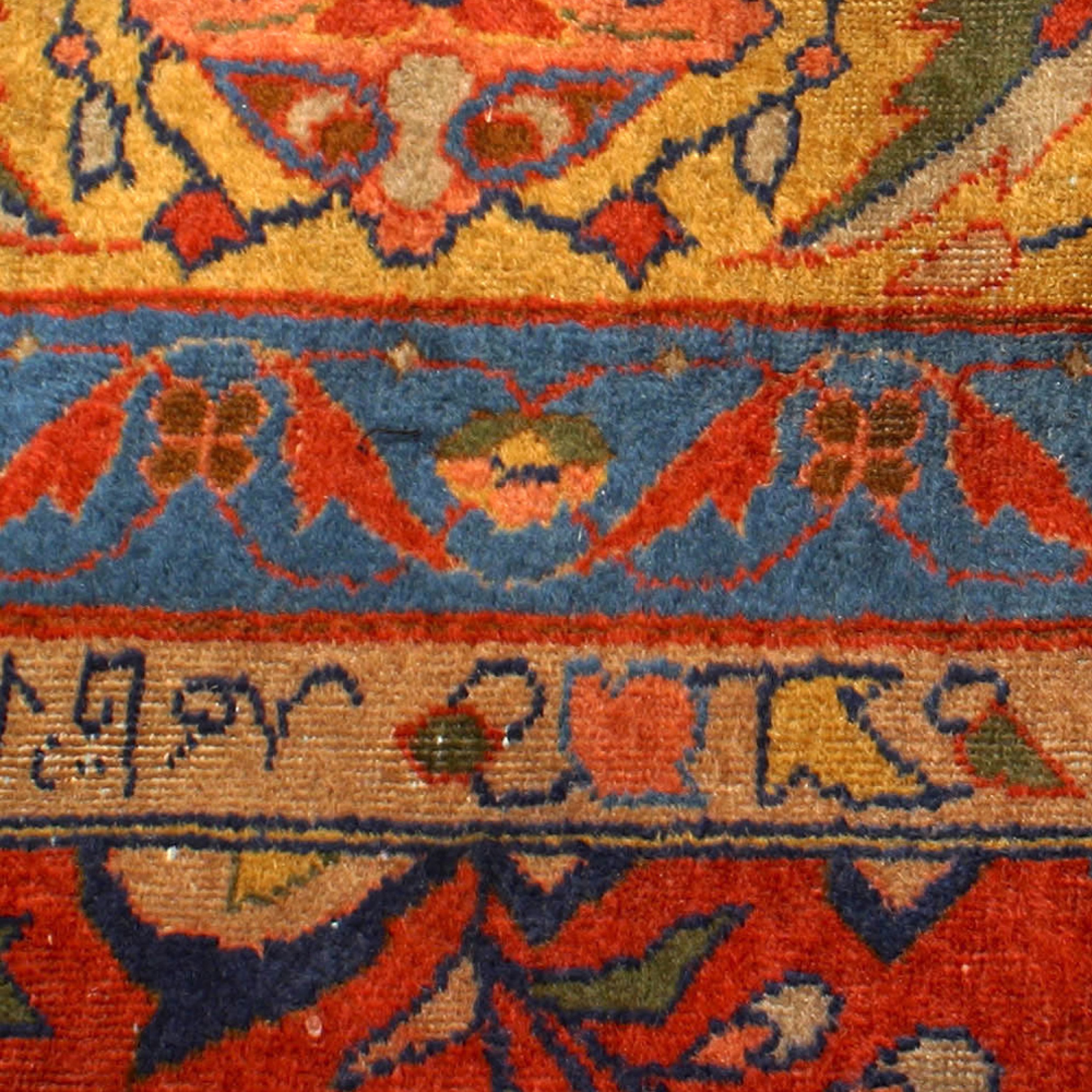 Asian Indian Agra (19th Century) large rug with red, blue, and gold colors with floral designs and Arabic inscriptions (app. 17½' x 10')