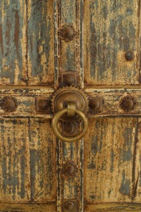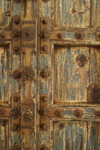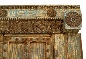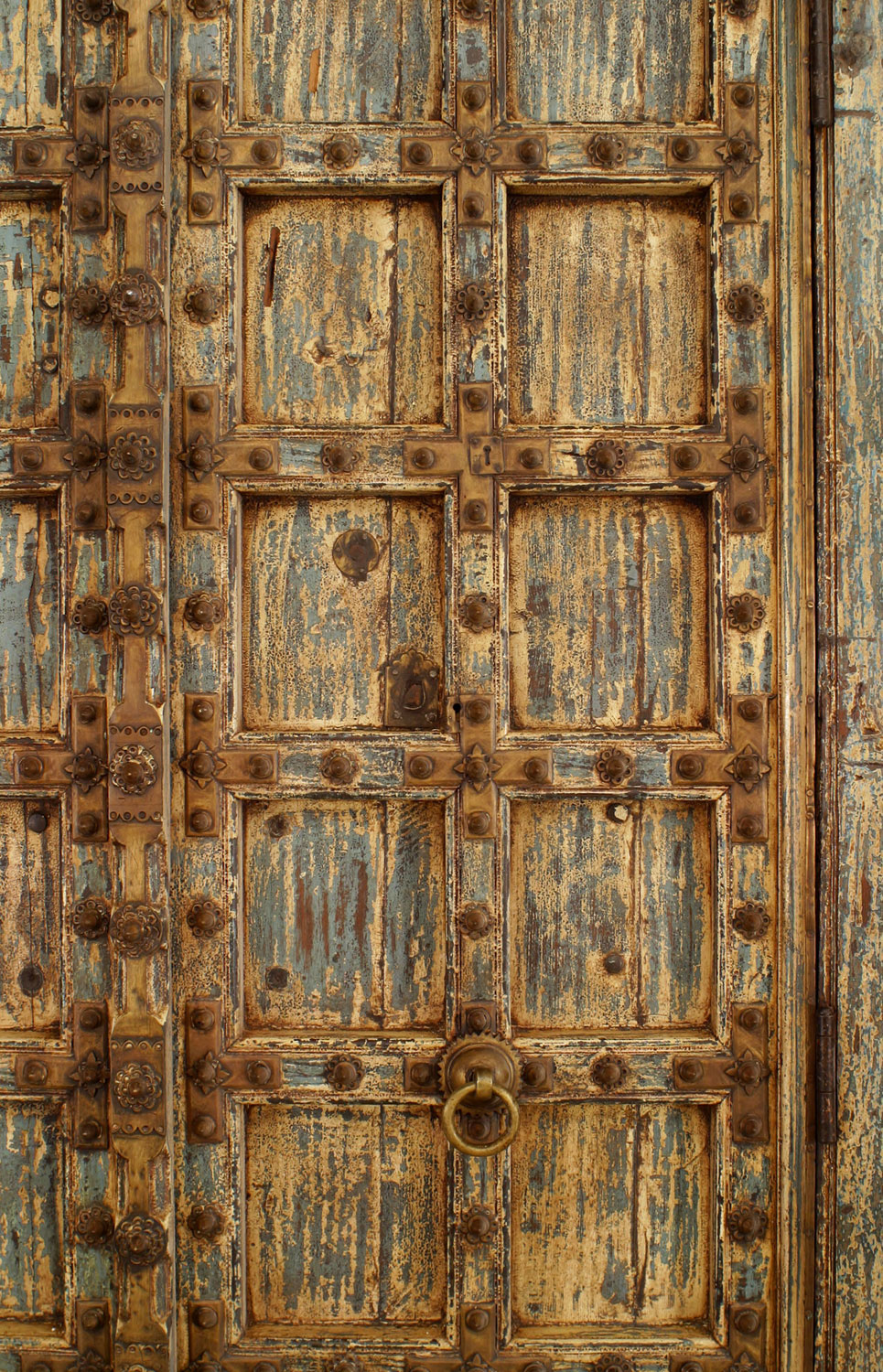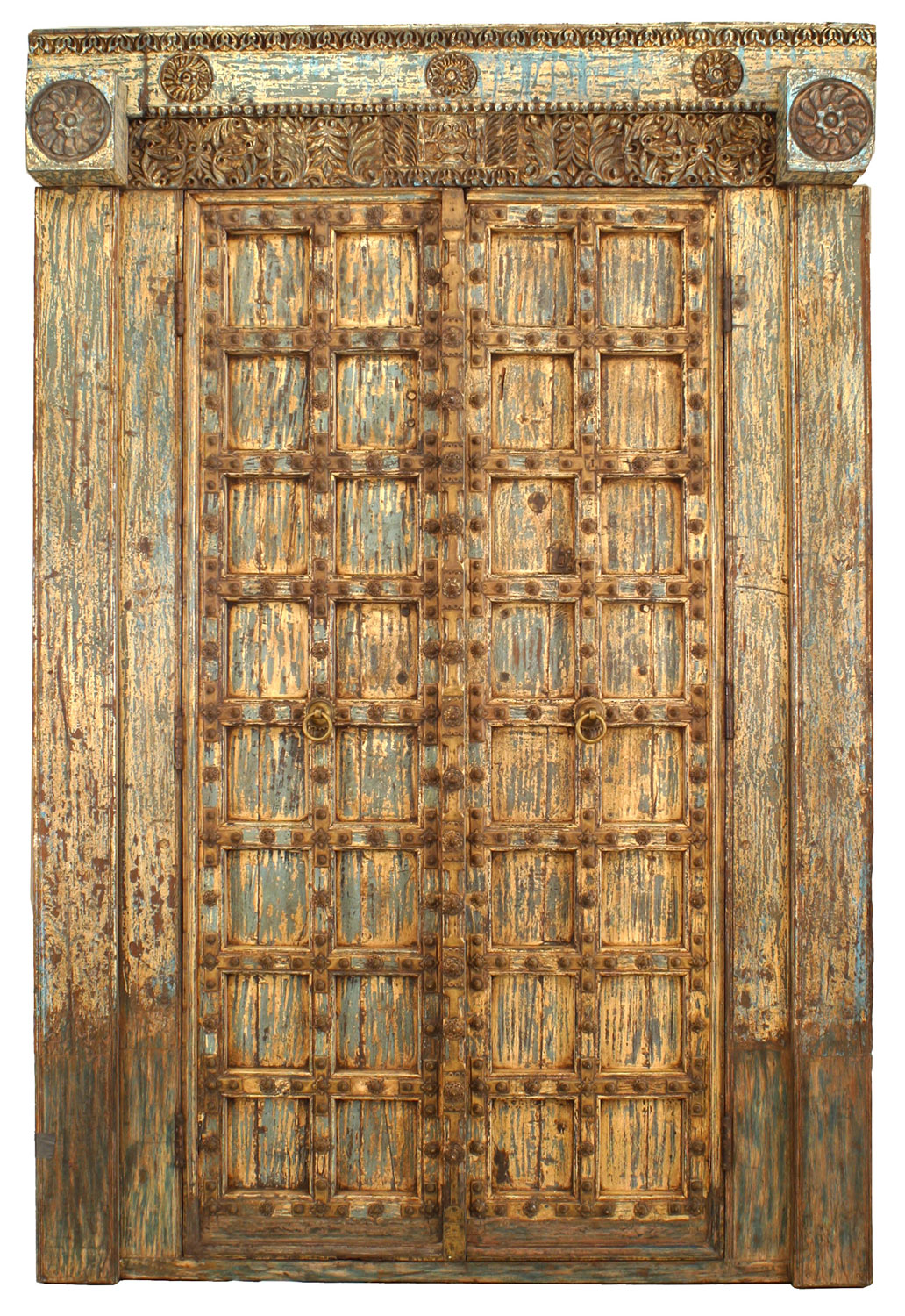 2 Asian (possibly Indian) (18/19th Century) blue & white distressed painted and carved 2 doors in a frame with a separate pediment decorated with large brass nail heads & trim (PRICED EACH).