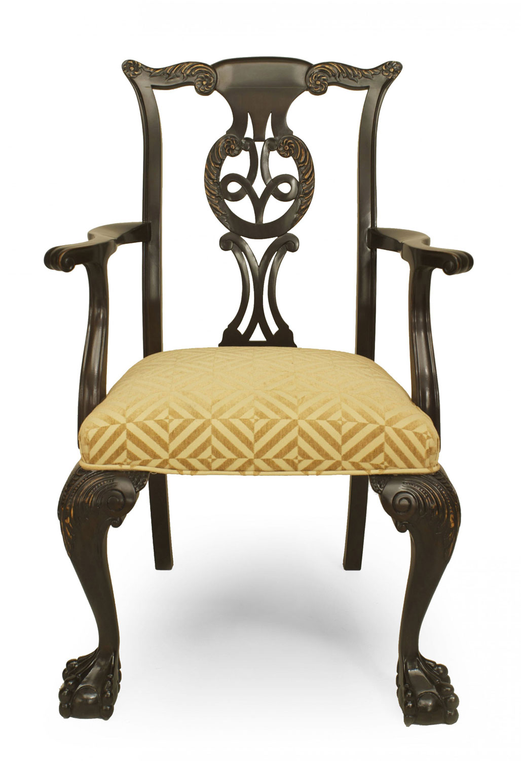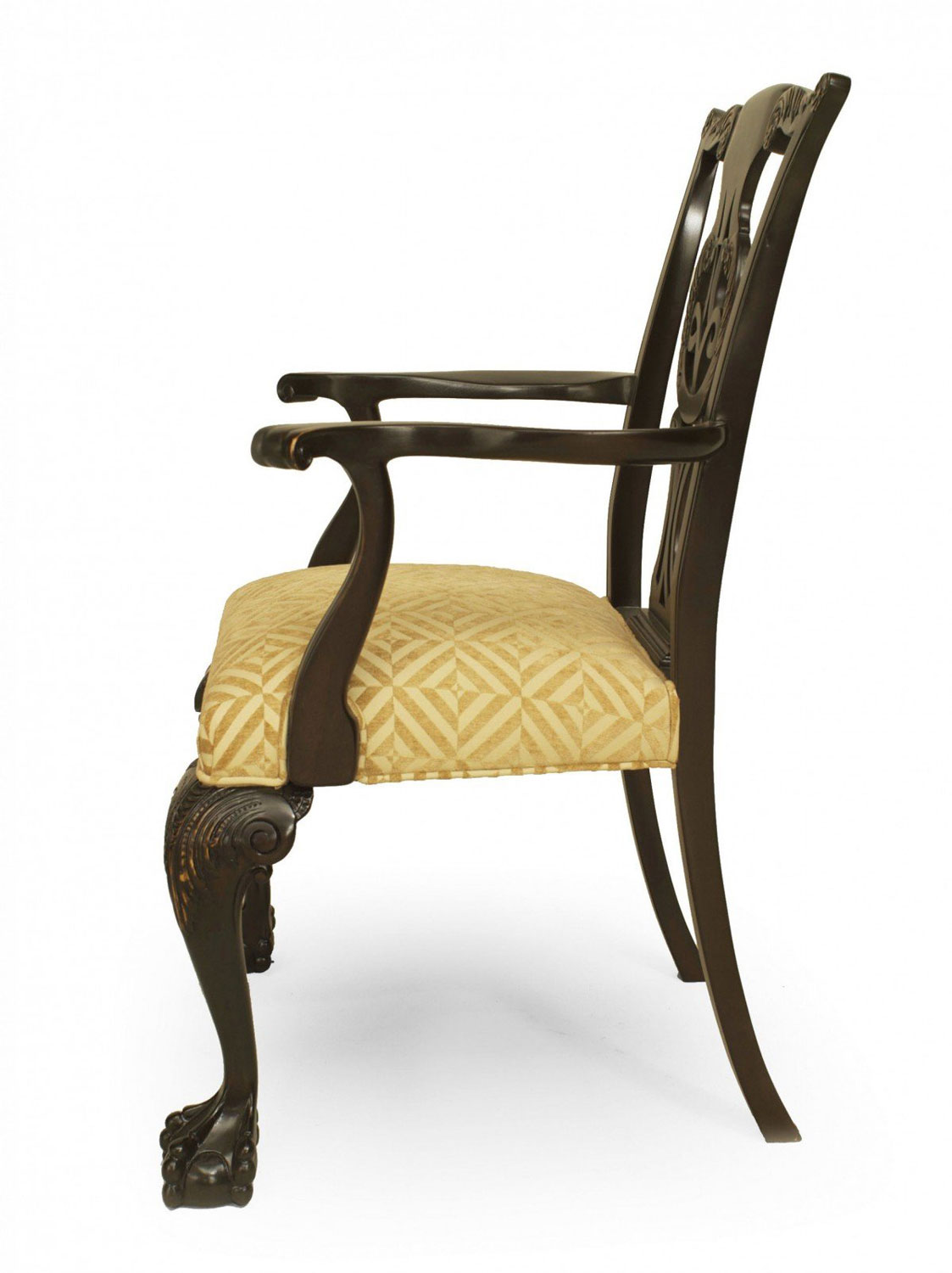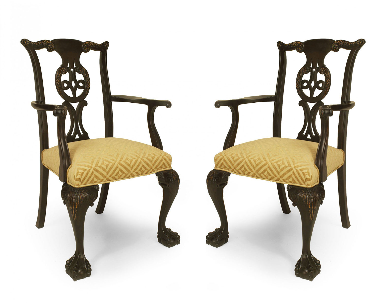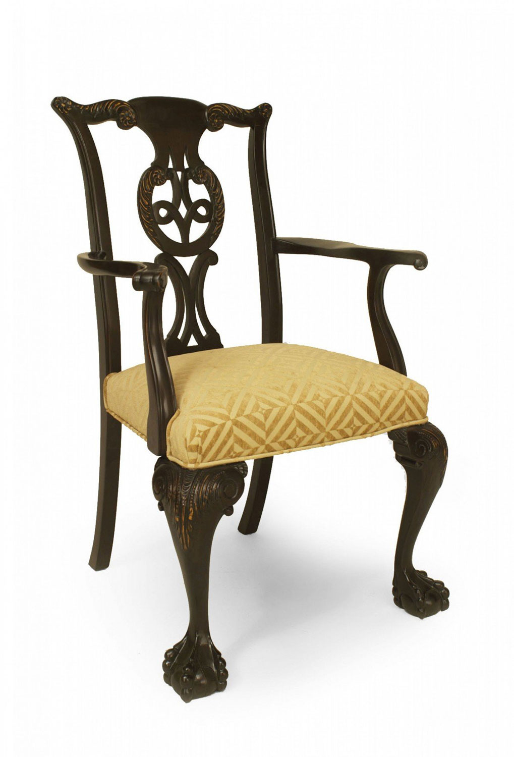 2 Irish George II style carved elm wood arm chairs with pierced carved backs and patterned chenille slip seats (PRICED EACH) (Matching 10 Side Chairs: REG3855B)