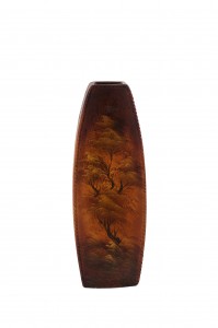 Irregularly-shaped ceramic vase with rounded edges, a brown and gold ombre paint treatment, a crackle painted gold band with brown trees, and a narrow cylindrical neck (Similar vase: BIN048)