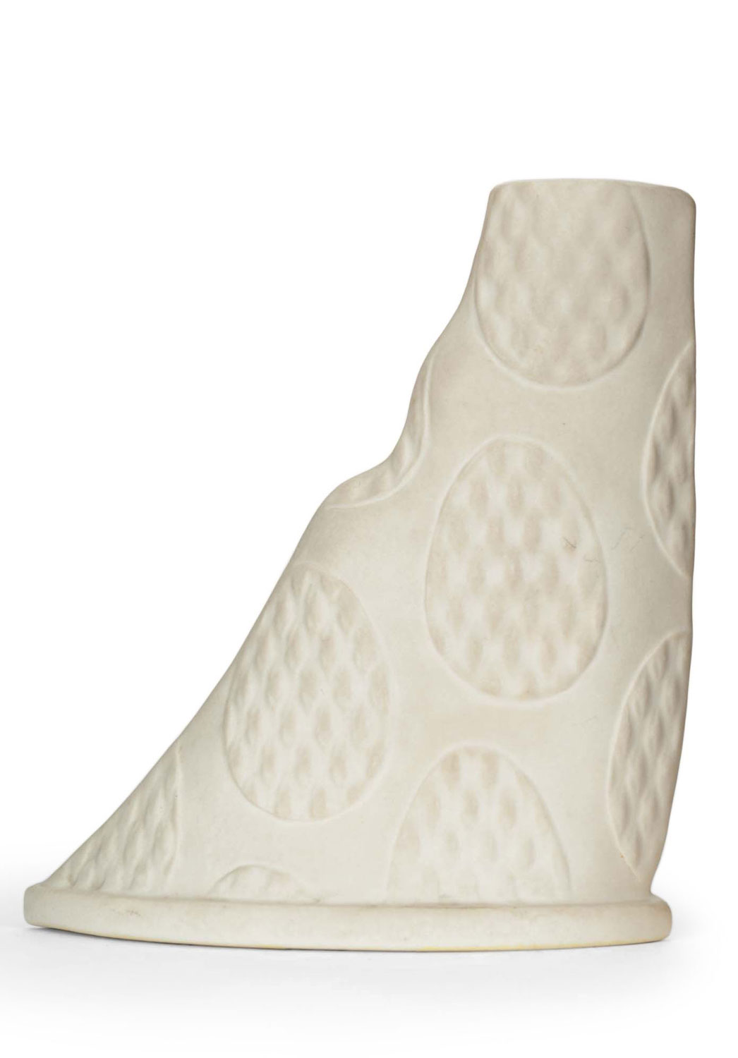 Irregularly shaped white ceramic vase with raised circular design (SEE ALSO: MP0899M)