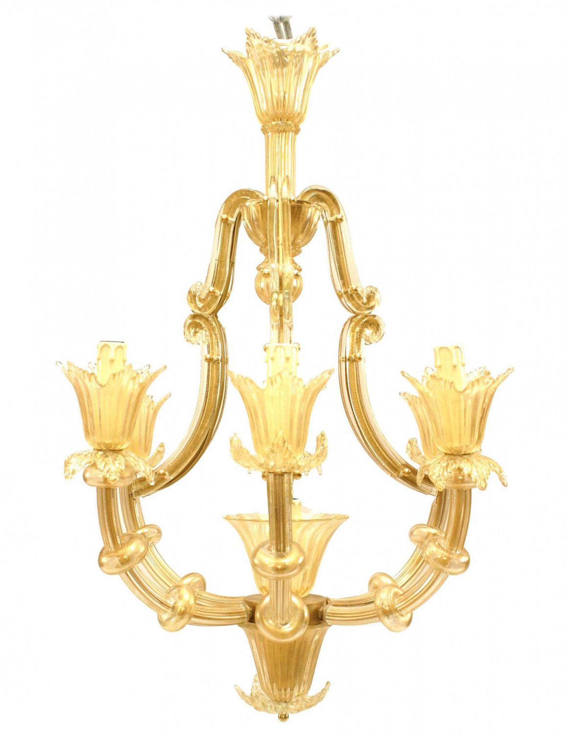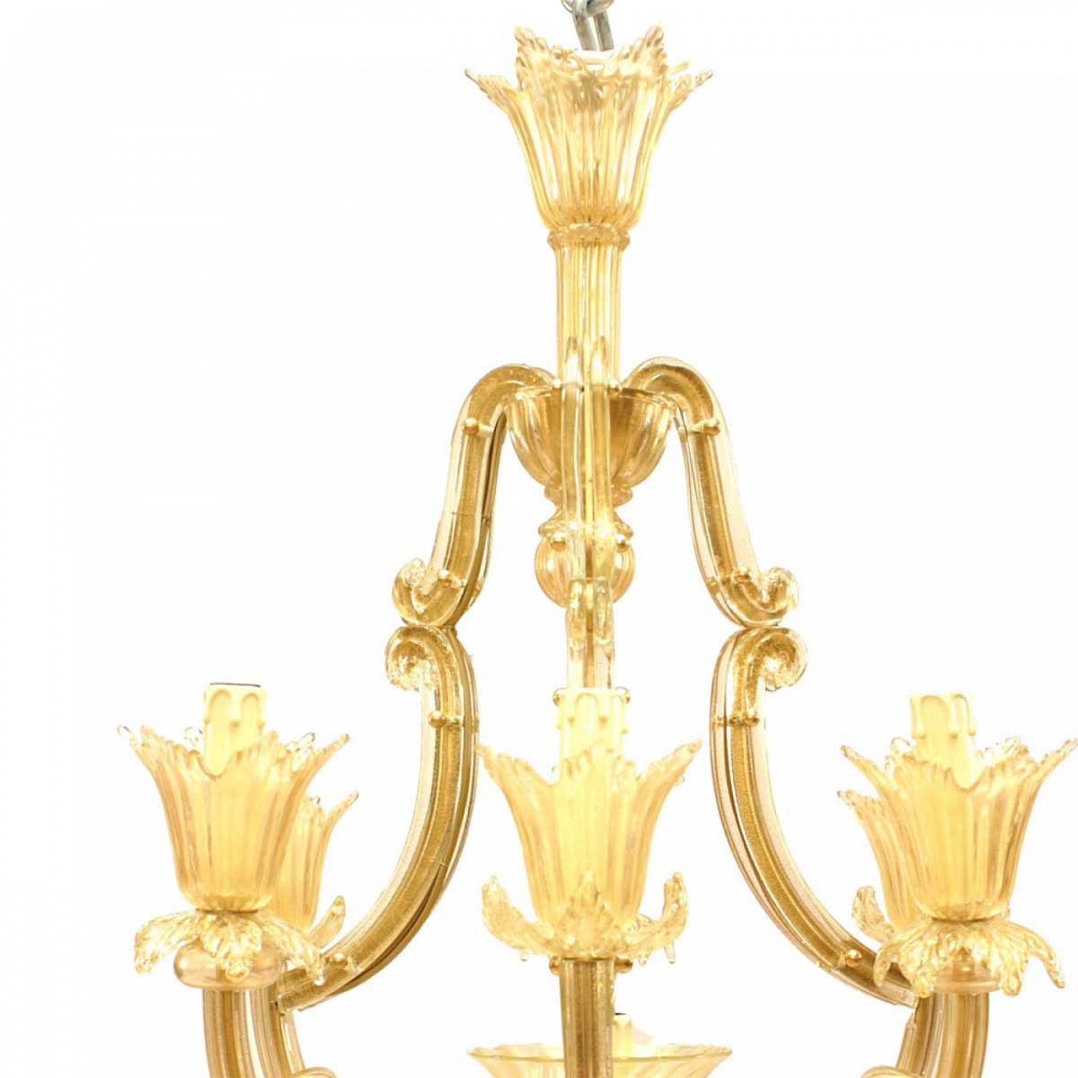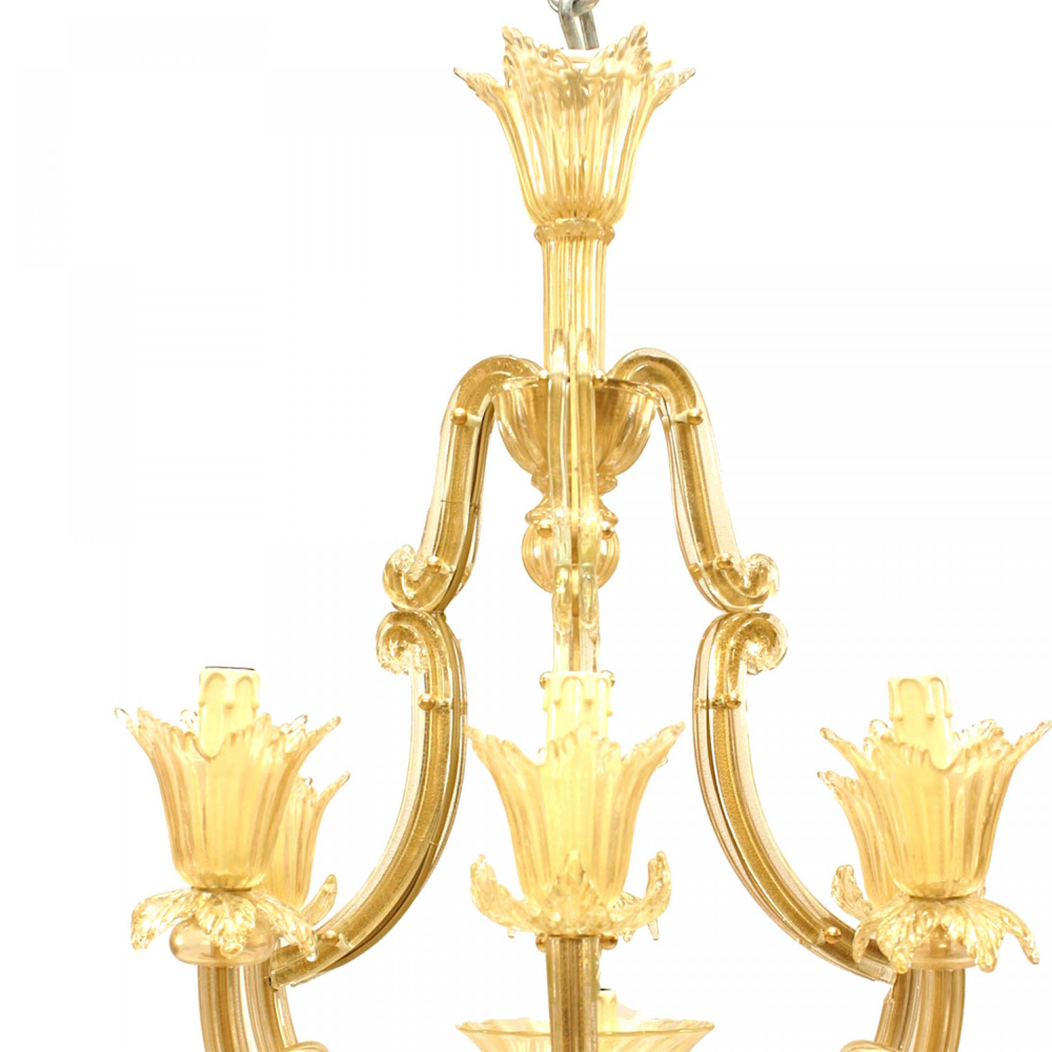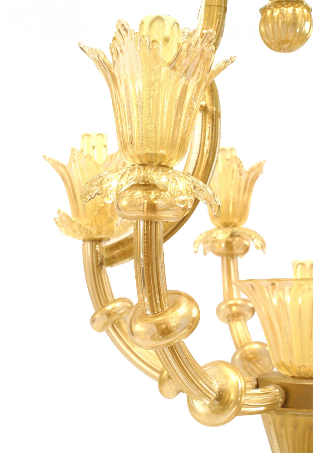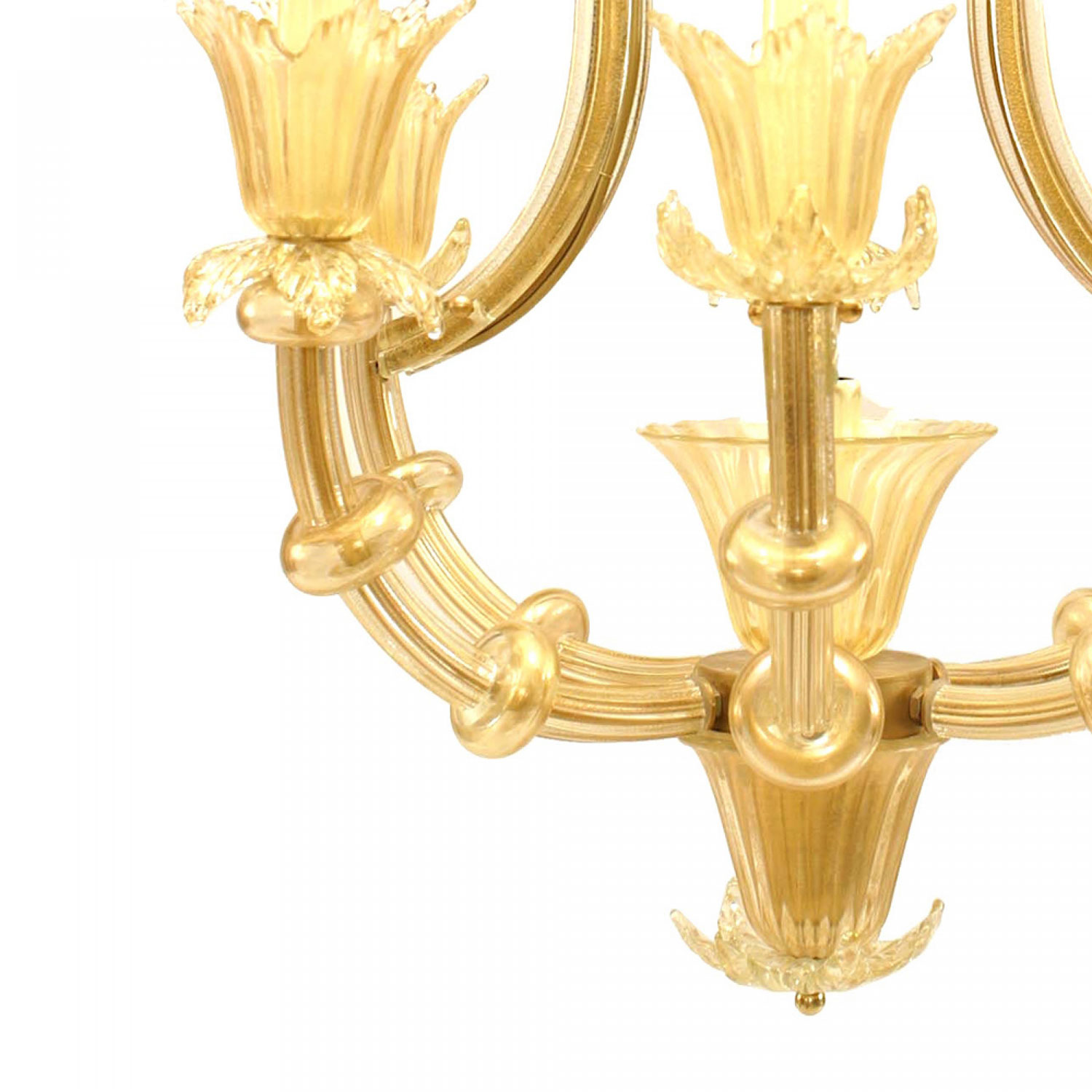 2 Italian Venetian Murano gold dusted 6 fluted "bamboo" arm chandelier with flower bobeche & cup and three scroll arm supports rising from a 7th central light.
