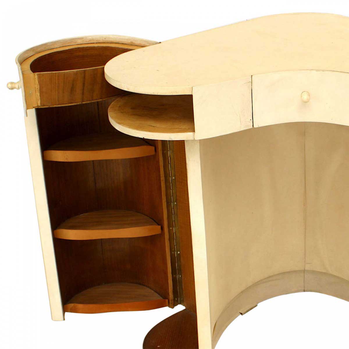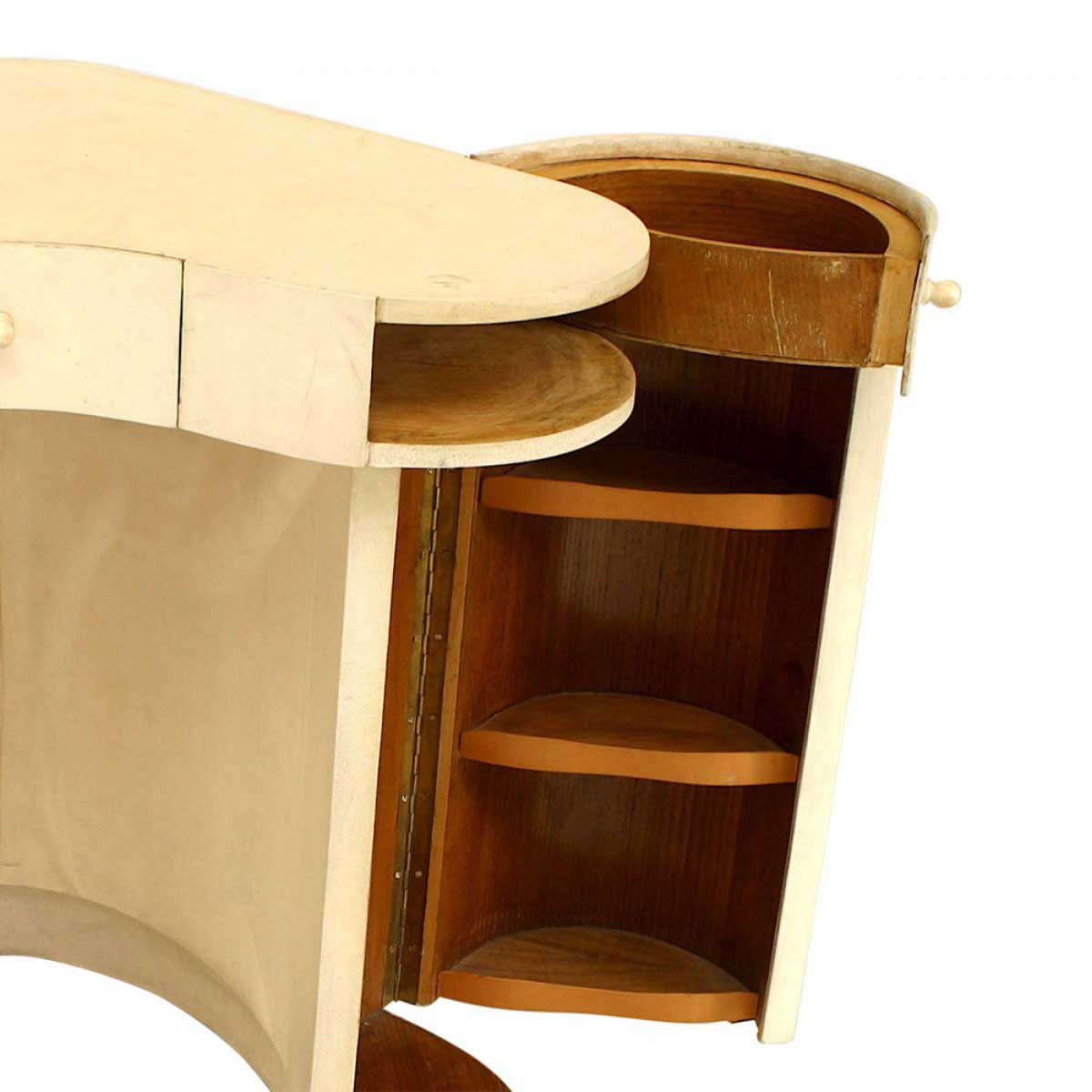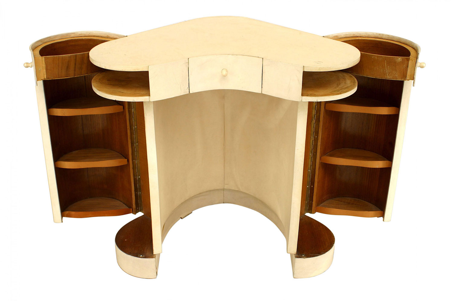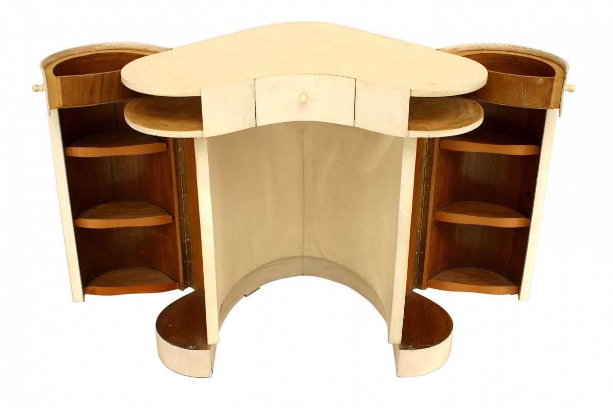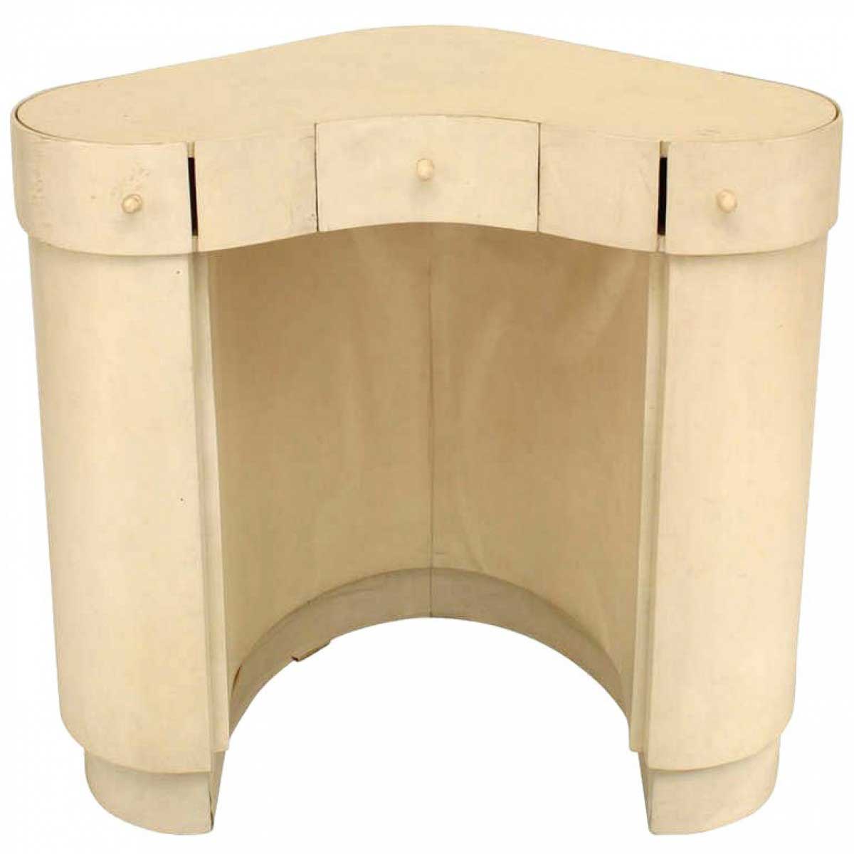 Italian Art Deco white parchment diminutive triangular form lady's vanity /dressing table with a drawer centered by 2 side drawers and 2 doors.