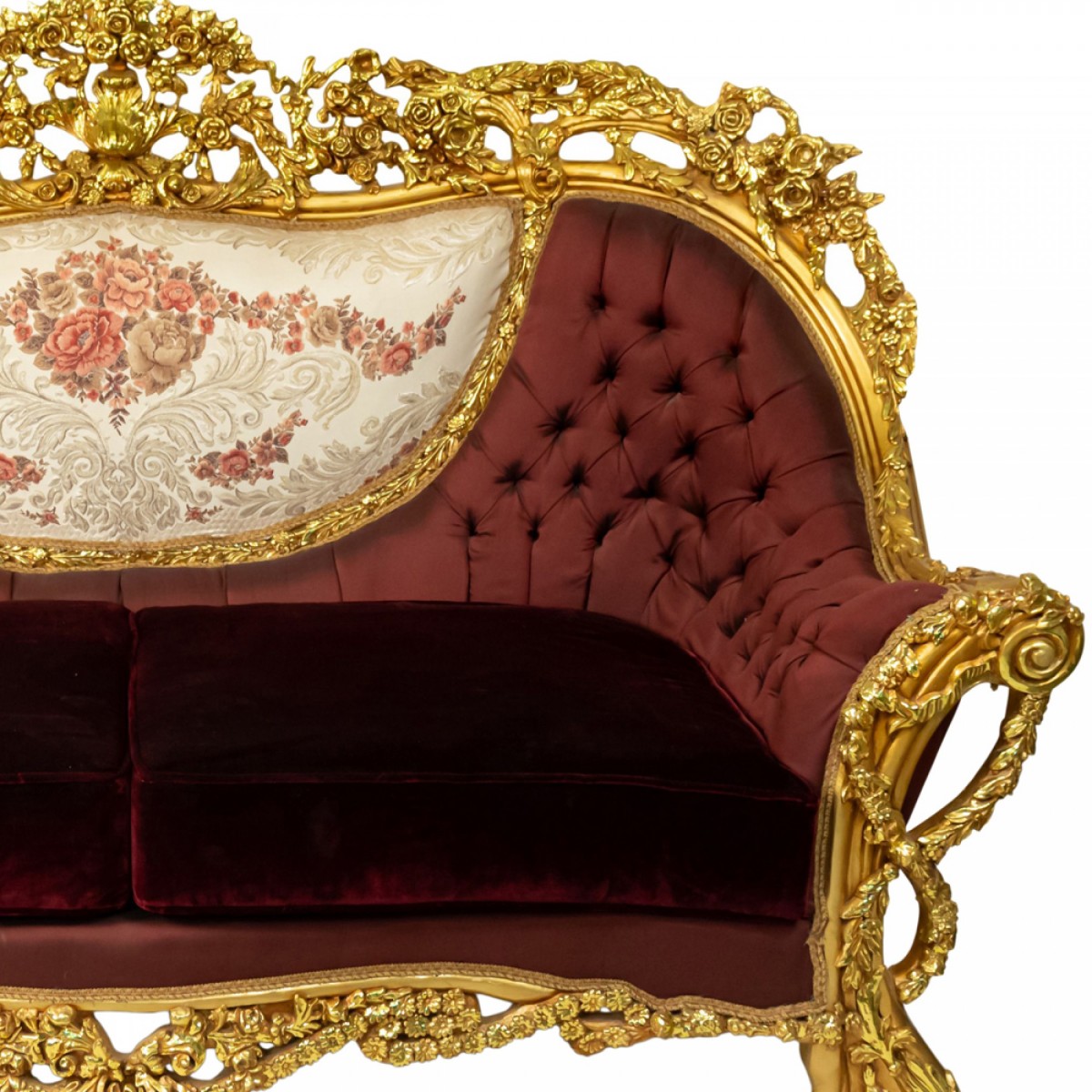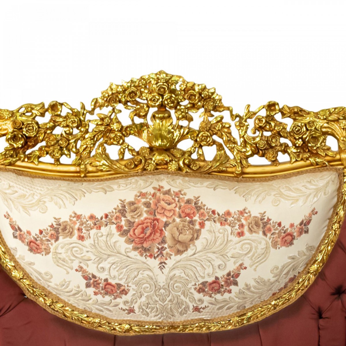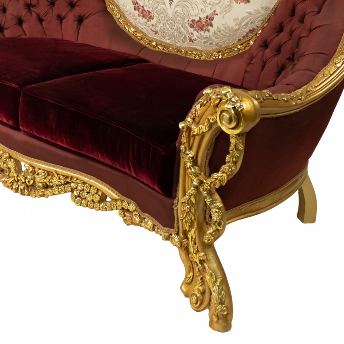 Italian Baroque style 20th c. settee with gilt wood filigree frame & burgundy & cream button-tufted upholstery with embroidered flowers (Matching settee: AGO054, arm chairs: AGO053, AGO057, 7 pc set: AGO053A)