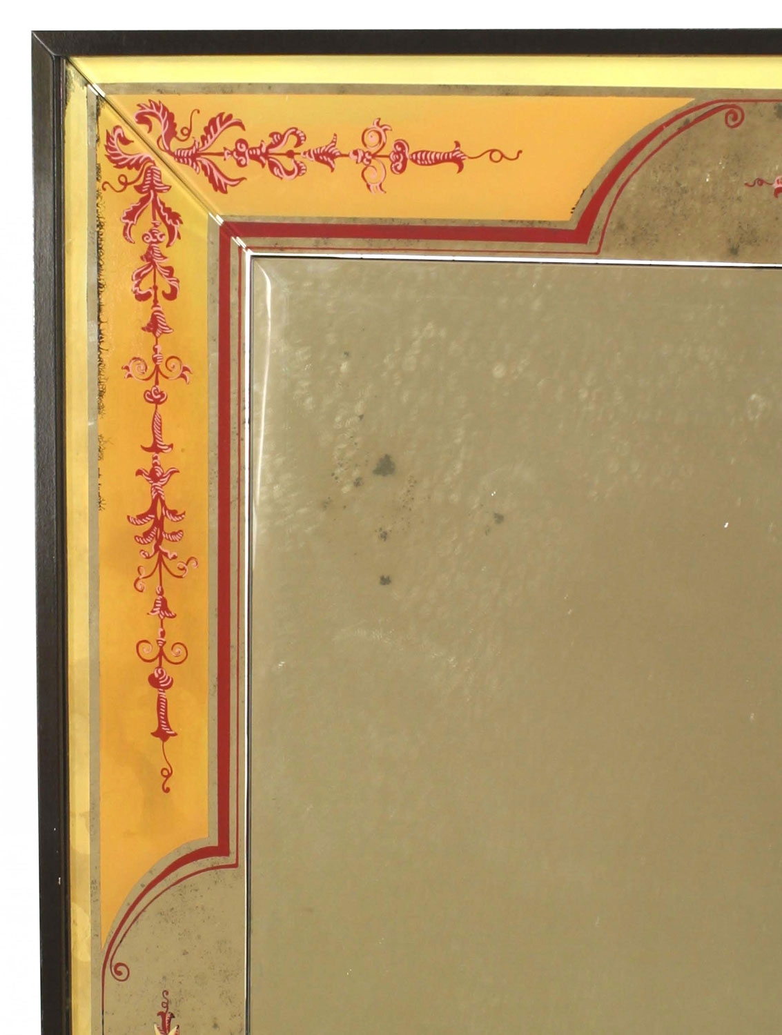 Italian Mid-Century rectangular wall mirror framed with a beige and purple decorated eglomise floral and scroll design border in a black metal frame.