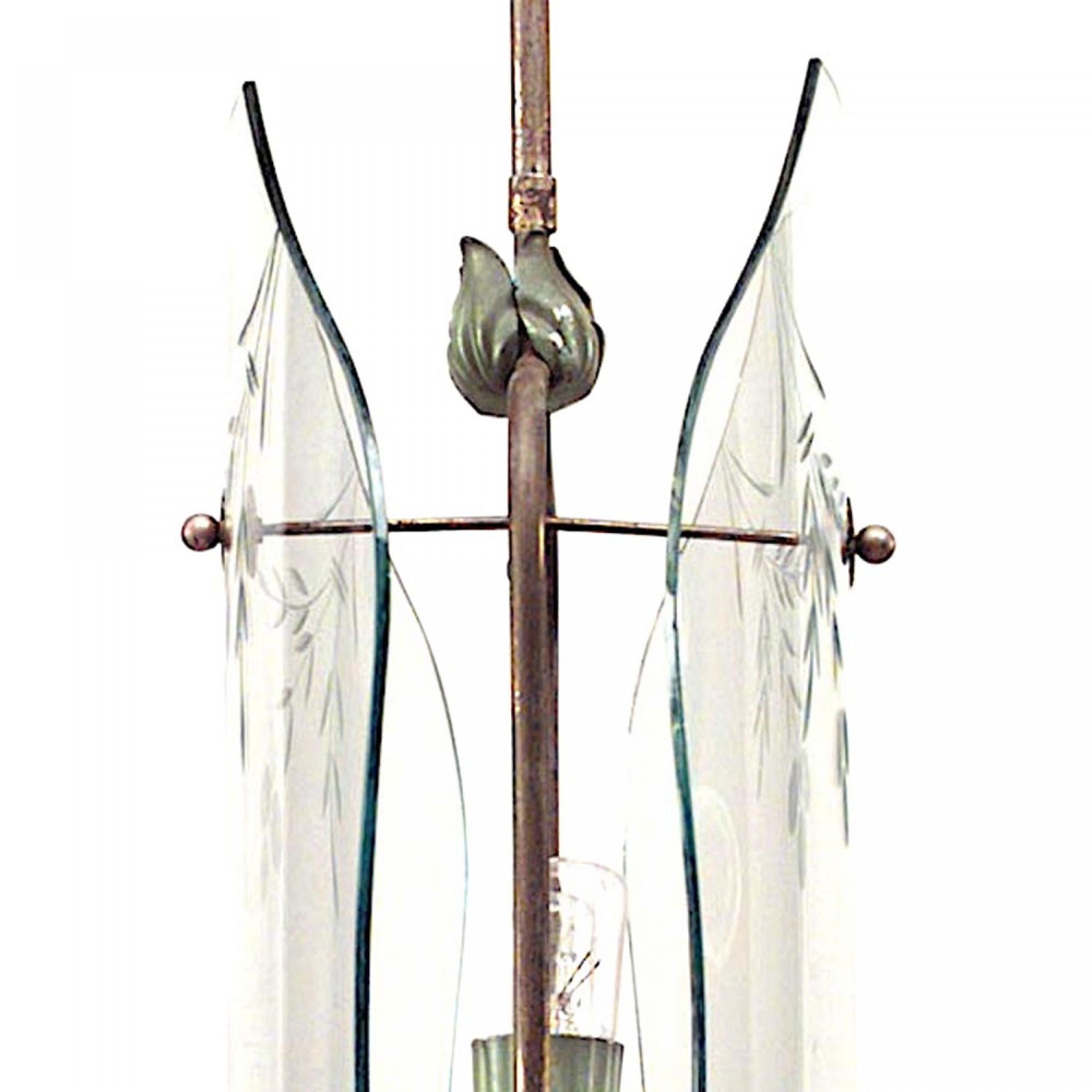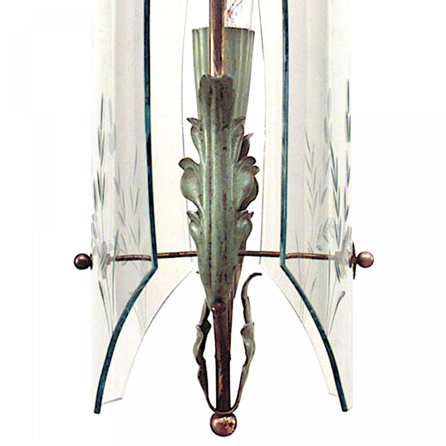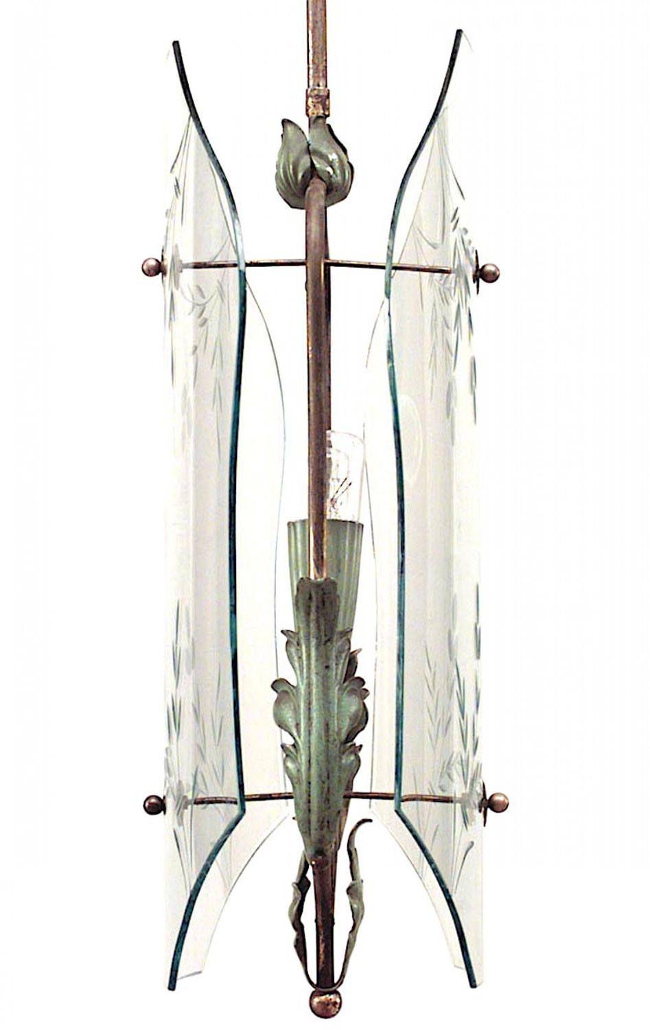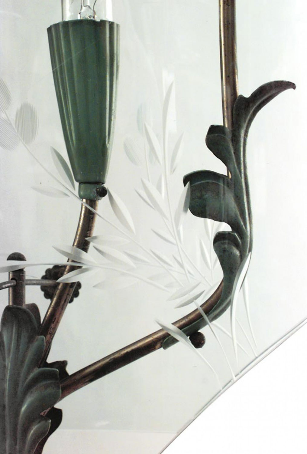 2 Italian 1940s hanging lanterns with 2 green metal leaf design arms between 2 shaped floral etched glass panels canopy. (FONTANA ARTE; designed attributed: PIETRO CHIESA) (PRICED EACH).