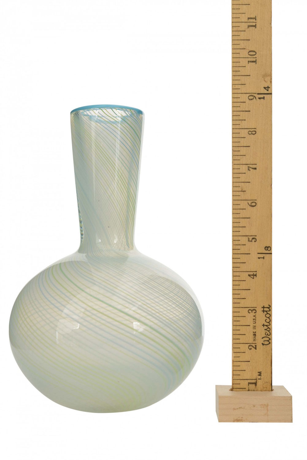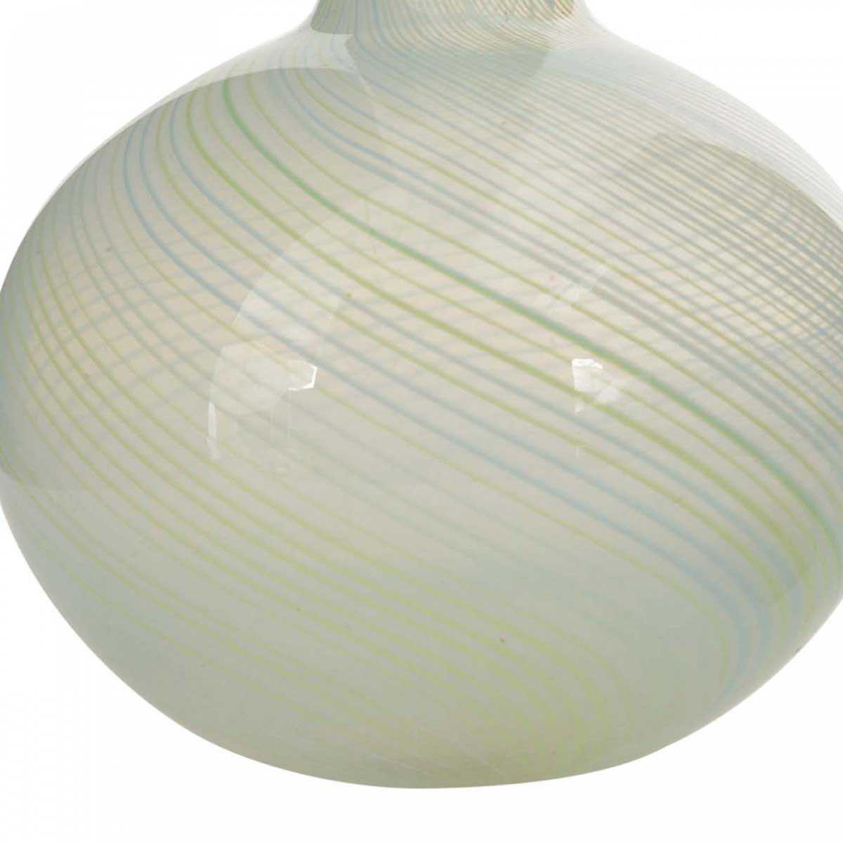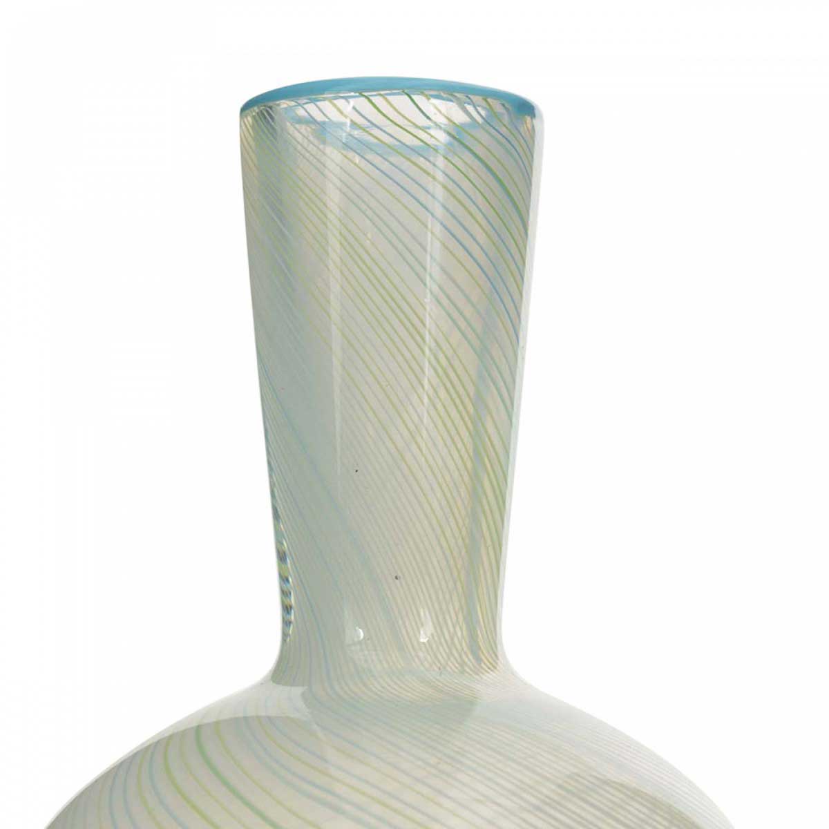 Mid-Century Italian bulbous-shaped art glass bud vase with a tapered neck, a light blue rim and a swirl design in light blue and light green