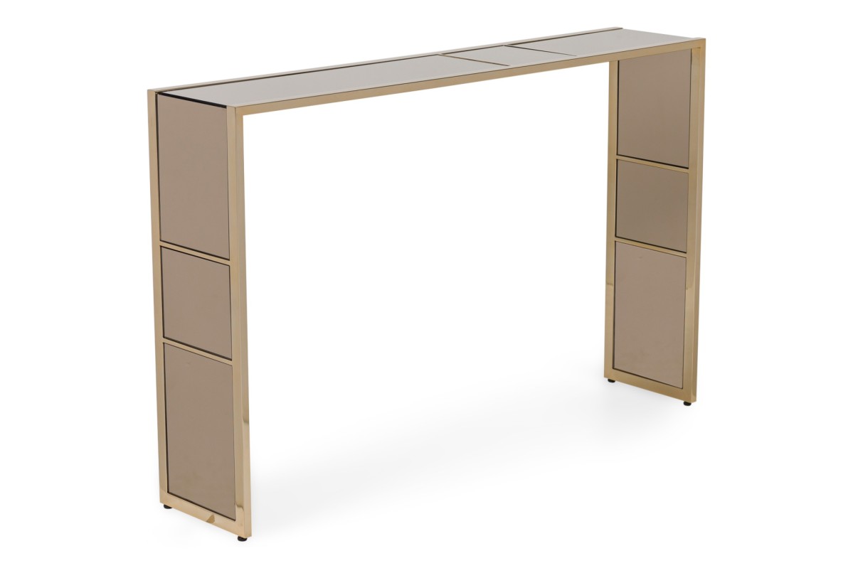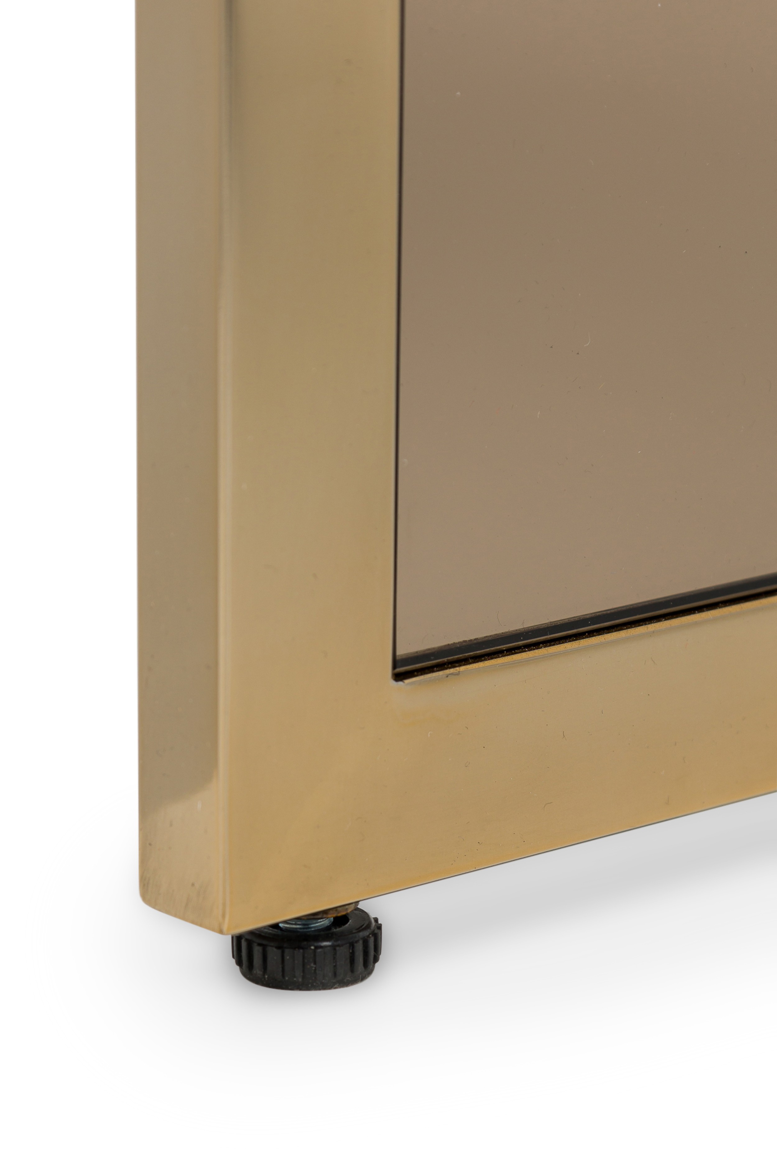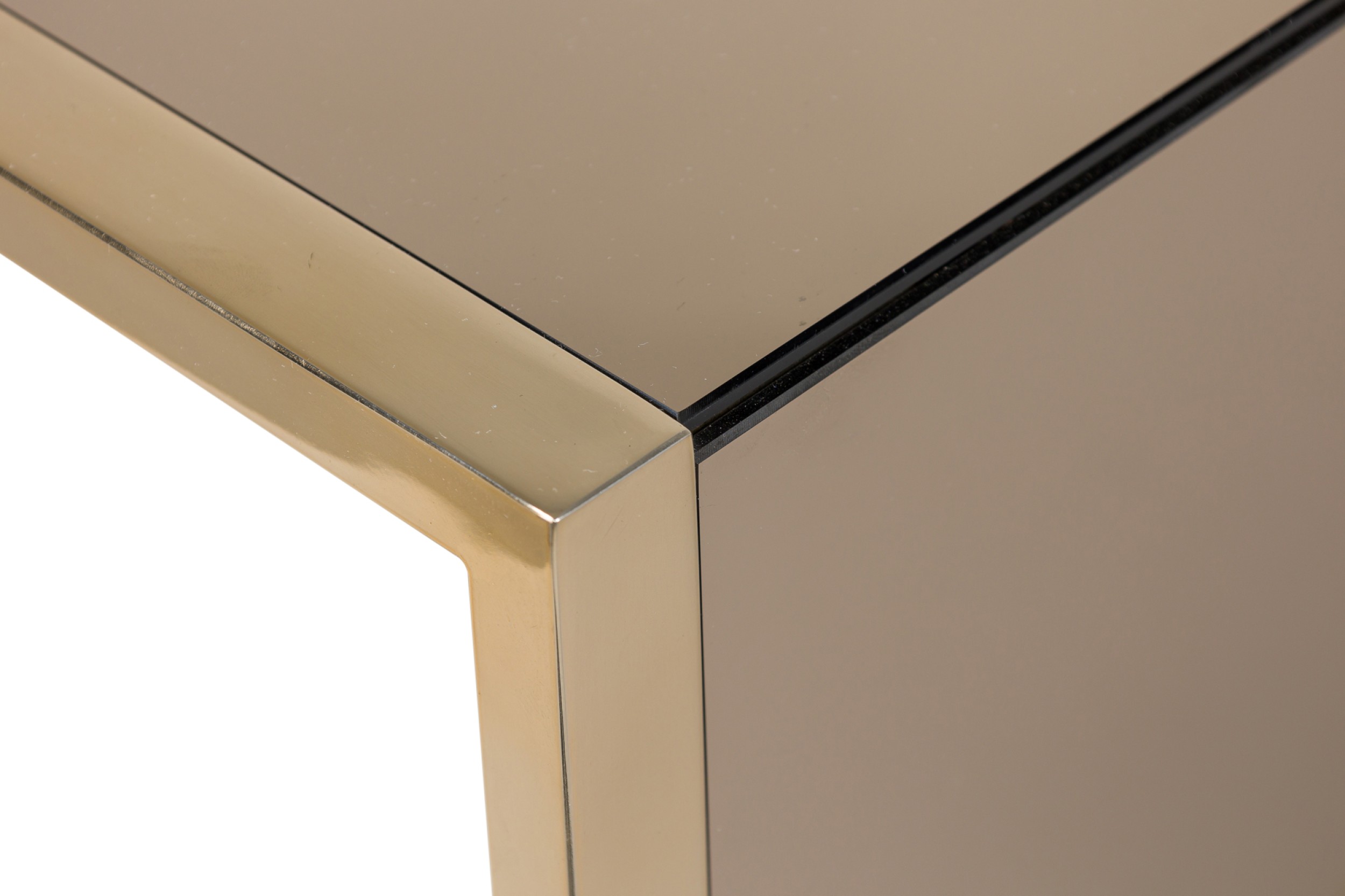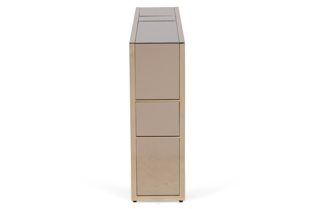 Italian Contemporary burnished stainless steel console table with smoked mirror panels (matching smaller consoles: NWL6019; benches: NWL6018)