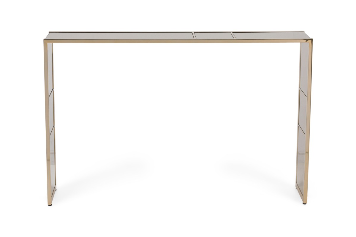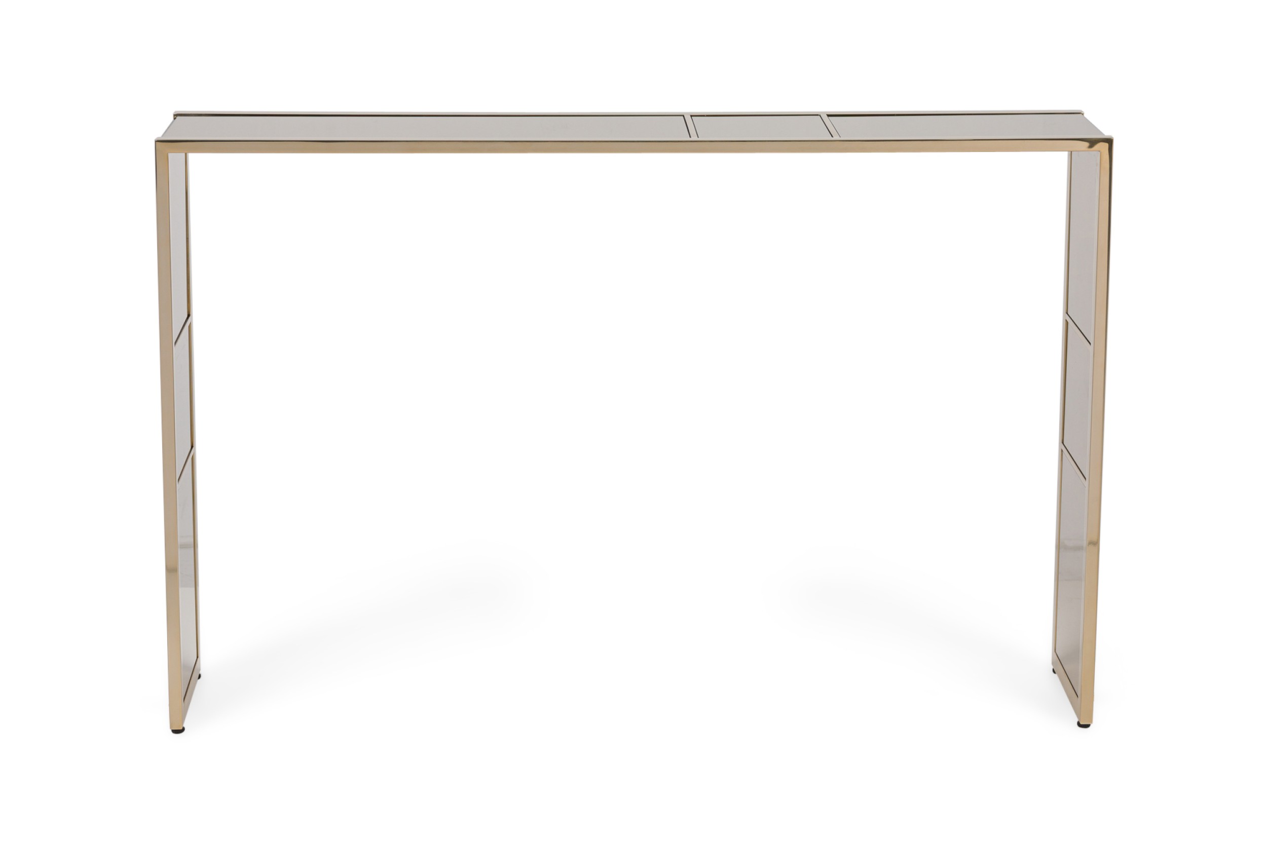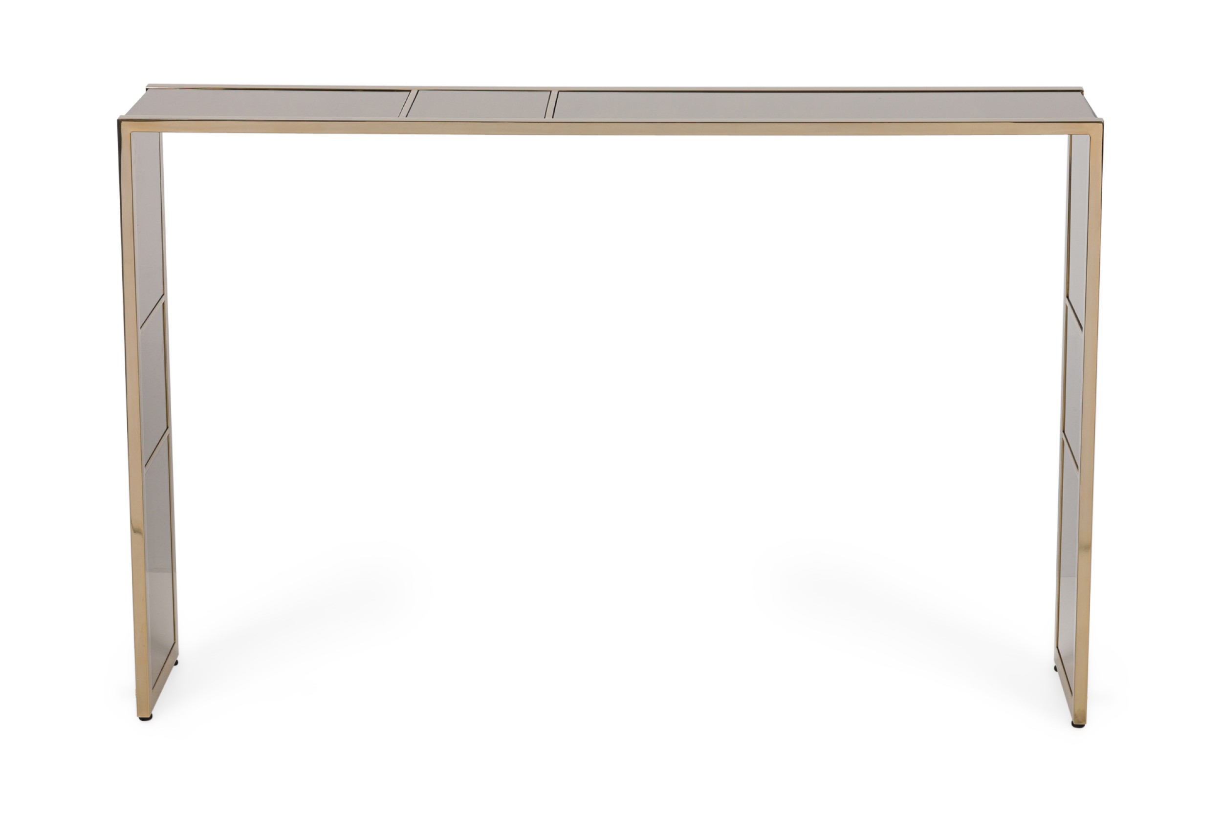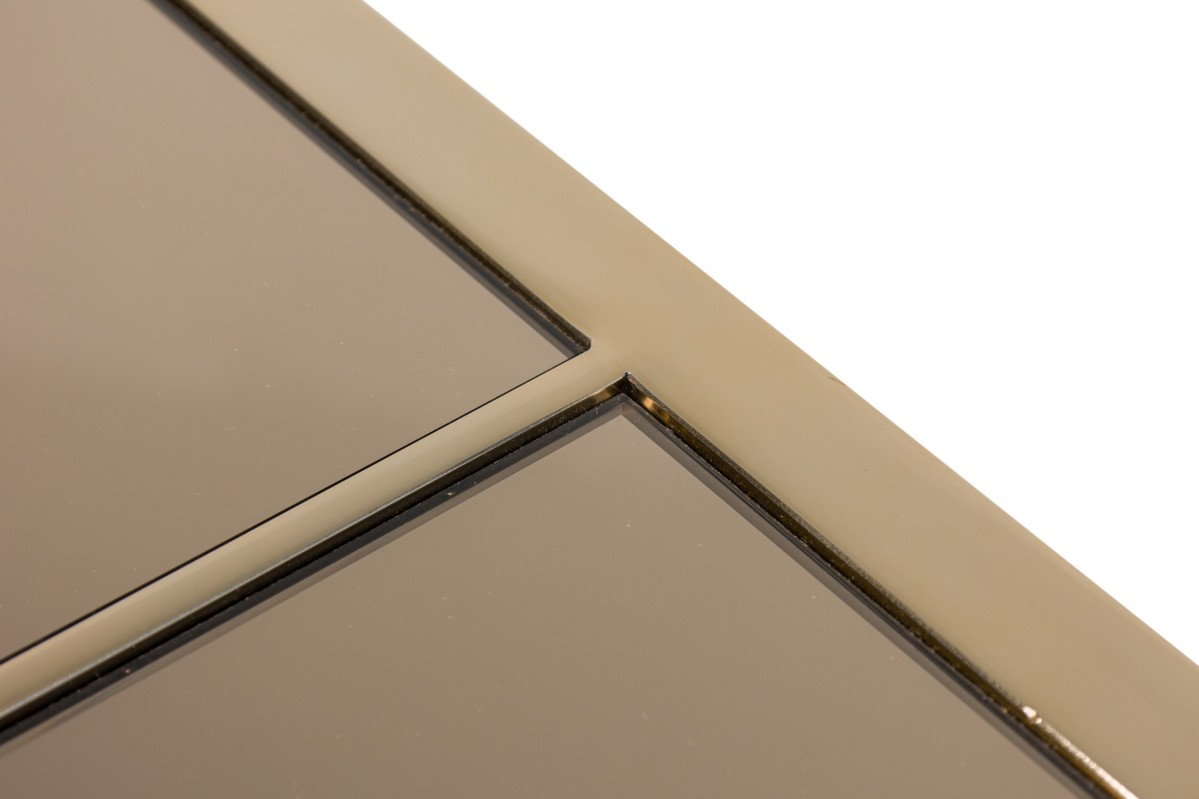 Italian Contemporary burnished stainless steel console table with smoked mirror panels (matching smaller consoles: NWL6019; benches: NWL6018)