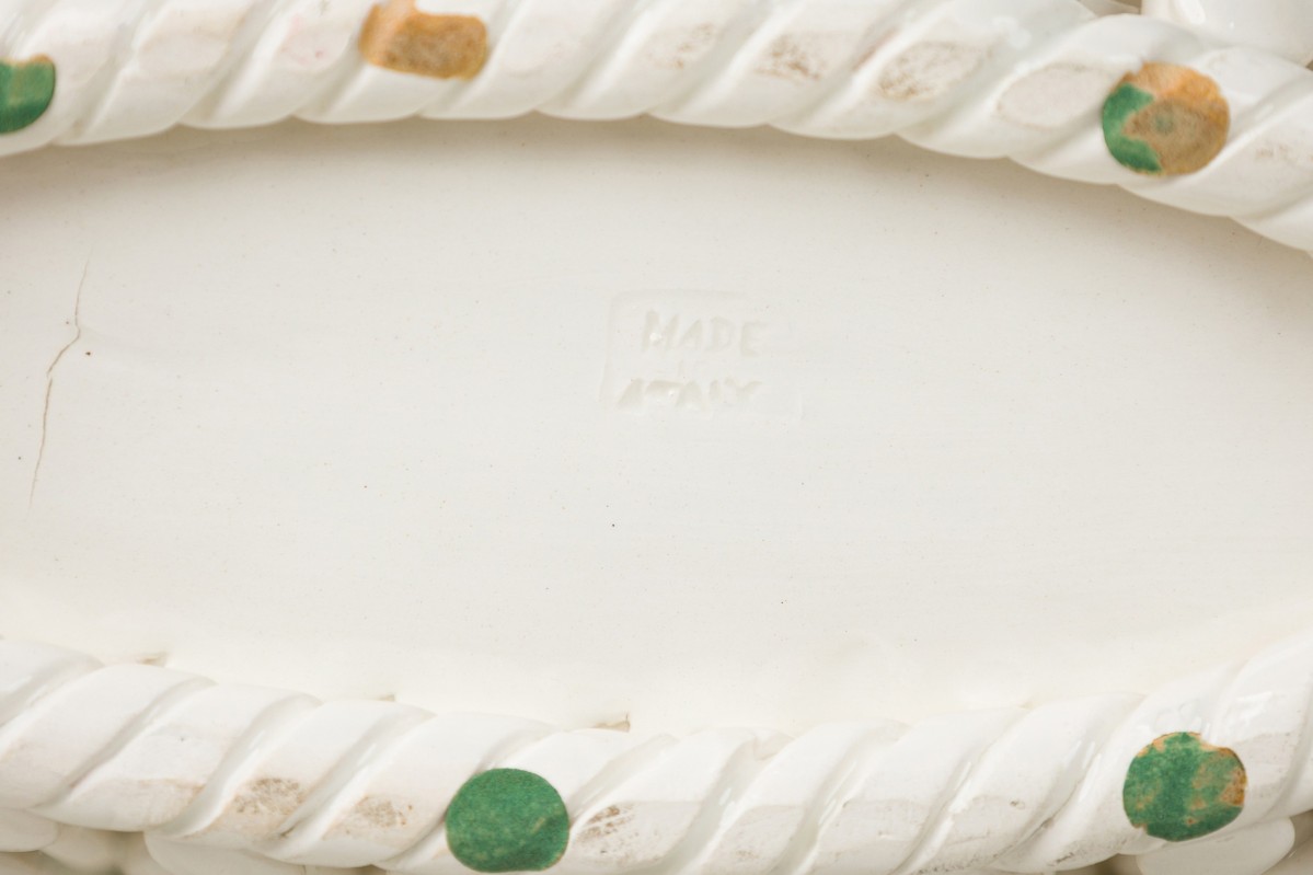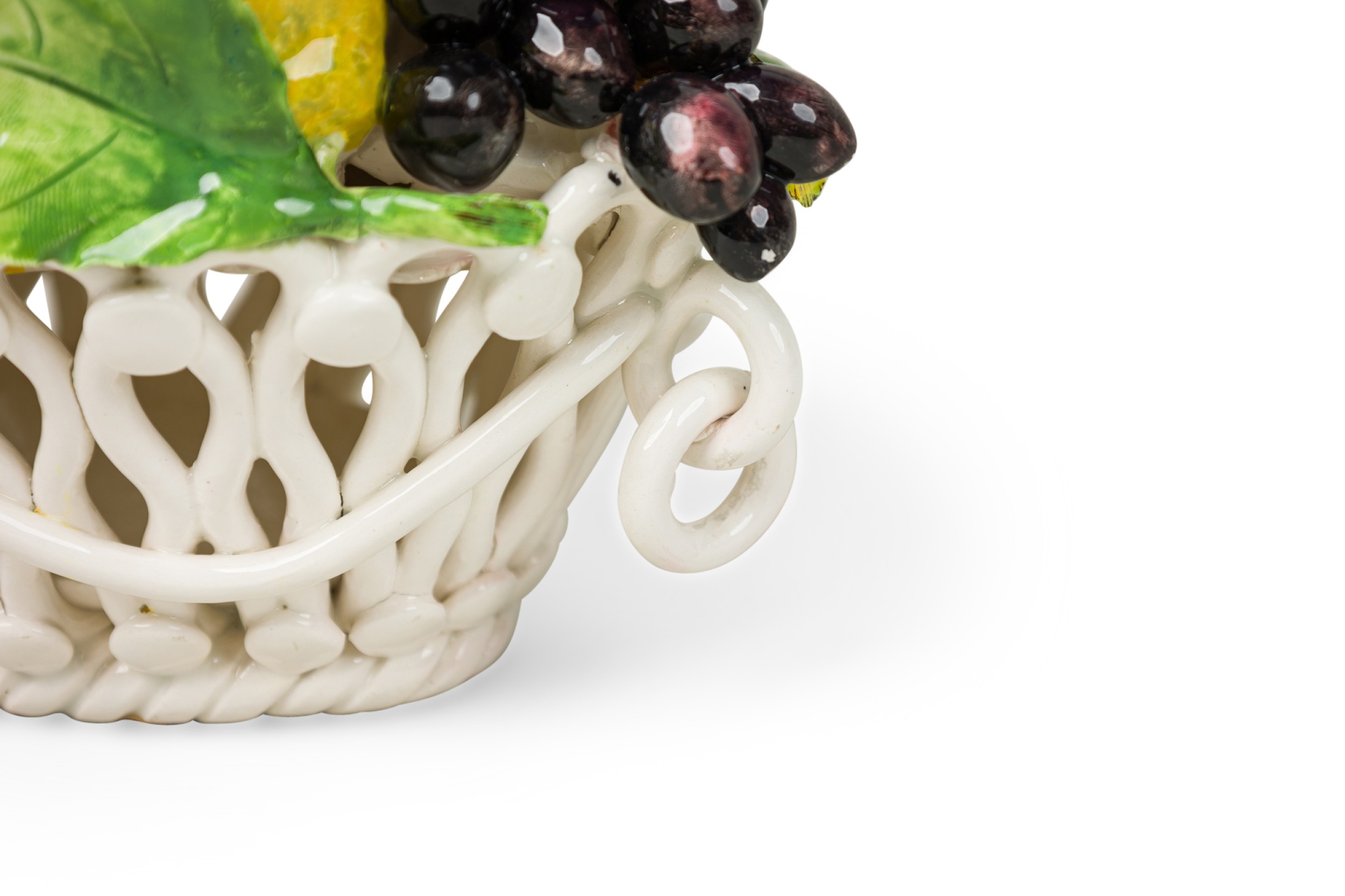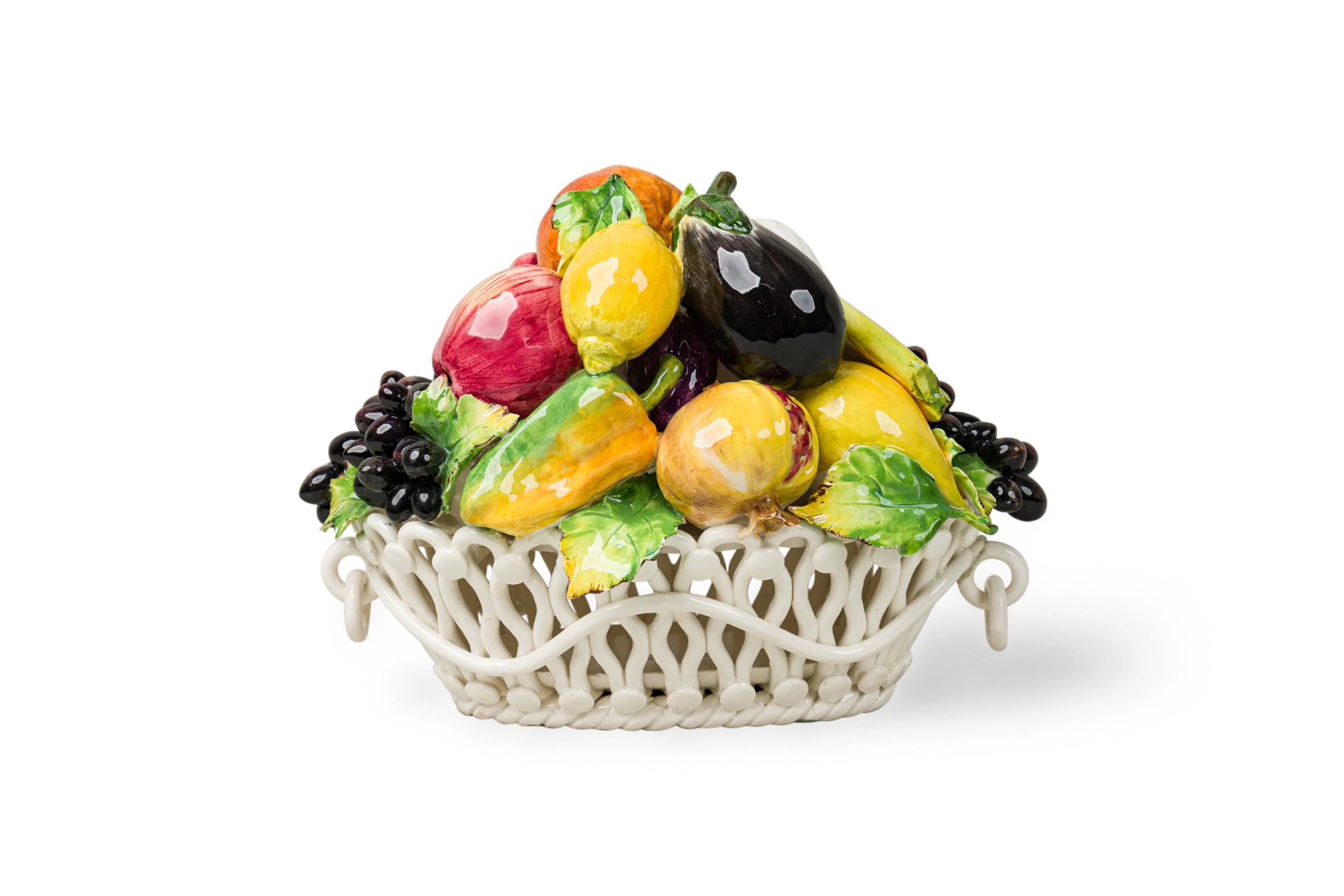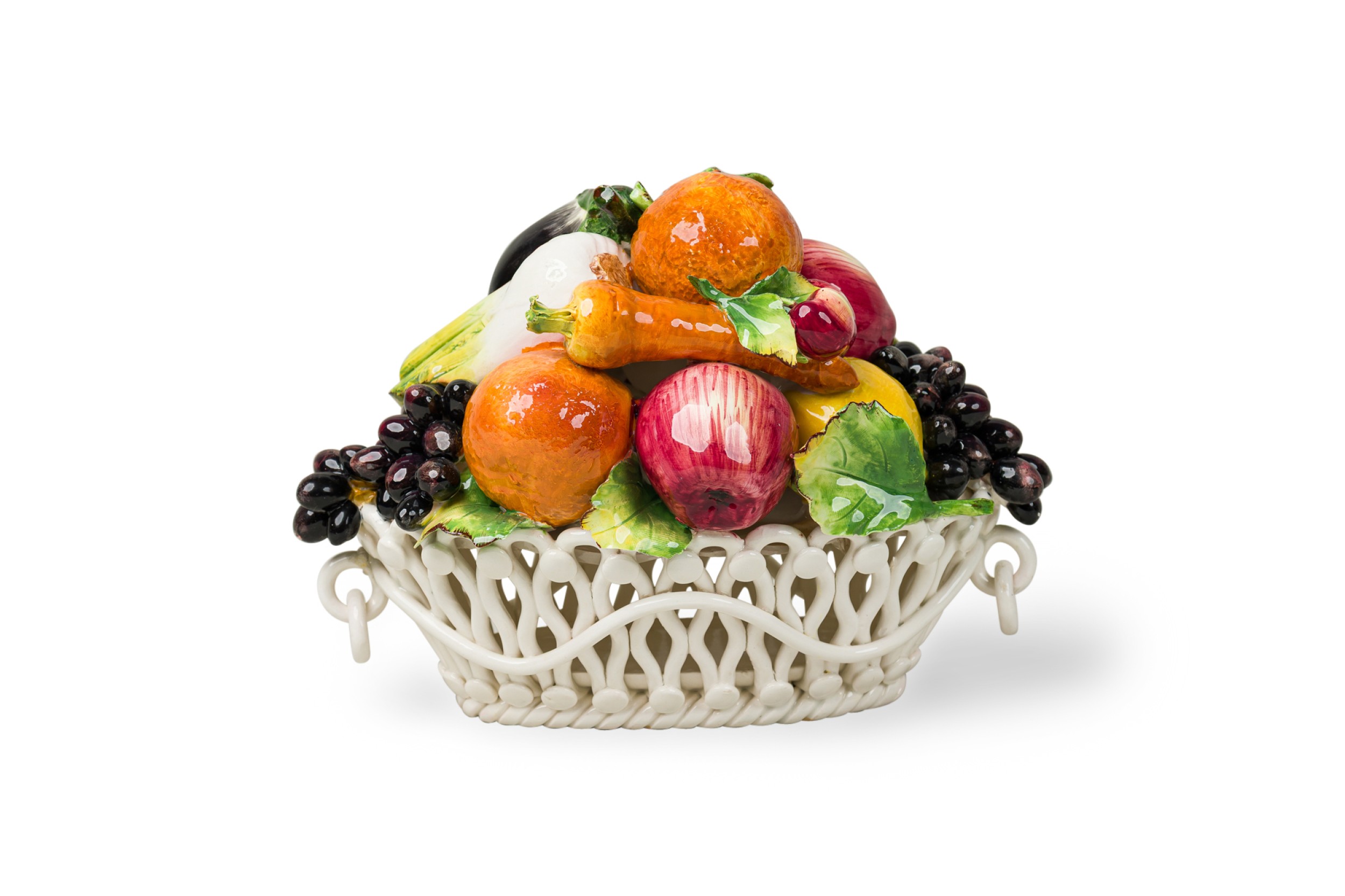 Italian Mid-Century Majolica Capodimonte porcelain fruit and vegetable basket with circular handles on an oval woven form base