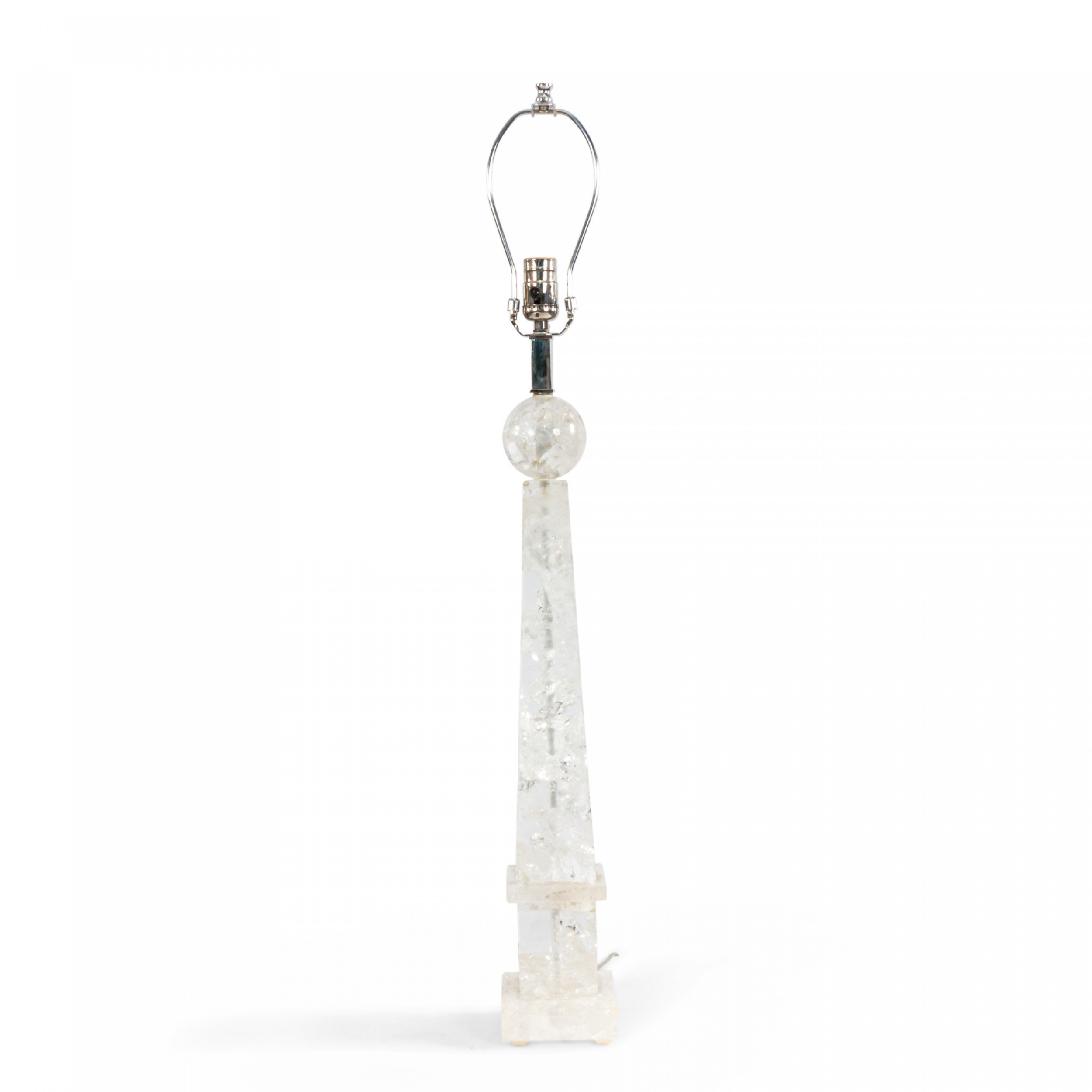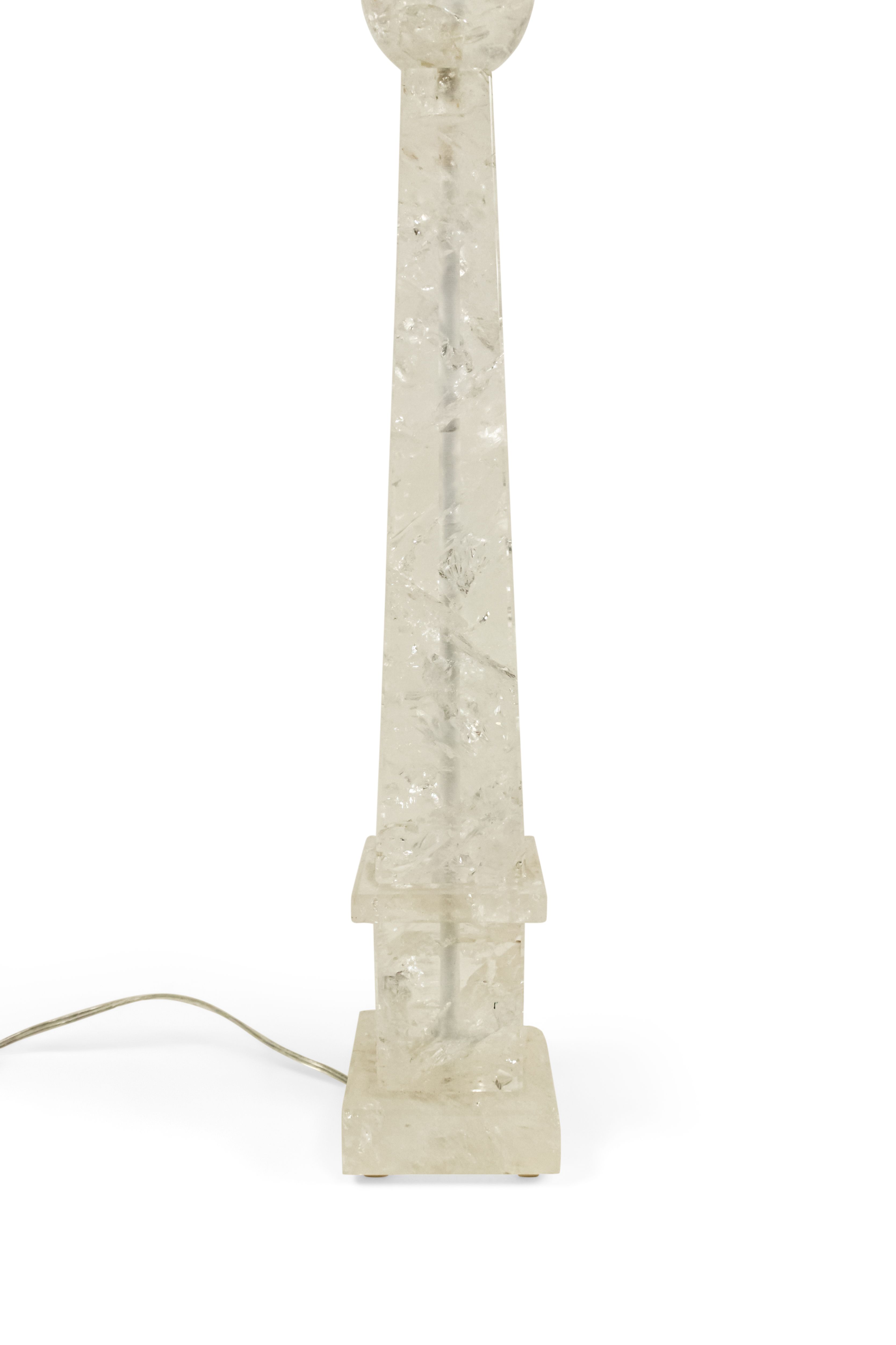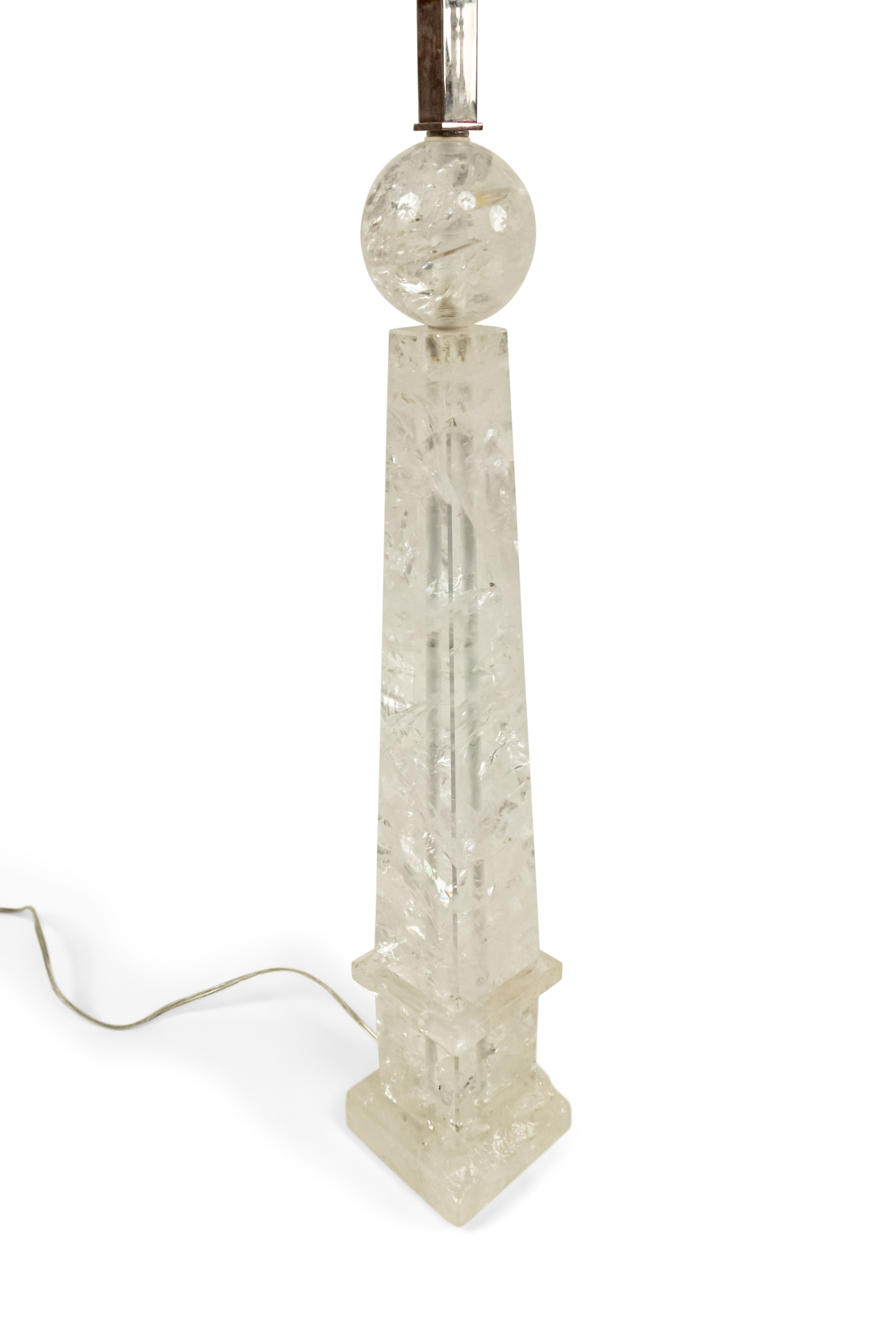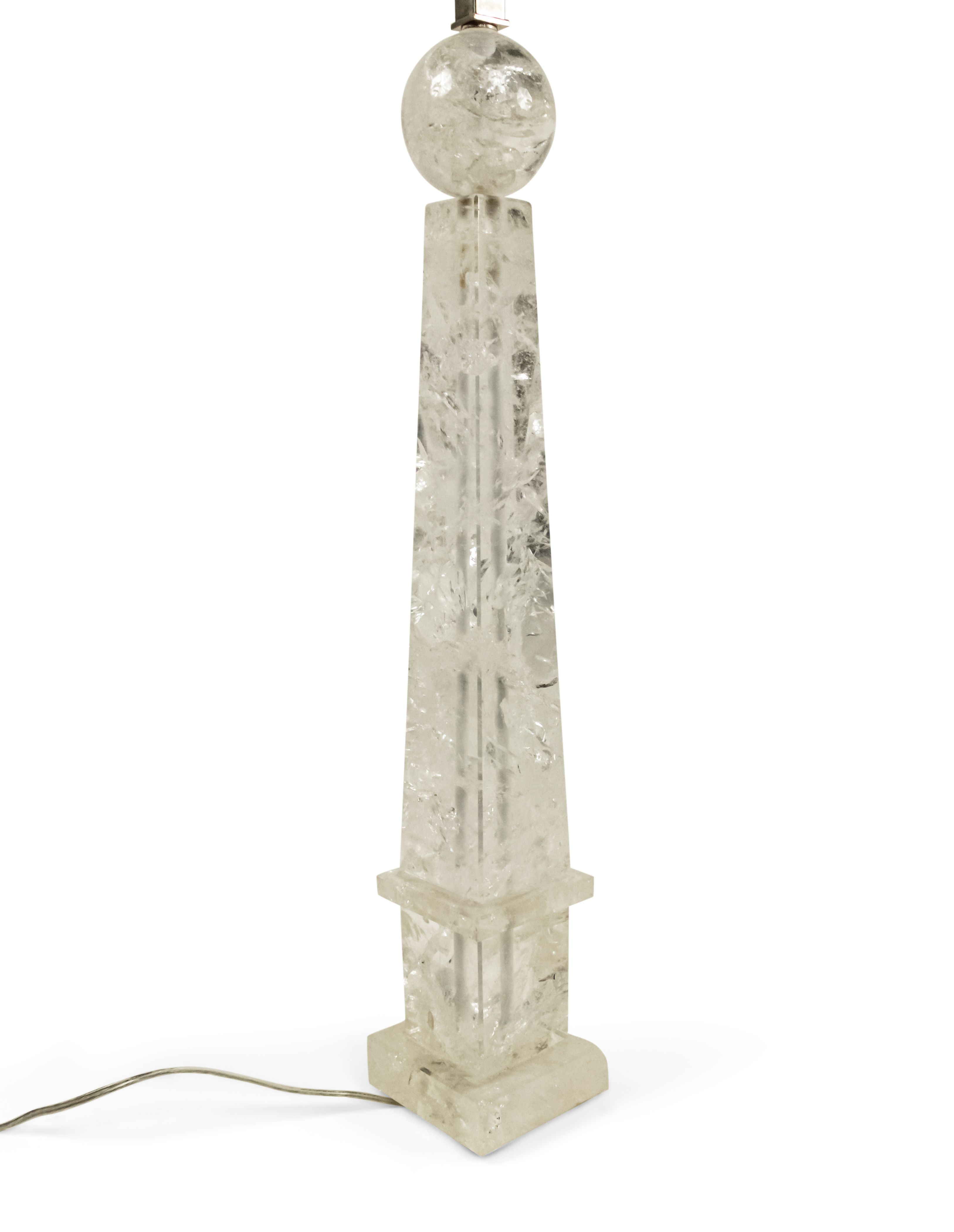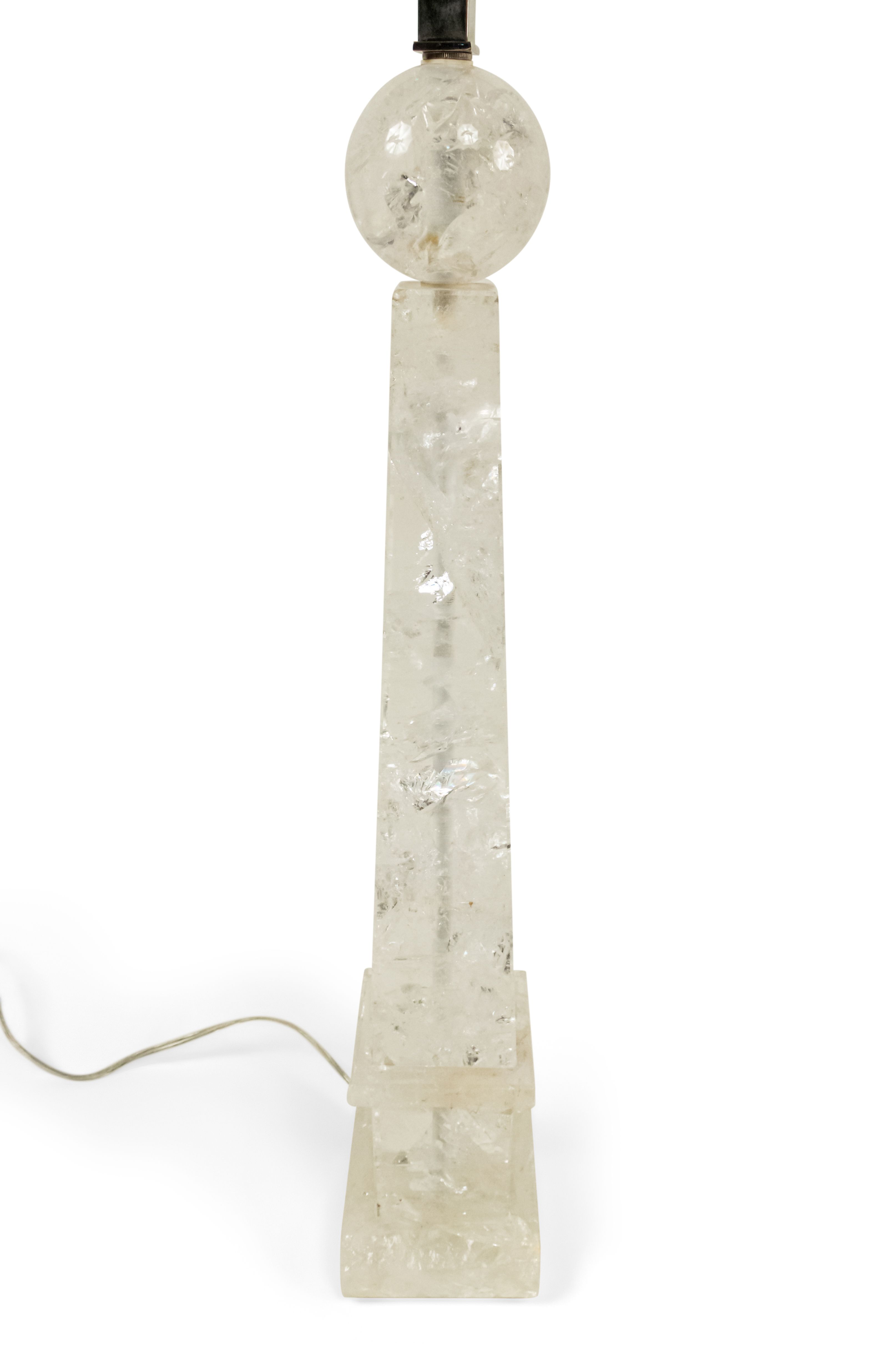 2 Italian 1940s style (modern) rock crystal table lamps in the form of an obelisk supporting a sphere (PRICED EACH)