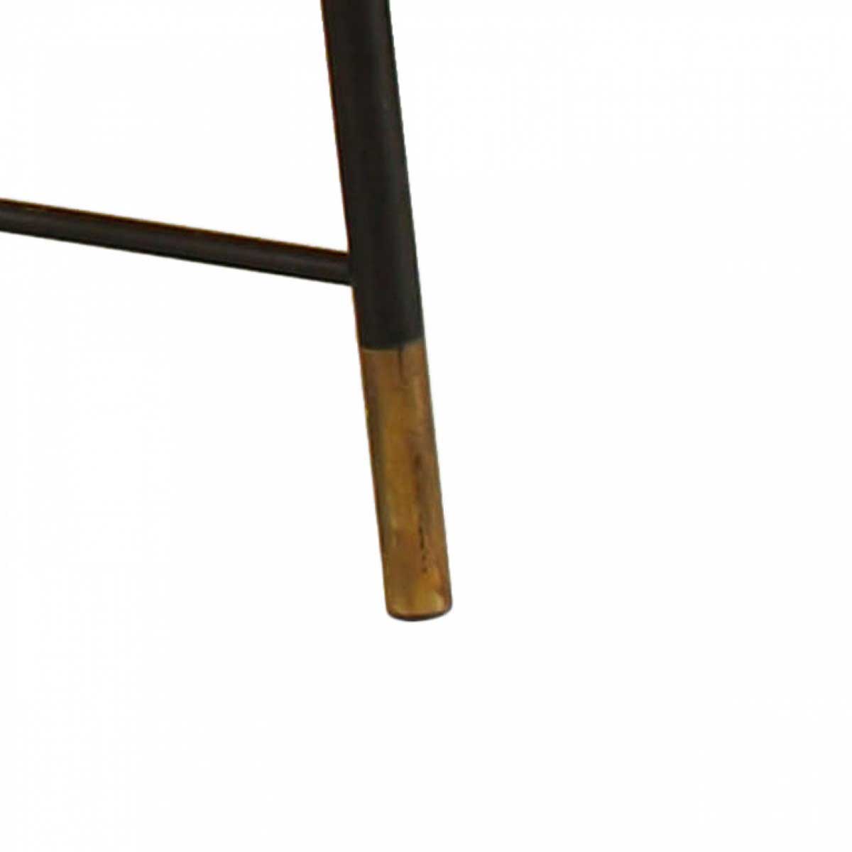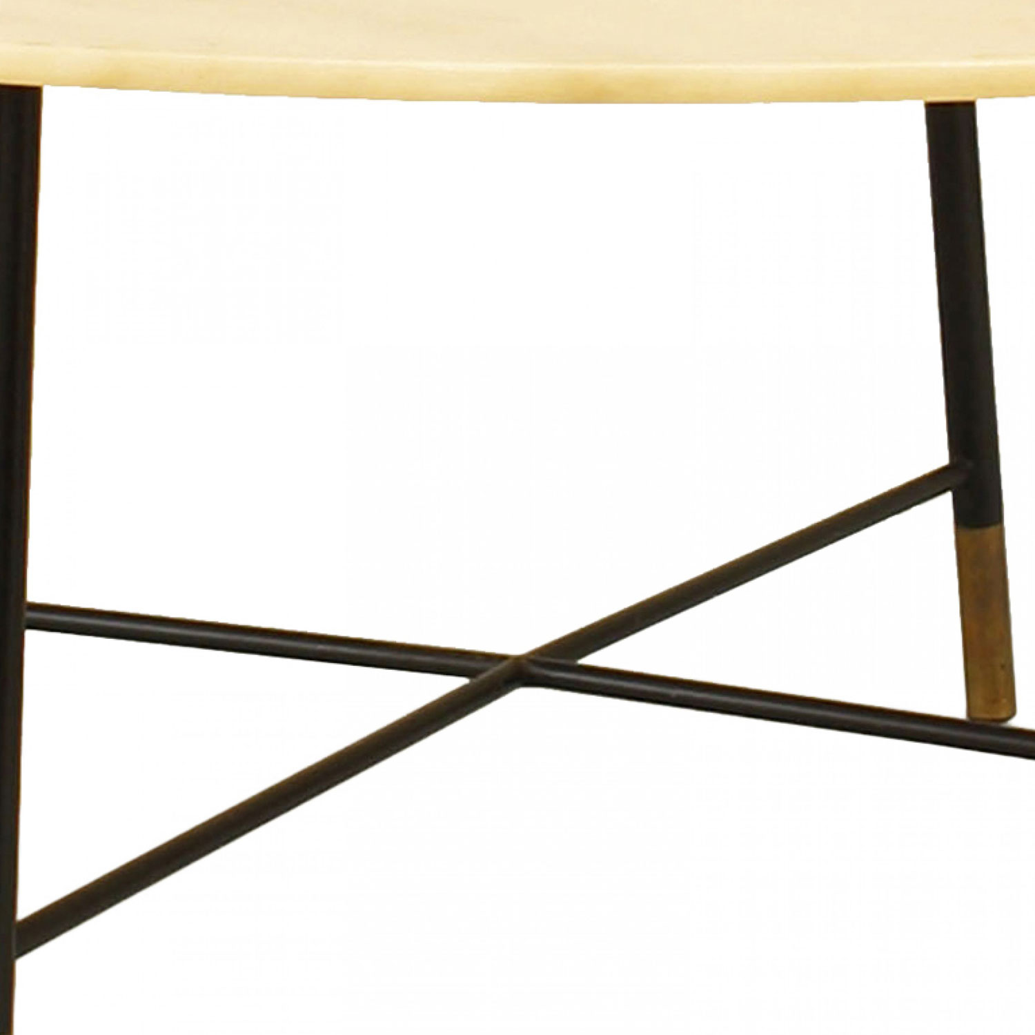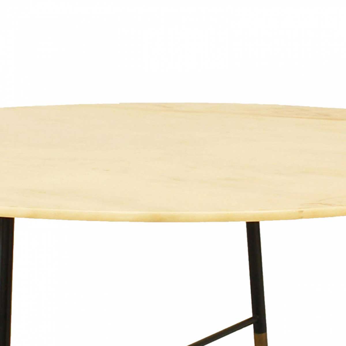 Italian Mid-Century Modern coffee table with a round light yellow marble top and four ebonized metal legs with brass feet and a stretcher base. (attributed to ICO PARISI)