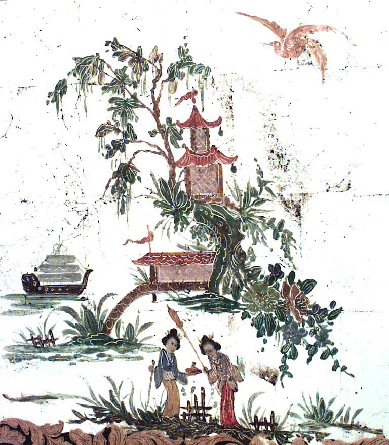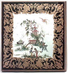 Italian (1940s) square mirrored coffee table with reverse painted Chinoiserie scene on top and floral design border on carved scroll pedestal base.
