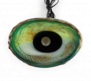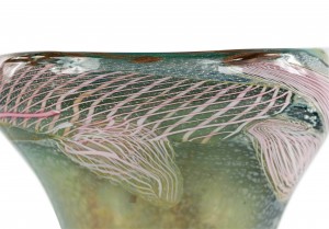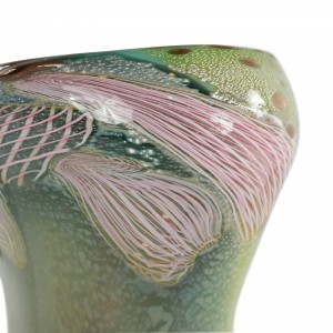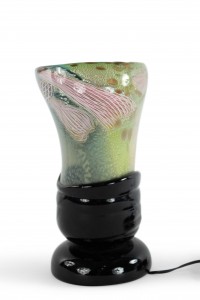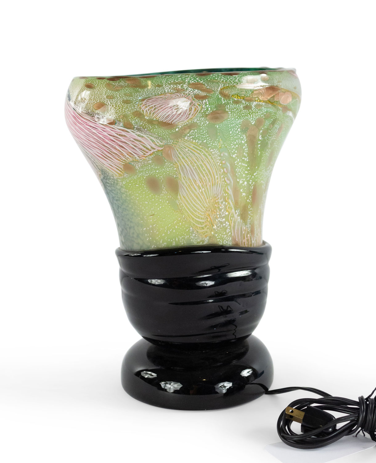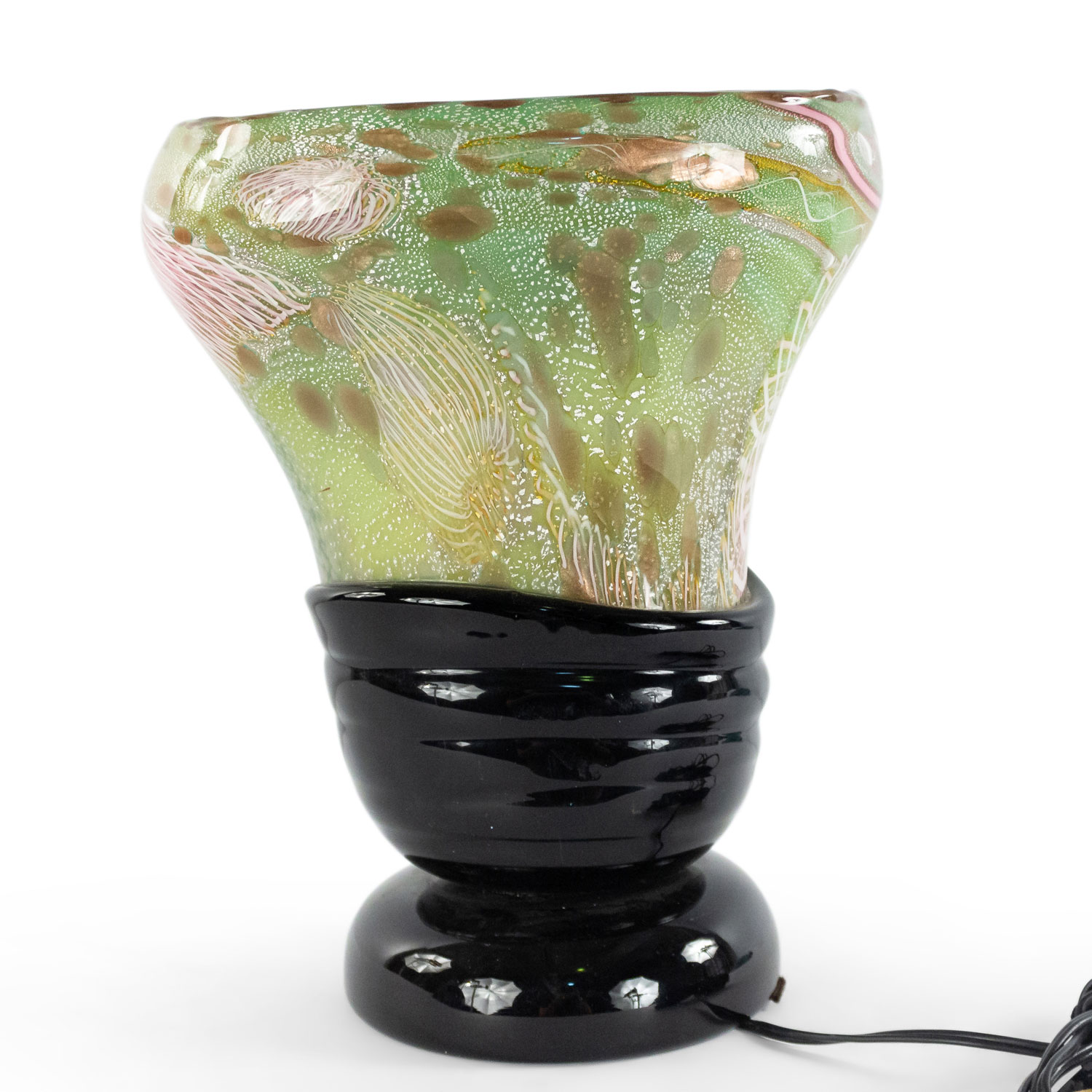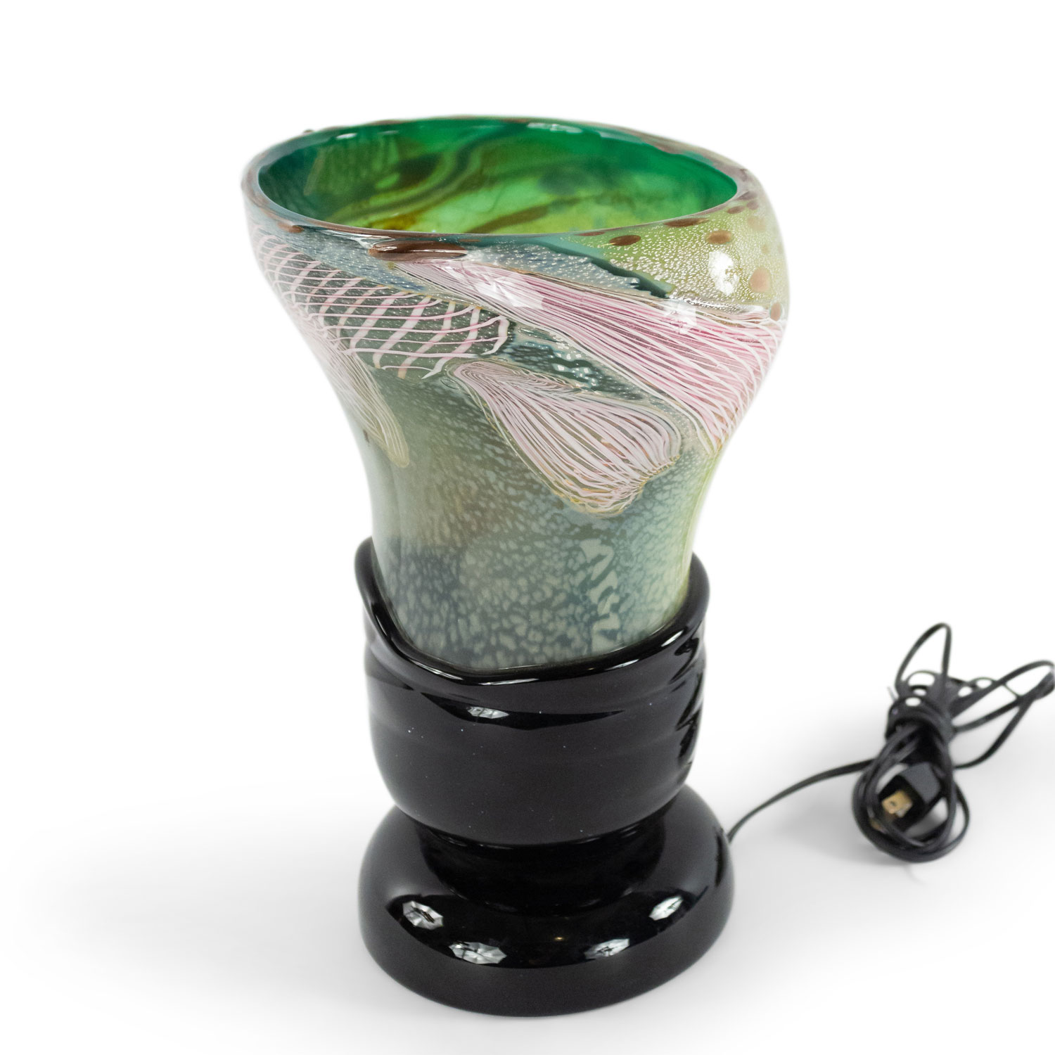 Italian 1960s Venetian Murano glass oval shaped table lamp of vase form with green, pink, and white free form design on a round applied black glass base