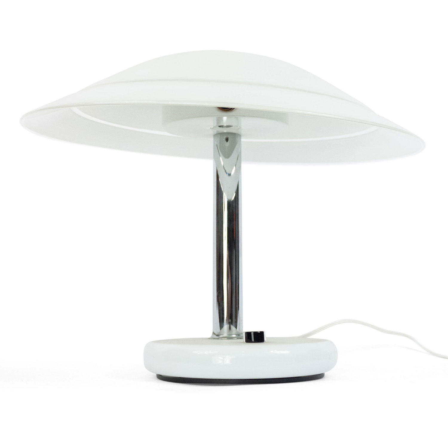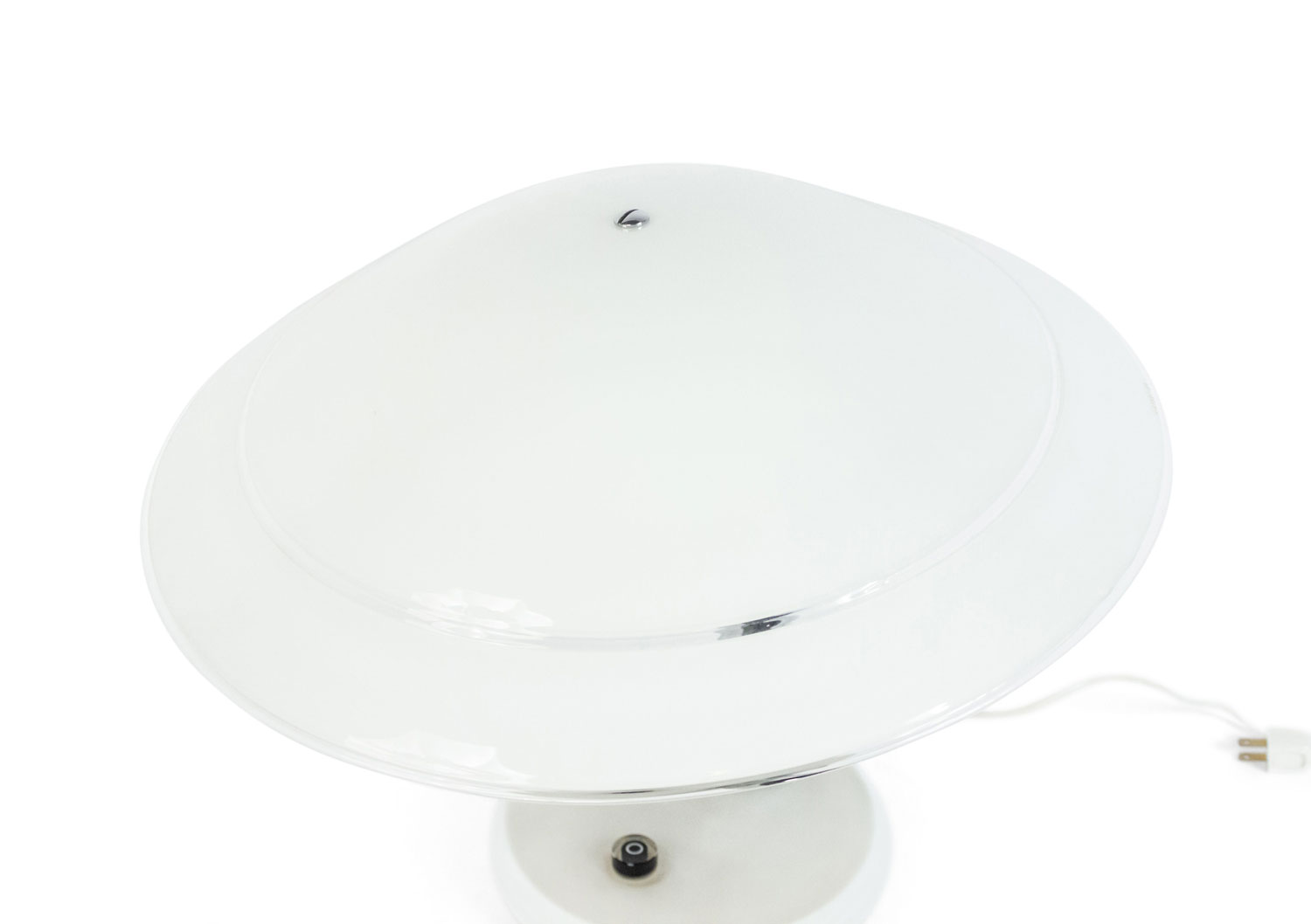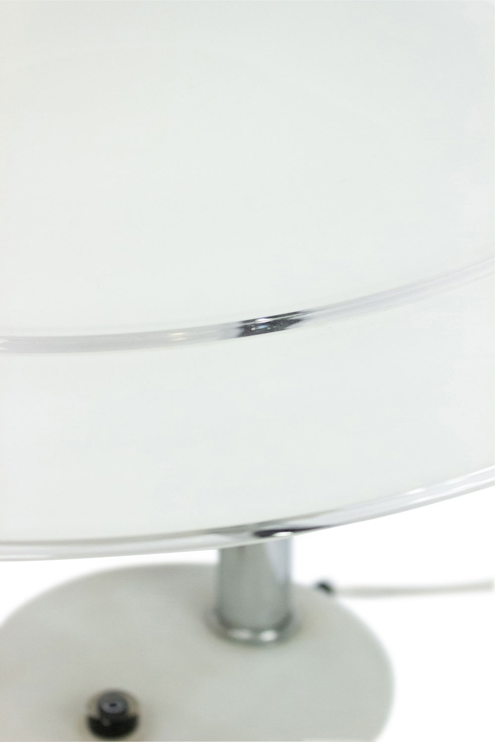 Italian Murano (circa 1986) table lamp with white glass base with a chrome cylindrical stem supporting an Incalmato white & clear banded shade (signed VISTOSI)