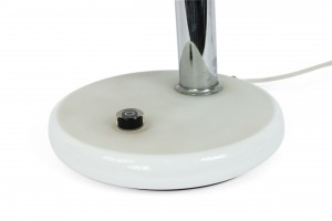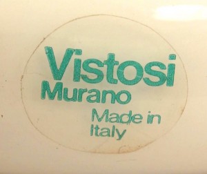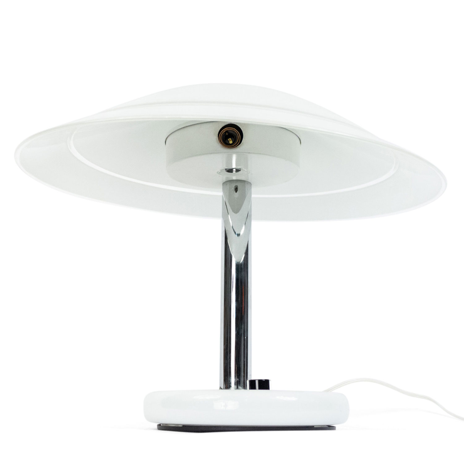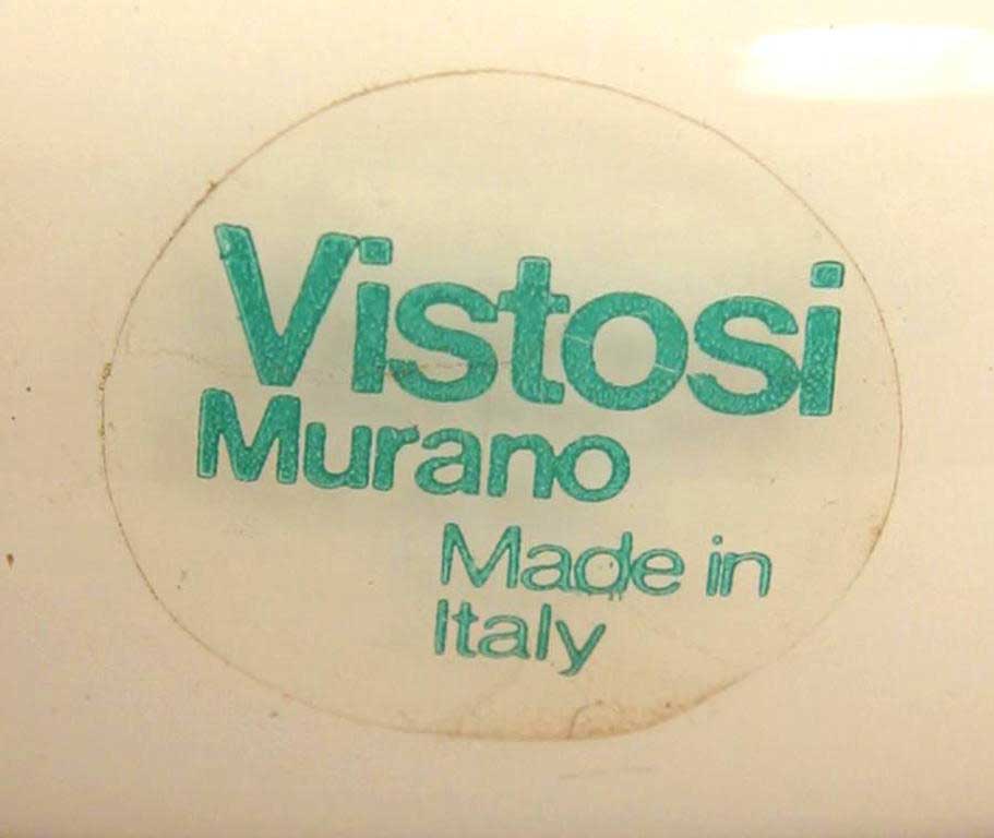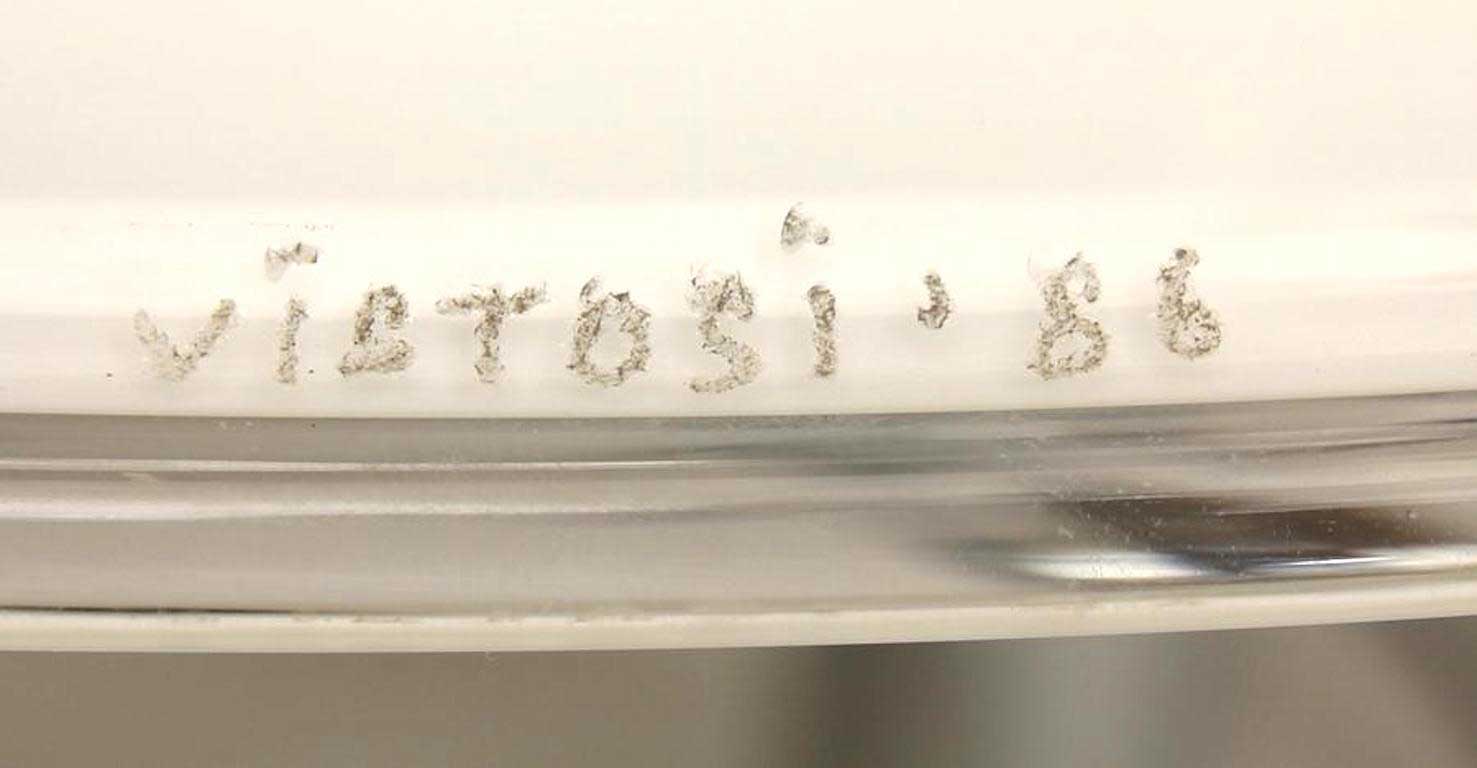 Italian Murano (circa 1986) table lamp with white glass base with a chrome cylindrical stem supporting an Incalmato white & clear banded shade (signed VISTOSI)
