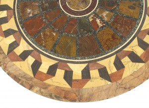 Italian Neo-Classic (18th Century) inlaid round pietra dura specimen marble top with geometric design supported on an iron pedestal base.