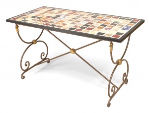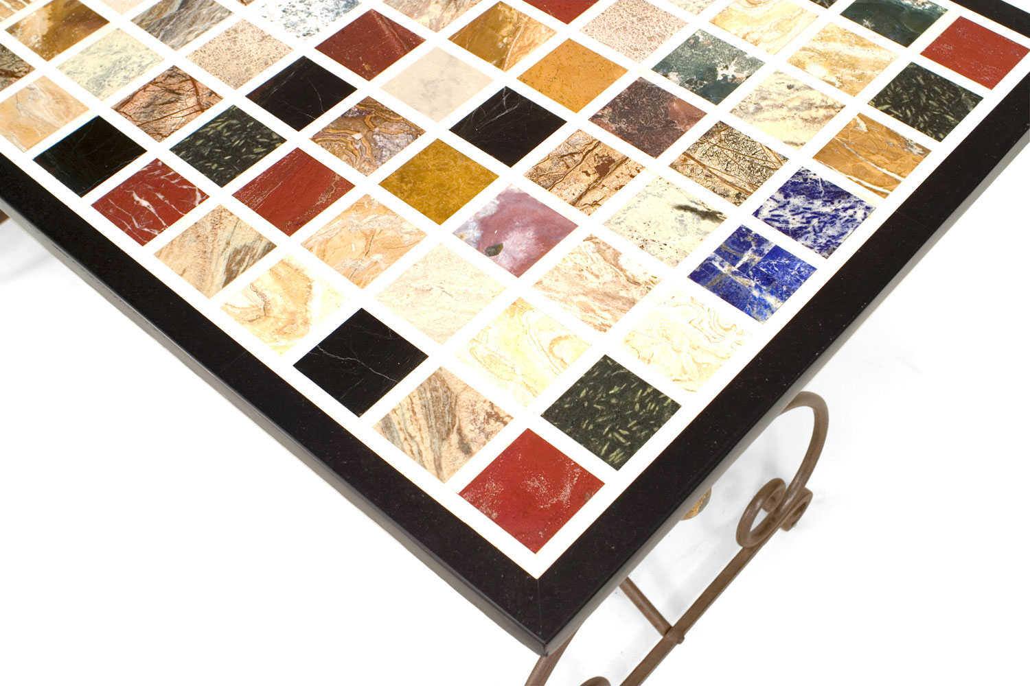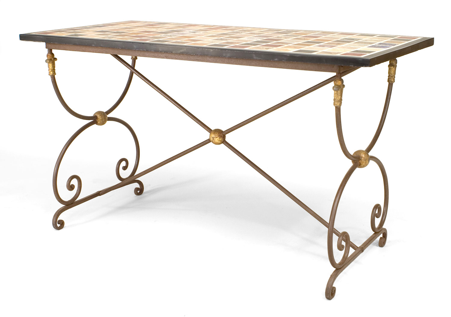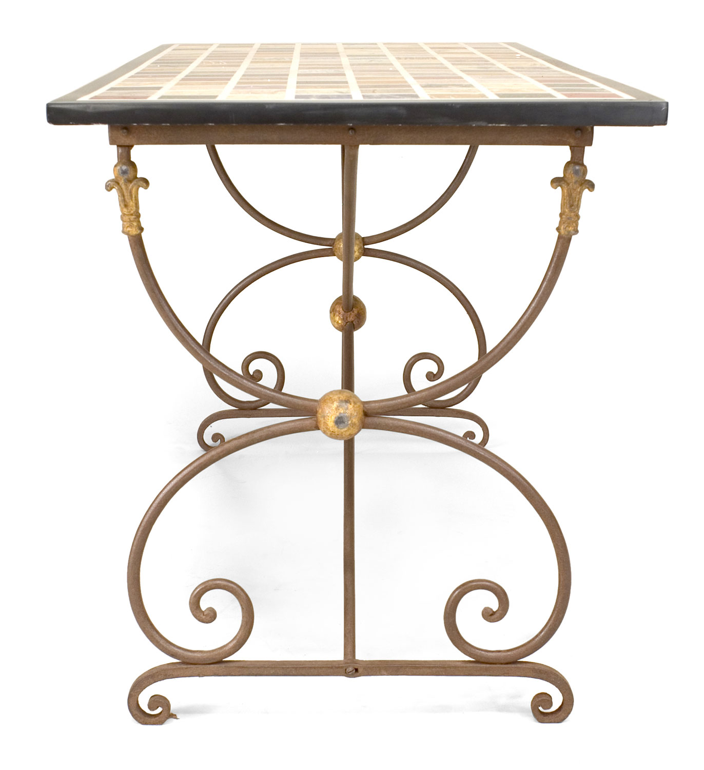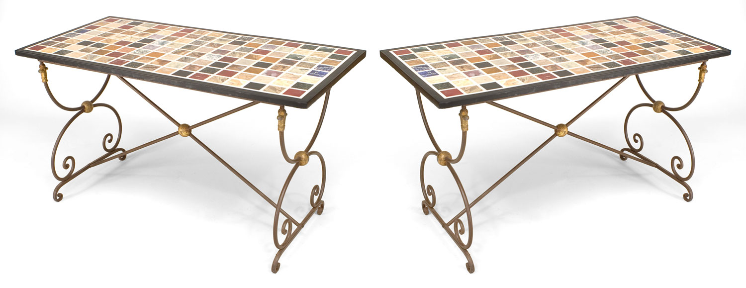 2 Italian Neo-classic-style (19/20th Century) steel rectangular end tables with double scroll design sides and "X" form stretcher with specimen marble tops. (PRICED EACH)