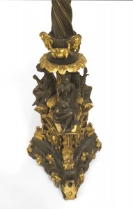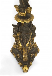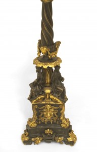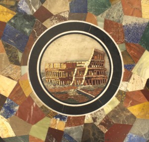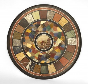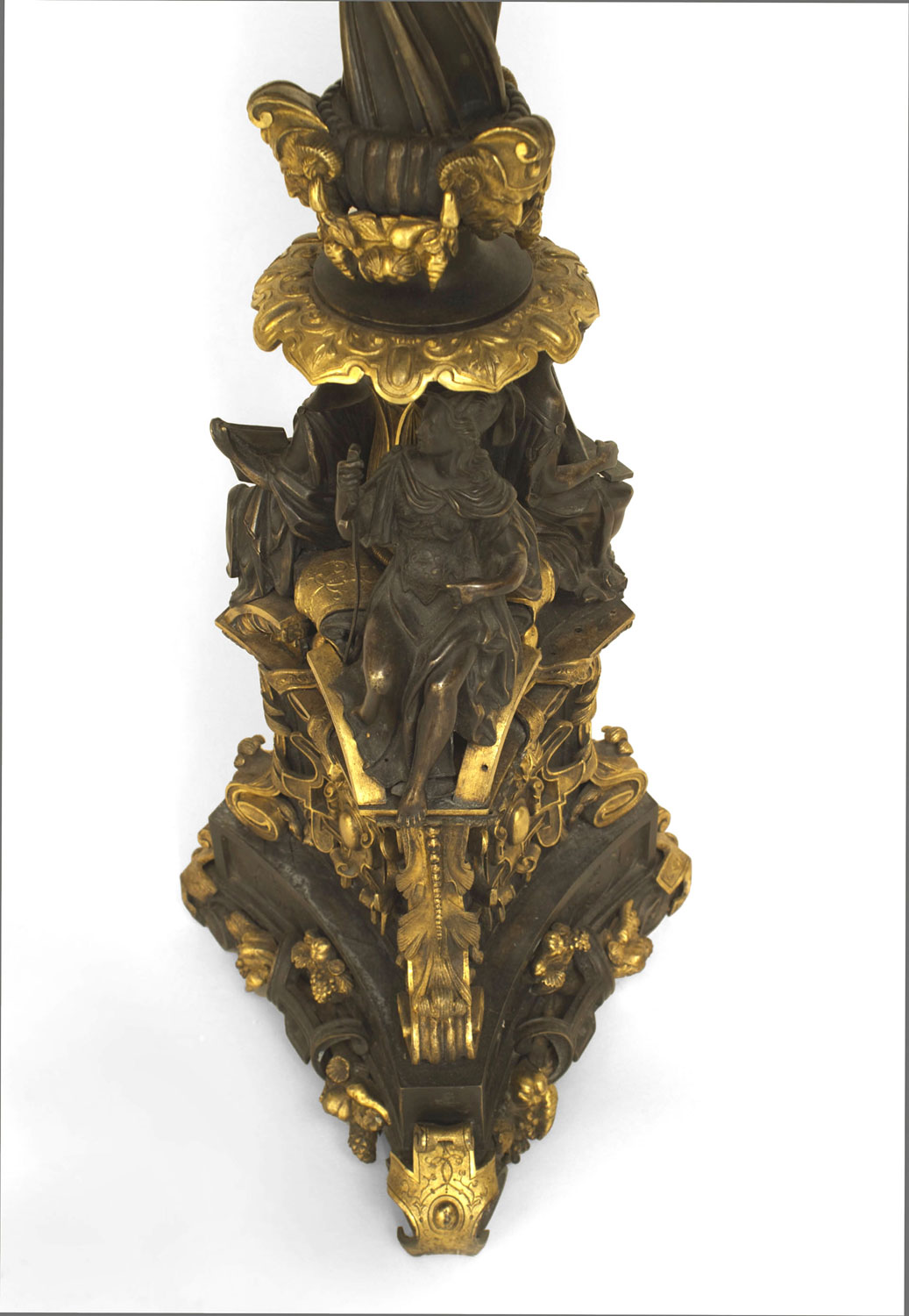Italian Neo-classic (Late 19th Century) round specimen marble and micro-mosaic centered top on a Renaissance Revival triangular shaped parcel gilt & patinated bronze base with figures an floral design.