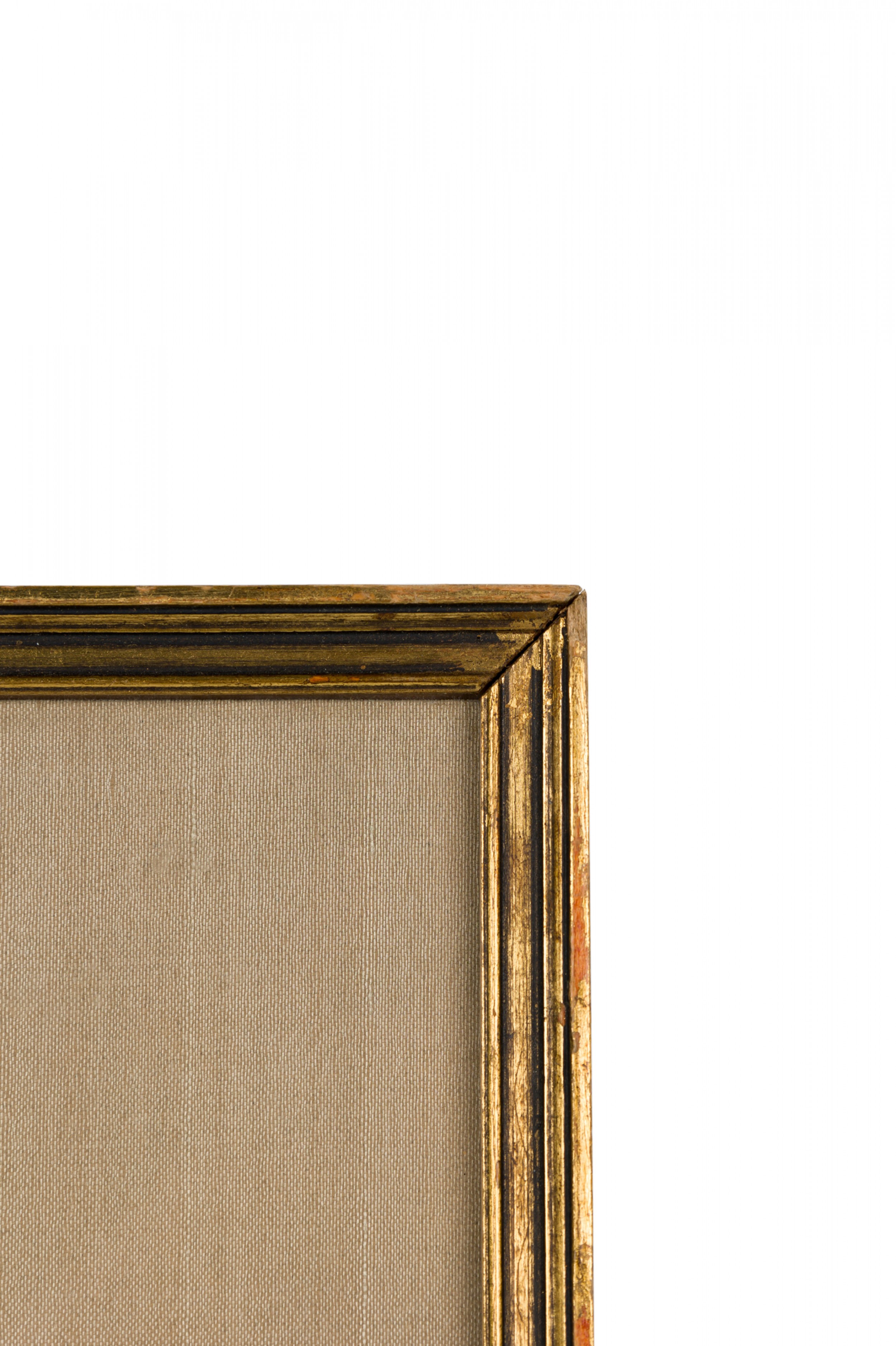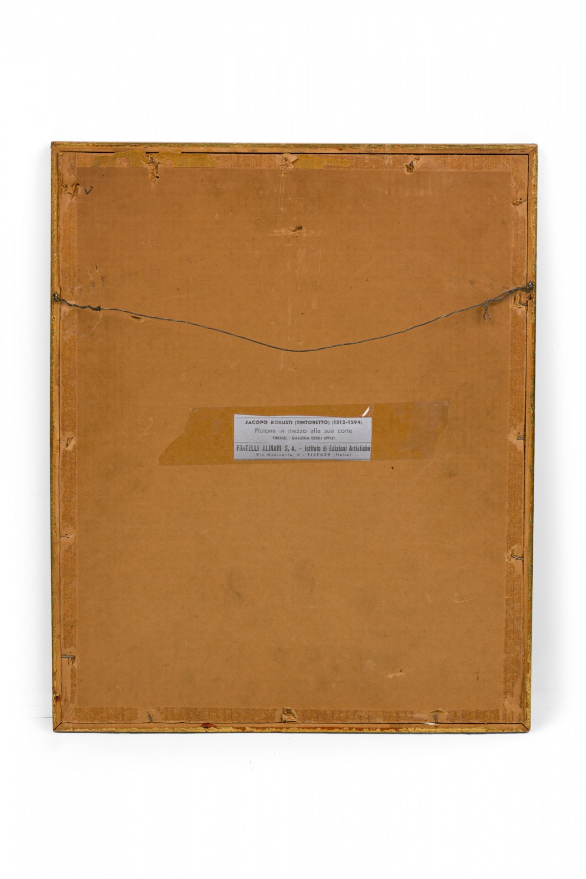 Italian Neo-Classic-style print of a realistically rendered bacchanalian crowd scene depicting a horned figure seated in a pensive position, writing notations at the upper center. The forefront figures are shaded for emphasis. Matted and framed in a parcel gilt painted wood frame. (Similar companion prints: NWL6739A-D)
