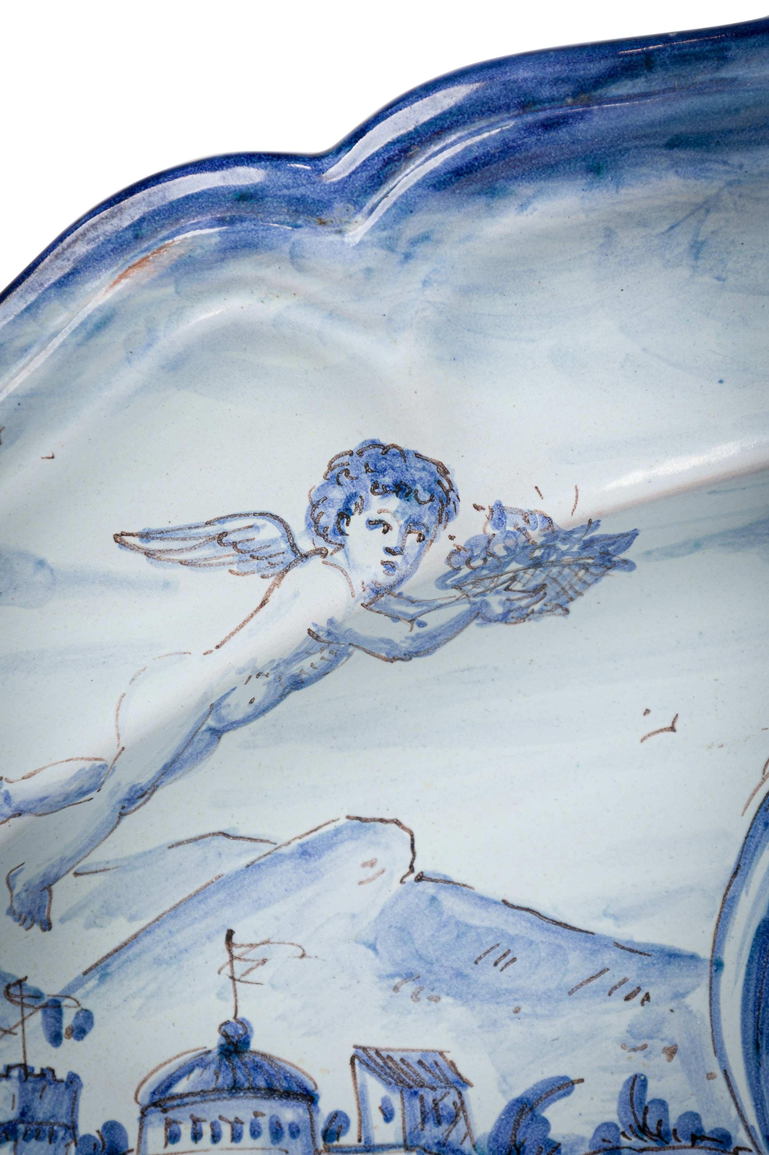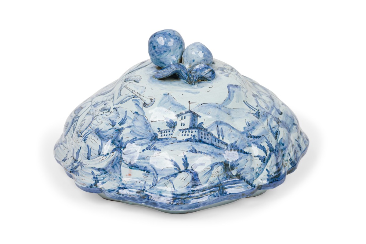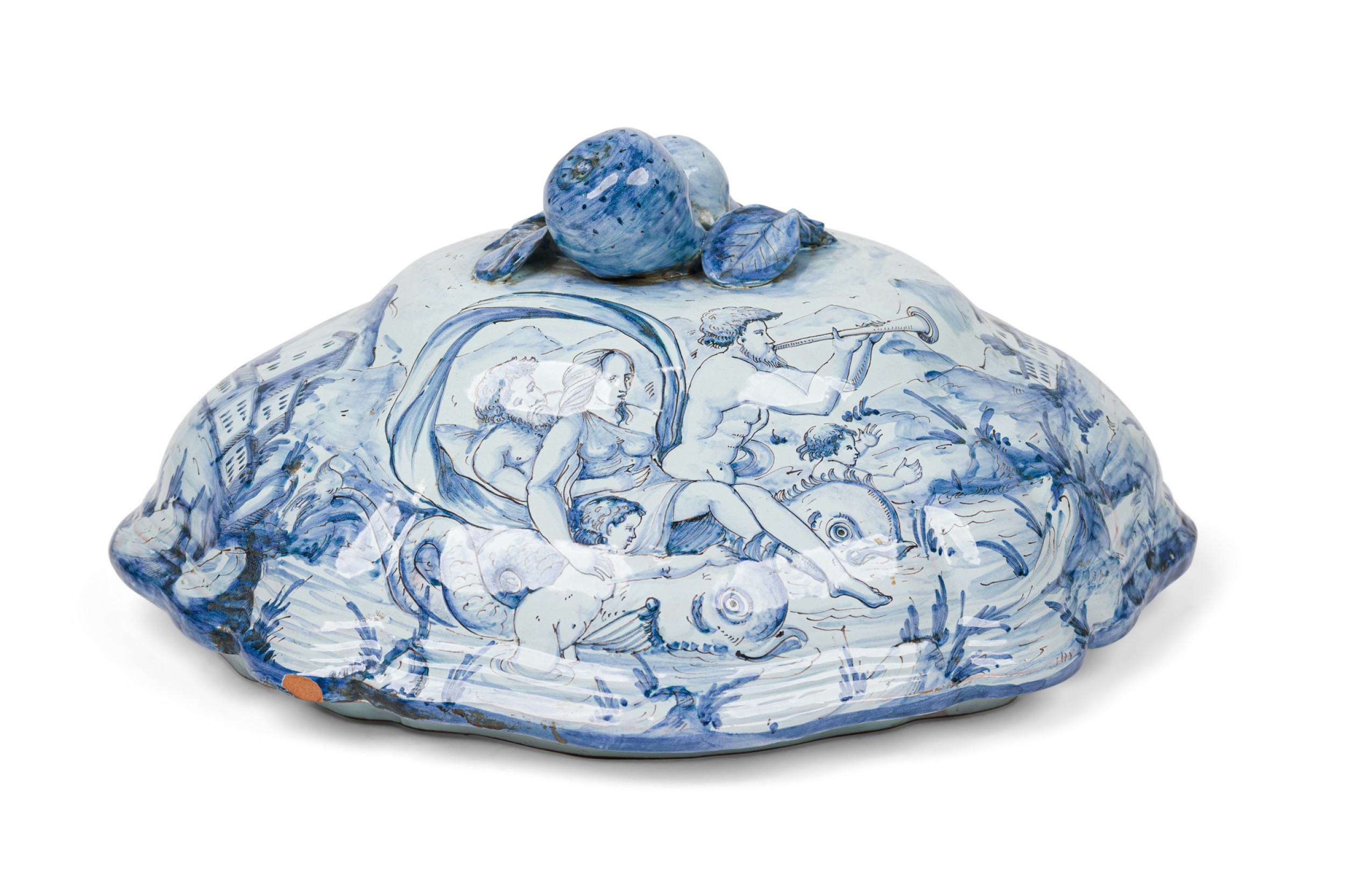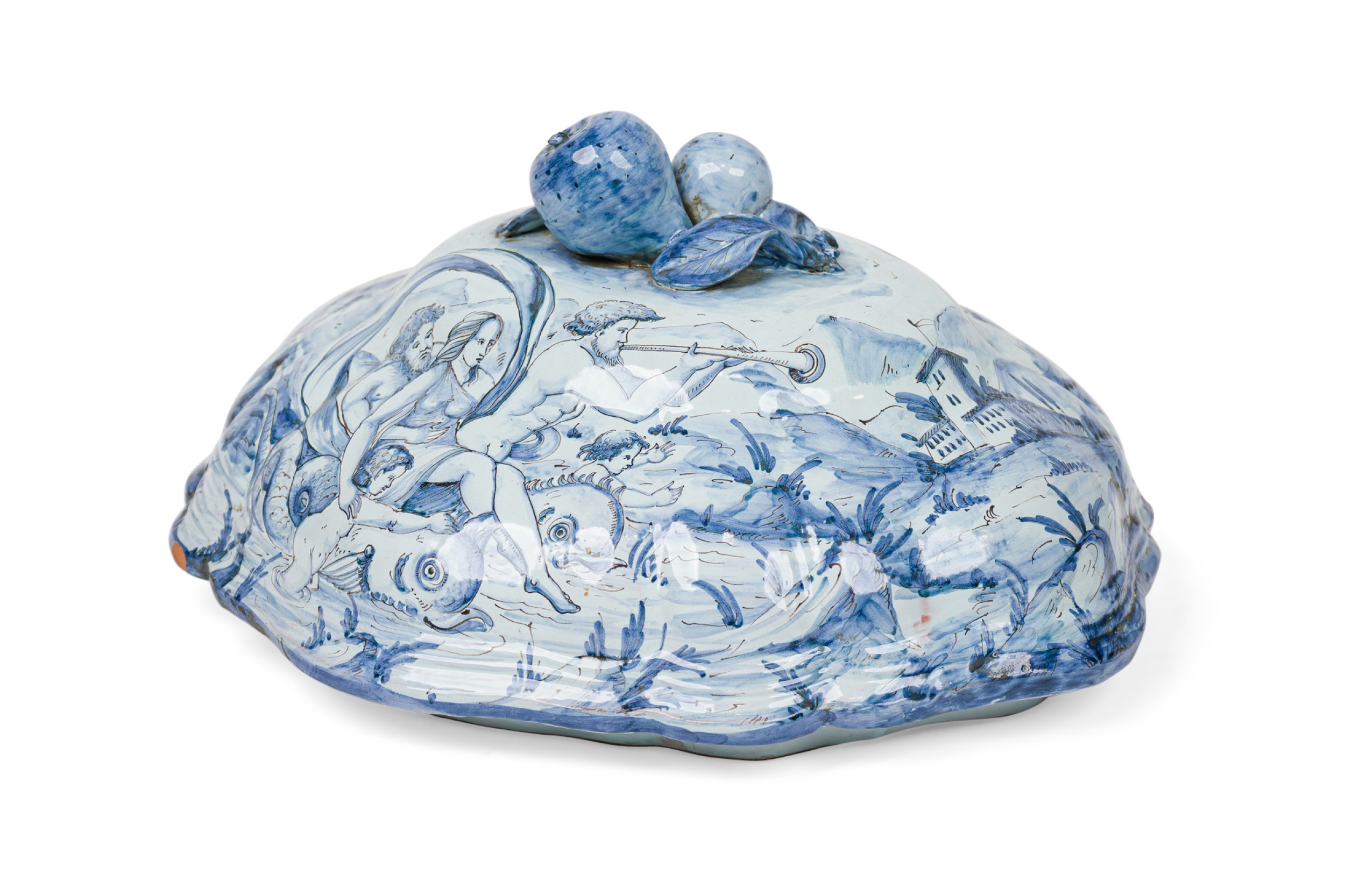 Italian (early 20th Century) Neo-Classical Style hand painted Albisola majolica lidded serving tray featuring scalloped edges depicting Venus and Neptune on a hippocampus with a putti spectating the scene from above as the central figure crowned surrounded by bucolic landscape and Italian medieval architectures crowned with a fruit like handle