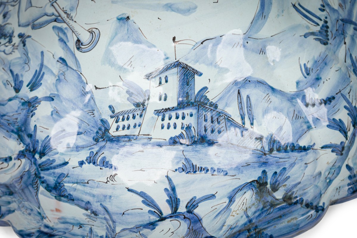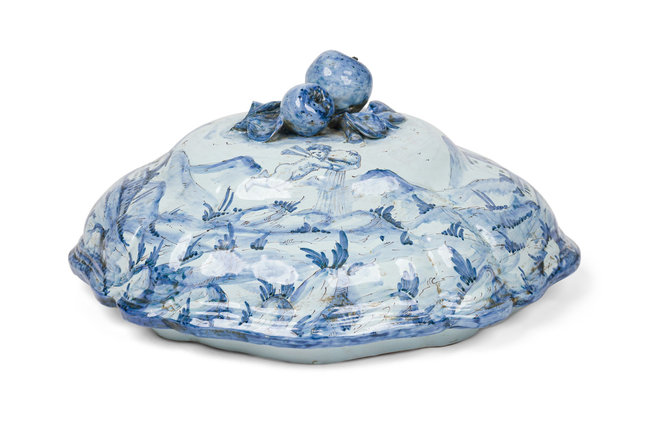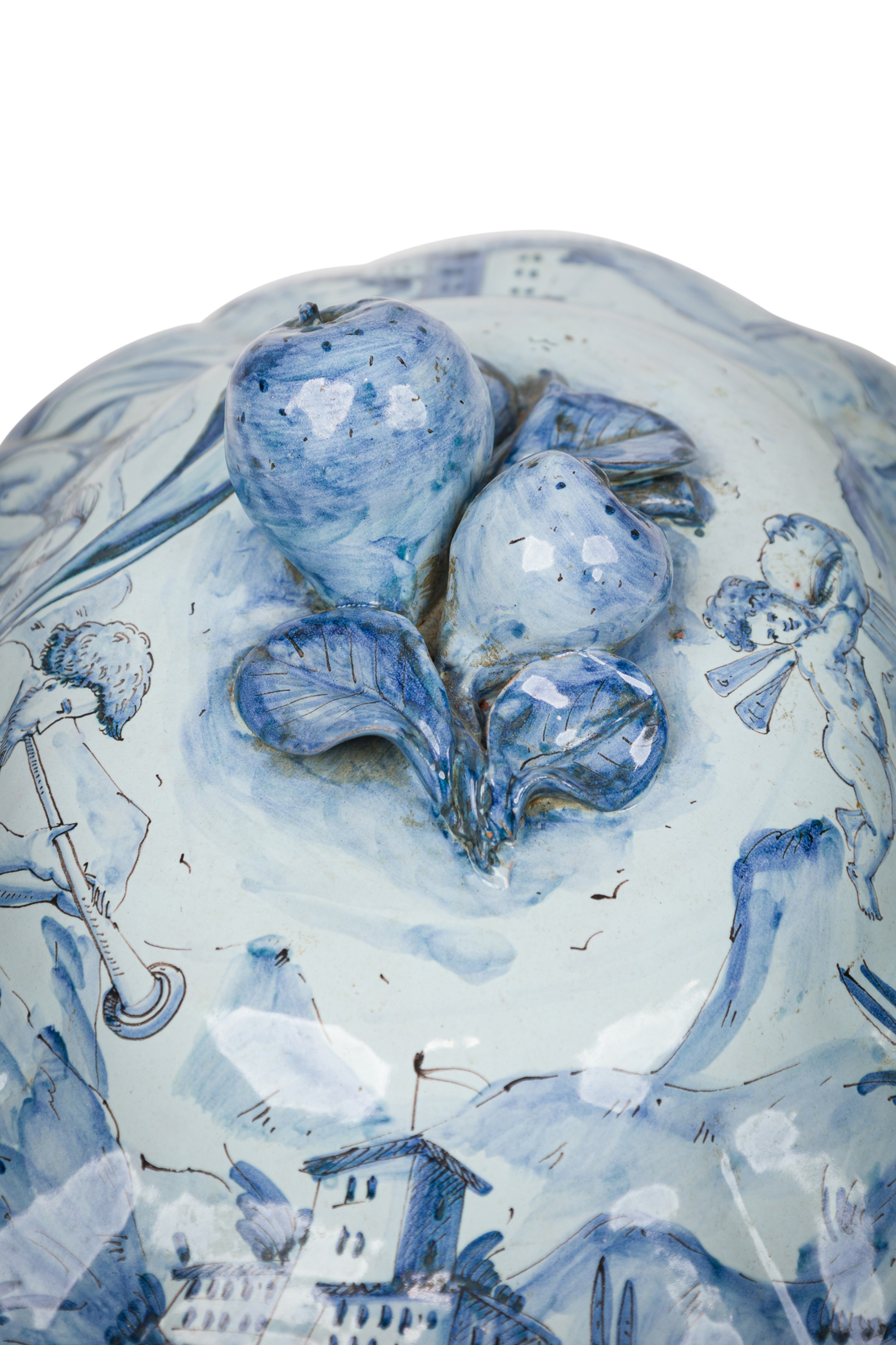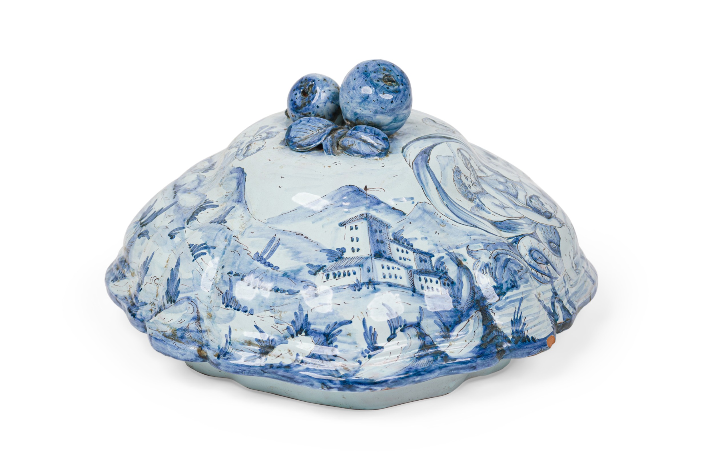 Italian (early 20th Century) Neo-Classical Style hand painted Albisola majolica lidded serving tray featuring scalloped edges depicting Venus and Neptune on a hippocampus with a putti spectating the scene from above as the central figure crowned surrounded by bucolic landscape and Italian medieval architectures crowned with a fruit like handle