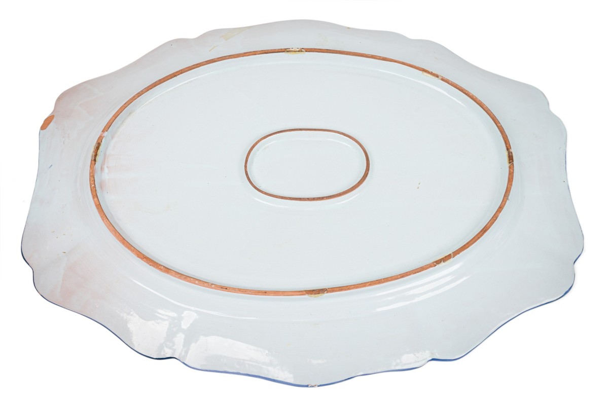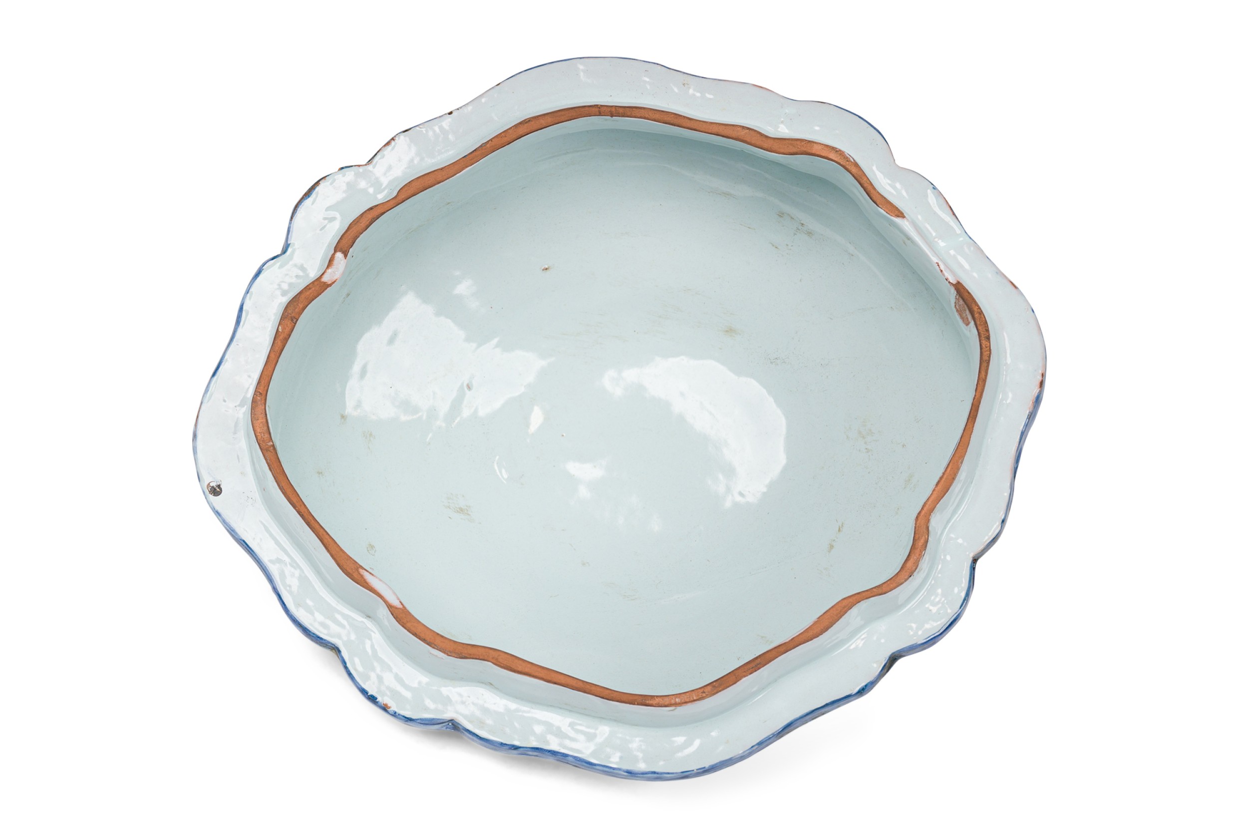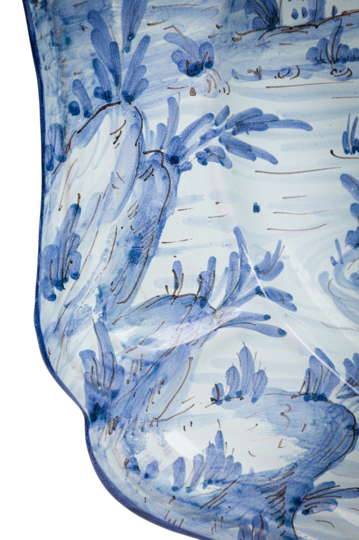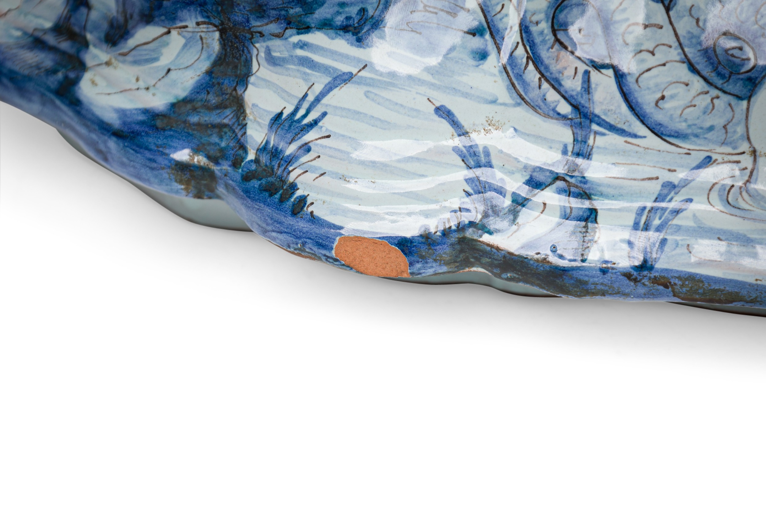 Italian (early 20th Century) Neo-Classical Style hand painted Albisola majolica lidded serving tray featuring scalloped edges depicting Venus and Neptune on a hippocampus with a putti spectating the scene from above as the central figure crowned surrounded by bucolic landscape and Italian medieval architectures crowned with a fruit like handle