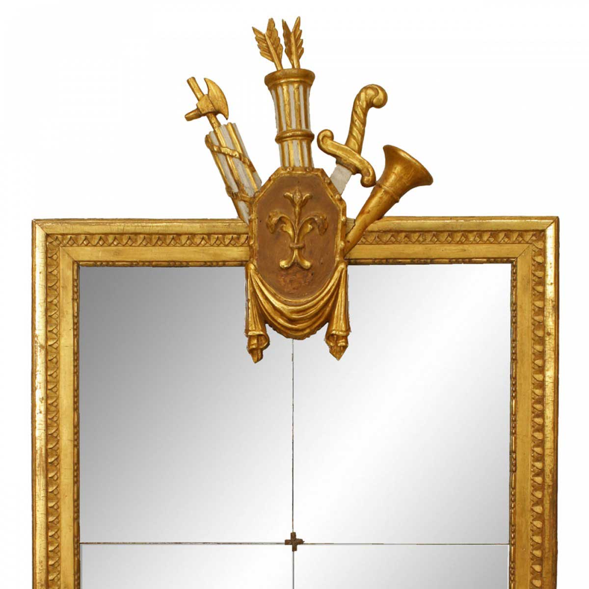 2 Italian Neoclassic (18/19th Century) gilt framed wall mirrors with four glass panels and a white painted and gilt trophy carved pediment with a fleur-de-lis design. (PRICED EACH)